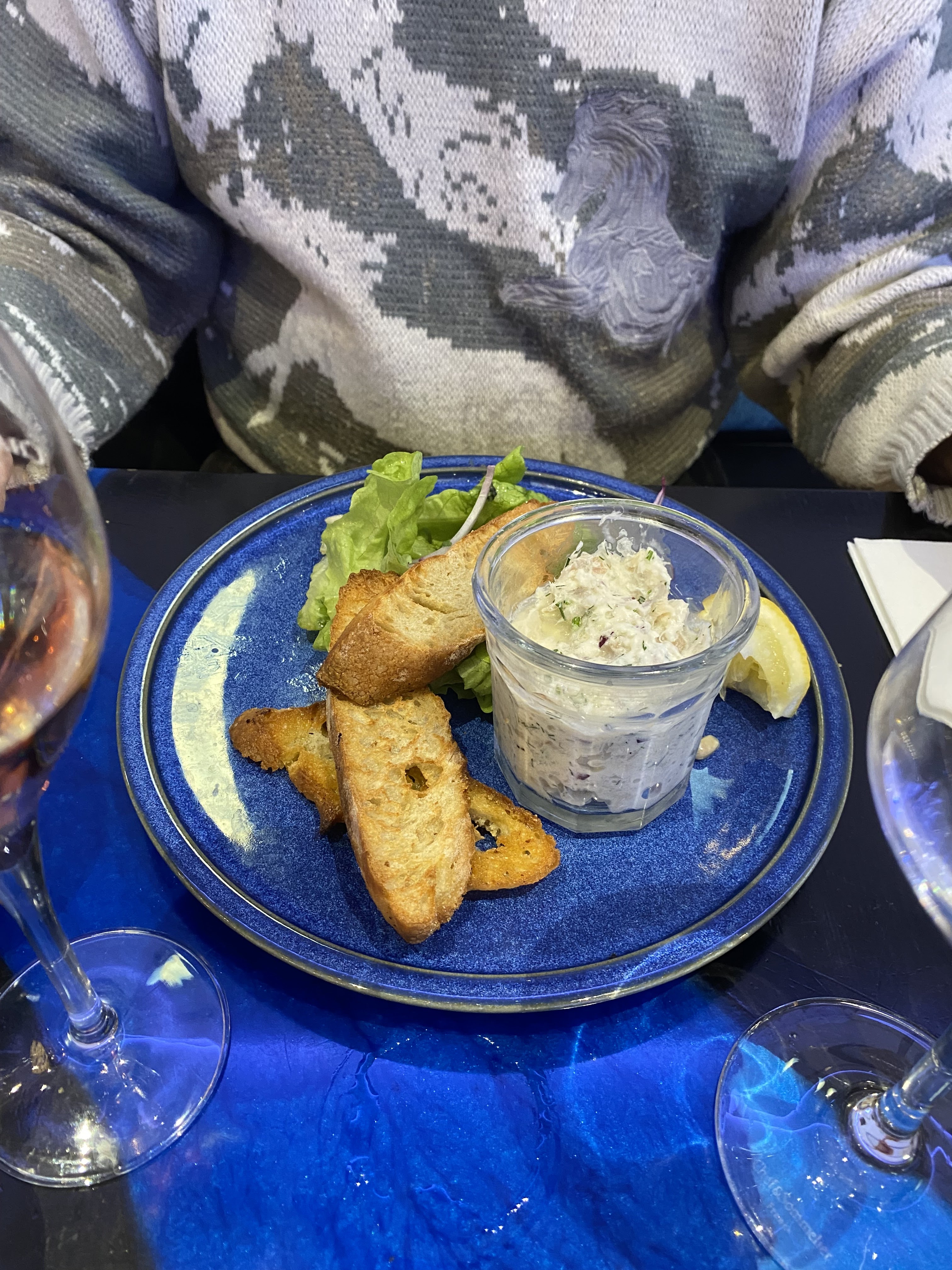 Repas en amoureux ce midi, franchement au top. Soupe et rilette de poisson en entrée, très bon et bien garnis. Calamar sauce vierge avec ses linguini, un pur régal. Je reviendrais sans hésiter pour ce plat. Pour Madame c’était Saumon aux herbes, également très bien cuit. Étant grand gourmand, les quantités étaient vraiment suffisante. On a eu du mal à finir le plat après l’entrée. La seule photo a été prise après avoir tapé dans l’assiette, gourmandise quand tu nous tiens.