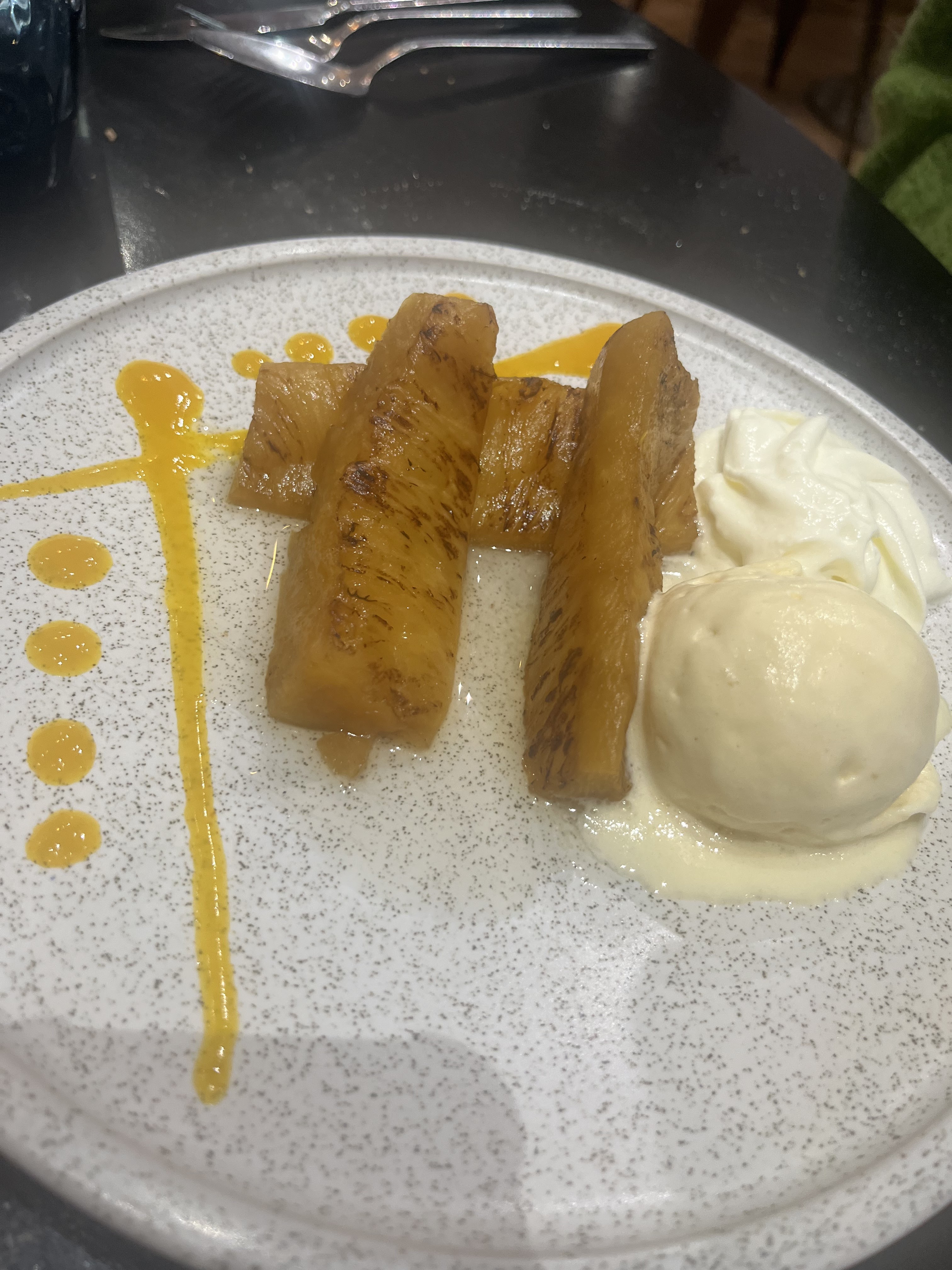 Nous étions 3. Nous avions pris un apéritif celui-ci a tardé à venir . Il a été servi en même tant que le plat principal. Le principe d'un apéritif c'est de le boire un peu avant le plat. Je crois ,.... J'avais pris un risotto au poulet . Il était accompagné d'un coulis de tomate, sur un risotto c'est étonnant mais pourquoi pas . Par contre il était très relevé du coup toutes mes papilles étaient en feu. Quand au dessert ne demandait pas un ananas roti . Victime de son succès . En conclusion une expérience que je ne réitère pas . Dommage