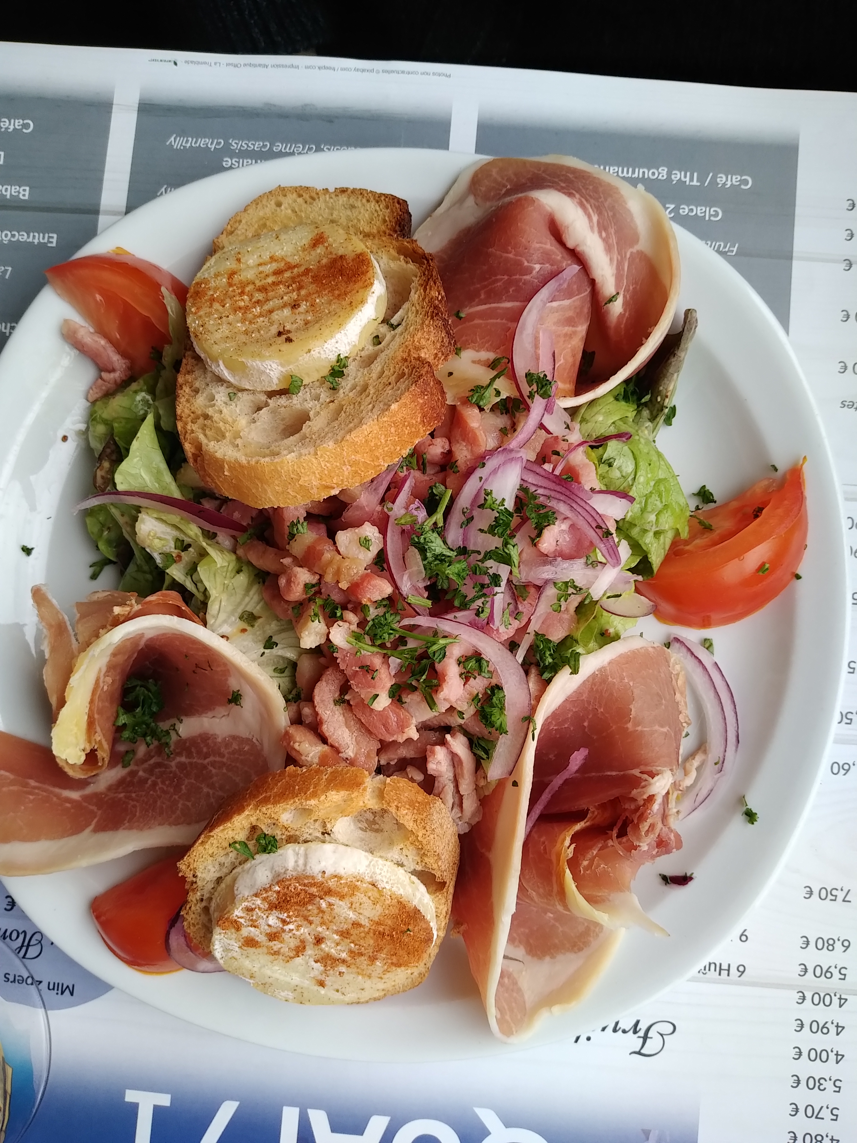 Voici la salade chèvre chaud ou plutôt de lardon. Le toasts de Chèvre cramé une honte