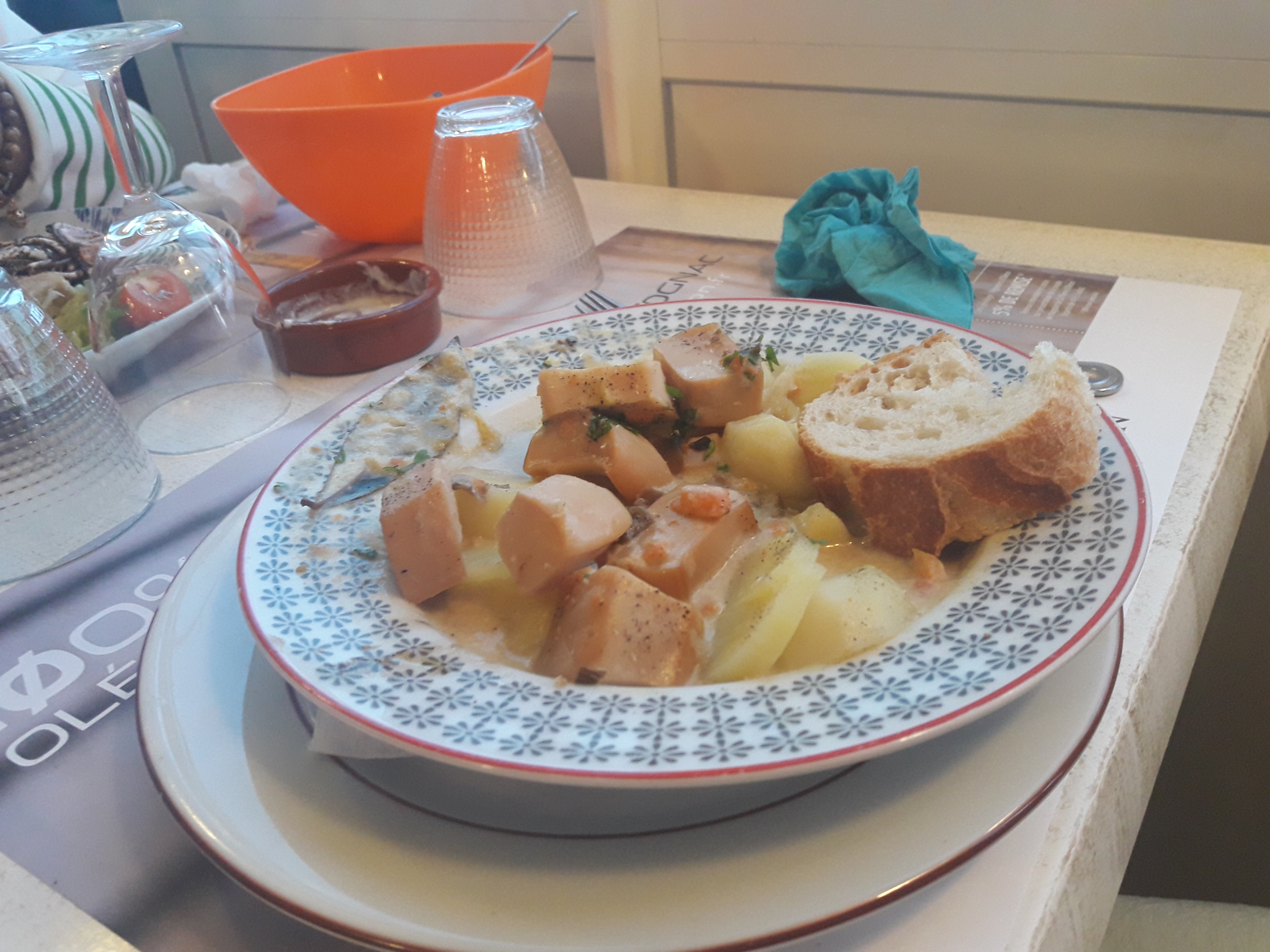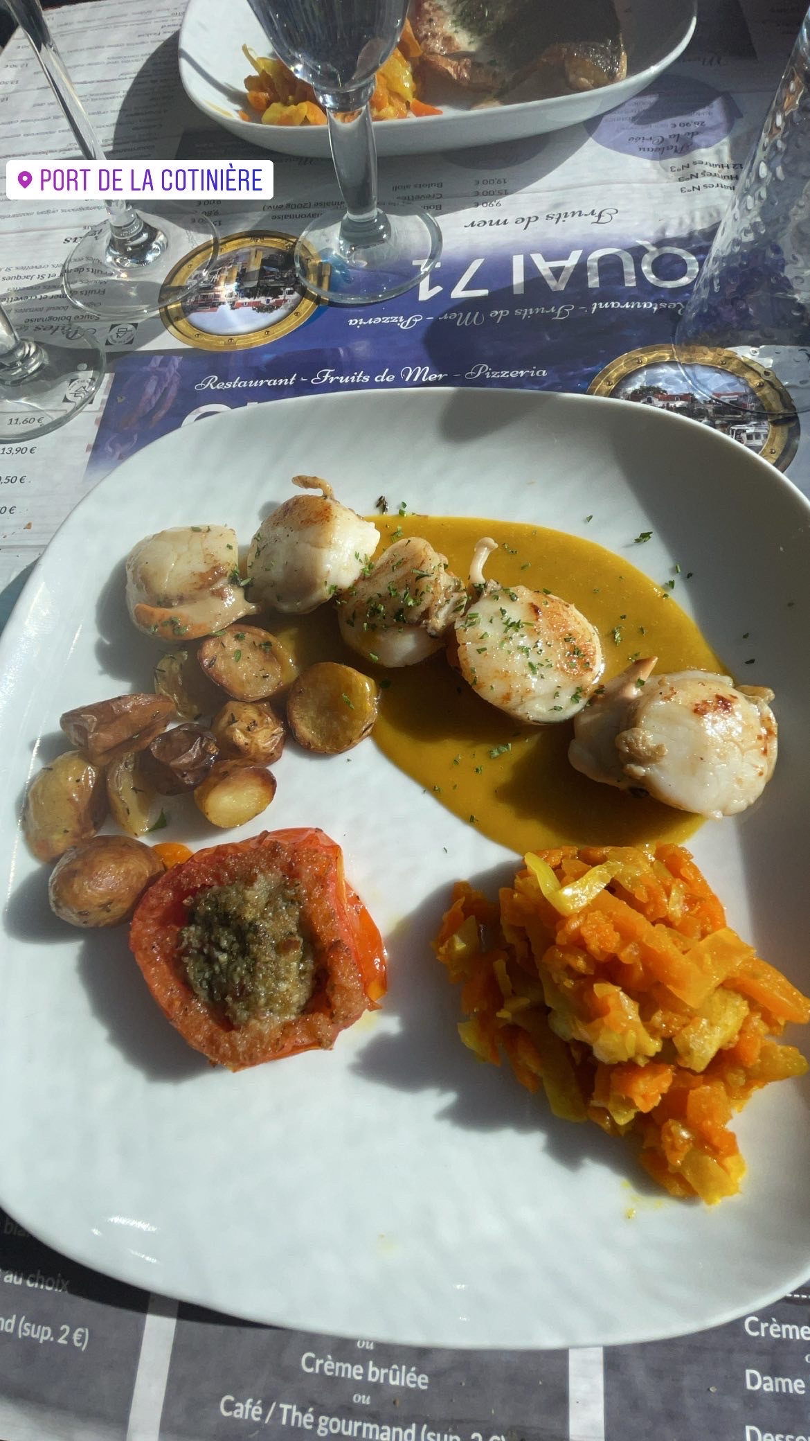 Très bon restaurant je le conseille j’étais placée sur la terrasse du haut avec vu sur le port et la mer le plat est très bon ( escalope de saumon à l’oseille ) c’est ce que j’ai pris mais j’ai goûter des moules elles sont également hyper bonne .