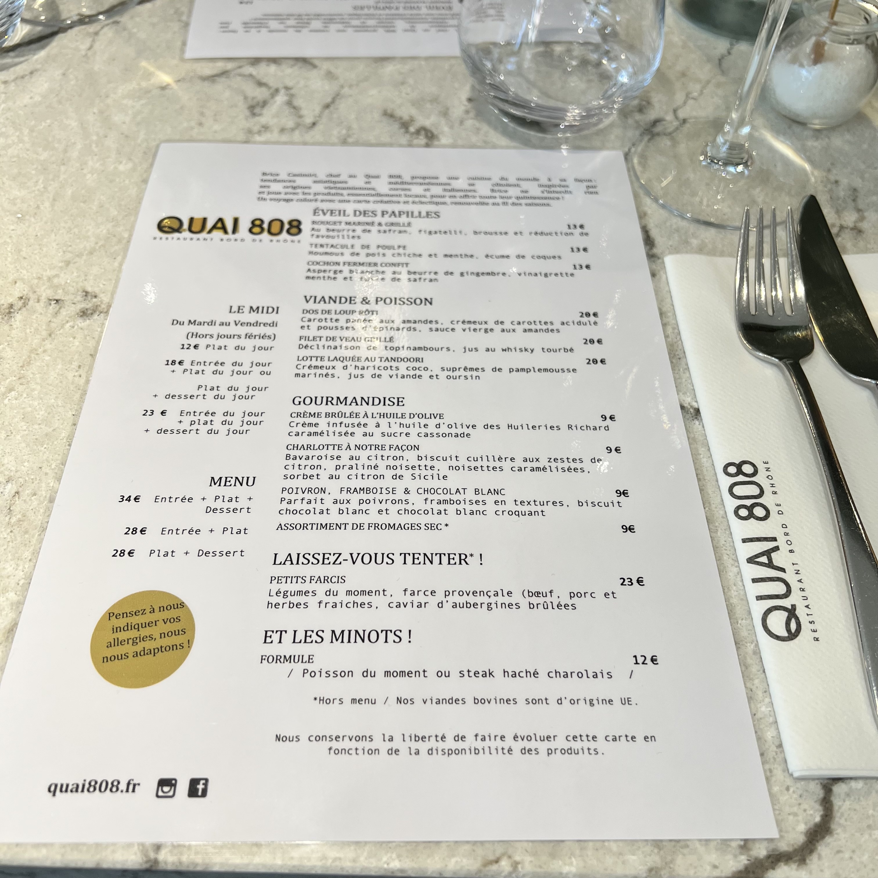 Le restaurant Quai 808 est situé au bord du Rhône à Guilherand Granges, à proximité du parking des brandons, soit 100m environ du pont Frédéric Mistral en direction de la piscine municipale. Le Chef vous propose une carte qui change tous les 15 jours, réalisée à partir de produits frais excessivement et locaux autant que possible. A la carte seront proposés 3 entrées, 3 plats et 3 desserts, ainsi qu'un burger spécial du Chef et un menu enfant. Les formules et leurs prix varies en semaine et week end. Notons qu'ils est possible de venir prendre un brunch le dimanche matin. L'accueil et le service sont de très bonne qualité. Quant aux plats, ils sont tout simplement délicieux, originaux et surprenant. Assurément une table où il est agréable de découvrir ou revenir.