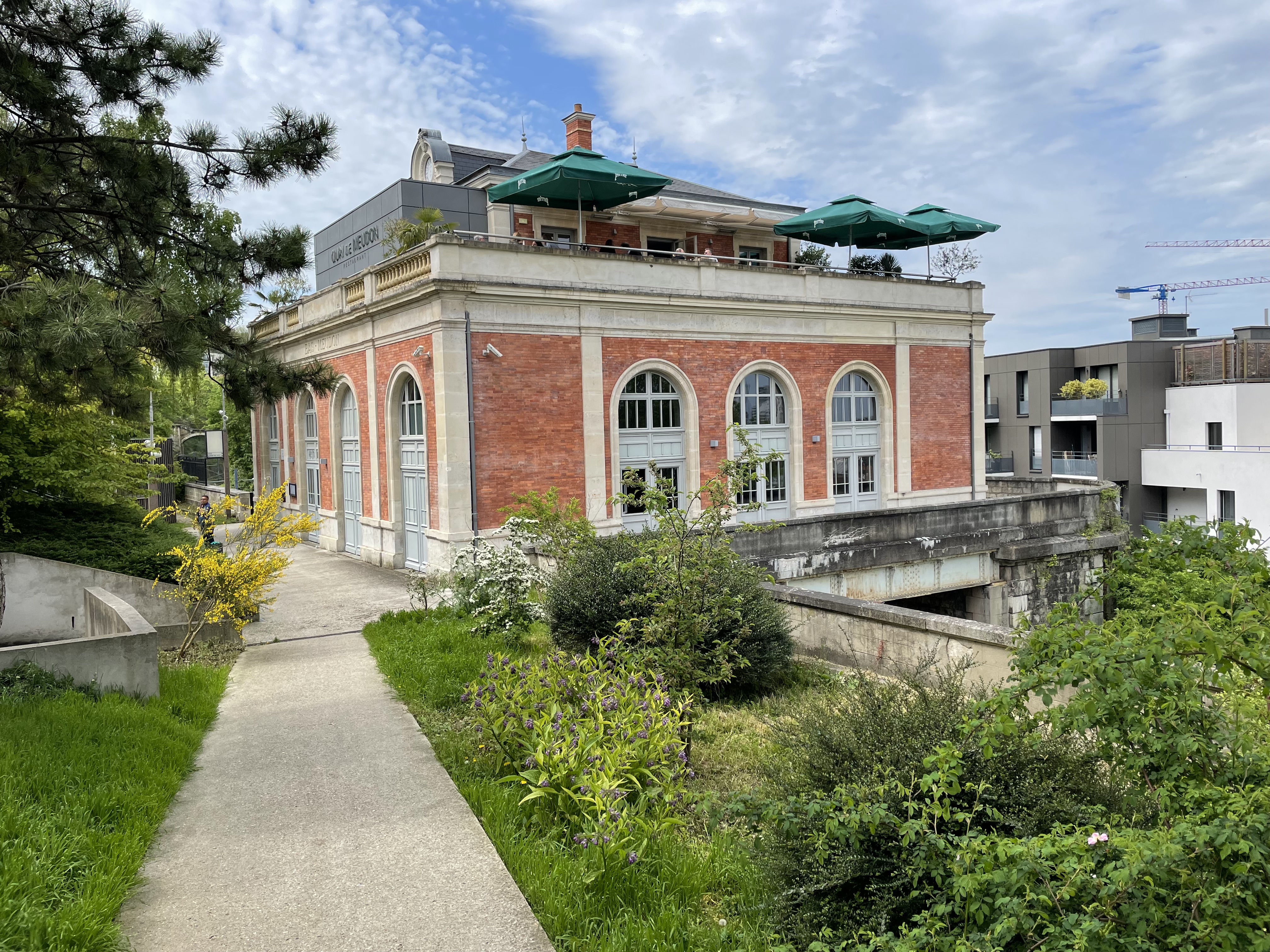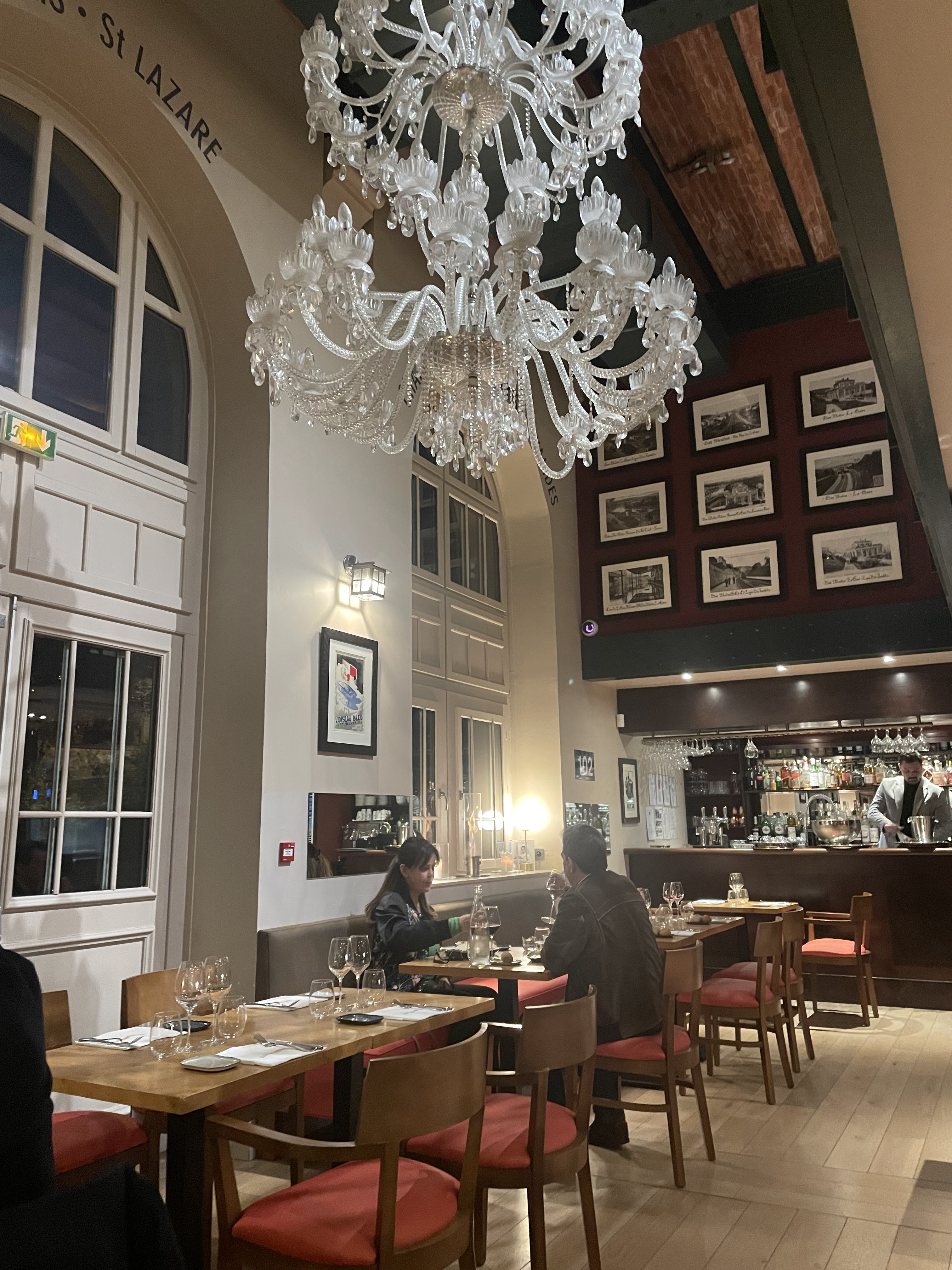 Une ancienne gare à cheval au-dessus du tram. L’entrée du restaurant est à la sortie de la station. Le cadre intérieur réussi garde l’esprit : colonnes métalliques, panneaux SNCF vintage, quelques banquettes… Menu déjeuner sur la carte, mais pas en ce dimanche midi. Choisi le plus original dans l’entrée et le plat : cromesquis d’agneau et omble chevalier à la plancha. Un petit déficit en épices sur le premier ? C’est vraiment histoire de dire quelque chose, parce qu’en bouche il faut avouer que le côté gourmand gagne petit à petit le palais. Saveurs simples mais persévérantes. Assiettes vidées ! Bon choix de verres sur une carte des vins qui se défend. La serveuse était souriante et très disponible. On s’est enquis à mi-parcours si tout allait bien. Bref, c’est bien agréable. Prévoir une petite attente. La terrasse avec vue semble être un bon plan en saison.
