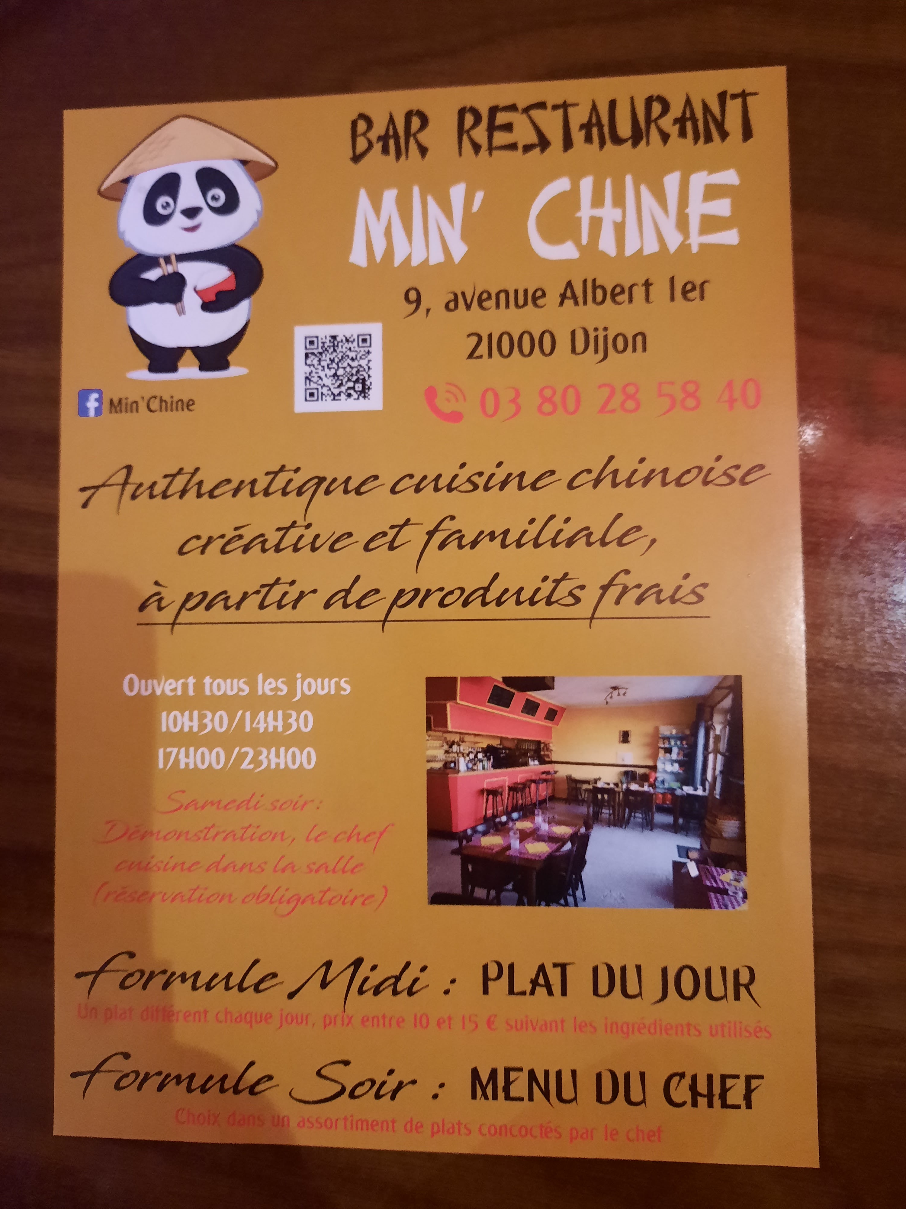 ´Nous avons dîné hier dans ce très agréable restaurant. Je ne laisse jamais de commentaire.. mais l’expérience a été si sympa que je me dis qu’il faut soutenir le Min’chine!!( même si au vu des commentaires il sait convaincre et se faire apprécier !!! Petit restau derrière la gare, ambiance bar de quartier. Le patron est adorable, la cuisine y est très fine. Pas de carte… deux trois entrées, deux trois plats qui varient chaque jour! Une cuisine chinoise familiale et vraiment traditionnelle! Loin des buffets à volonté de décongelés !! Nous y avons découvert de nouvelles saveurs et le patron qui est aussi le chef nous a gentiment et avec beaucoup d’humour, accompagné avec des anecdotes et des explications sur sa cuisine et la Chine!! Une très agréable soirée! Si vous voulez vraiment voyager et redécouvrir la cuisine chinoise, foncez!! C’est clairement devenu notre « petit restau chinois » favori sur Dijon et ses alentours!!!
