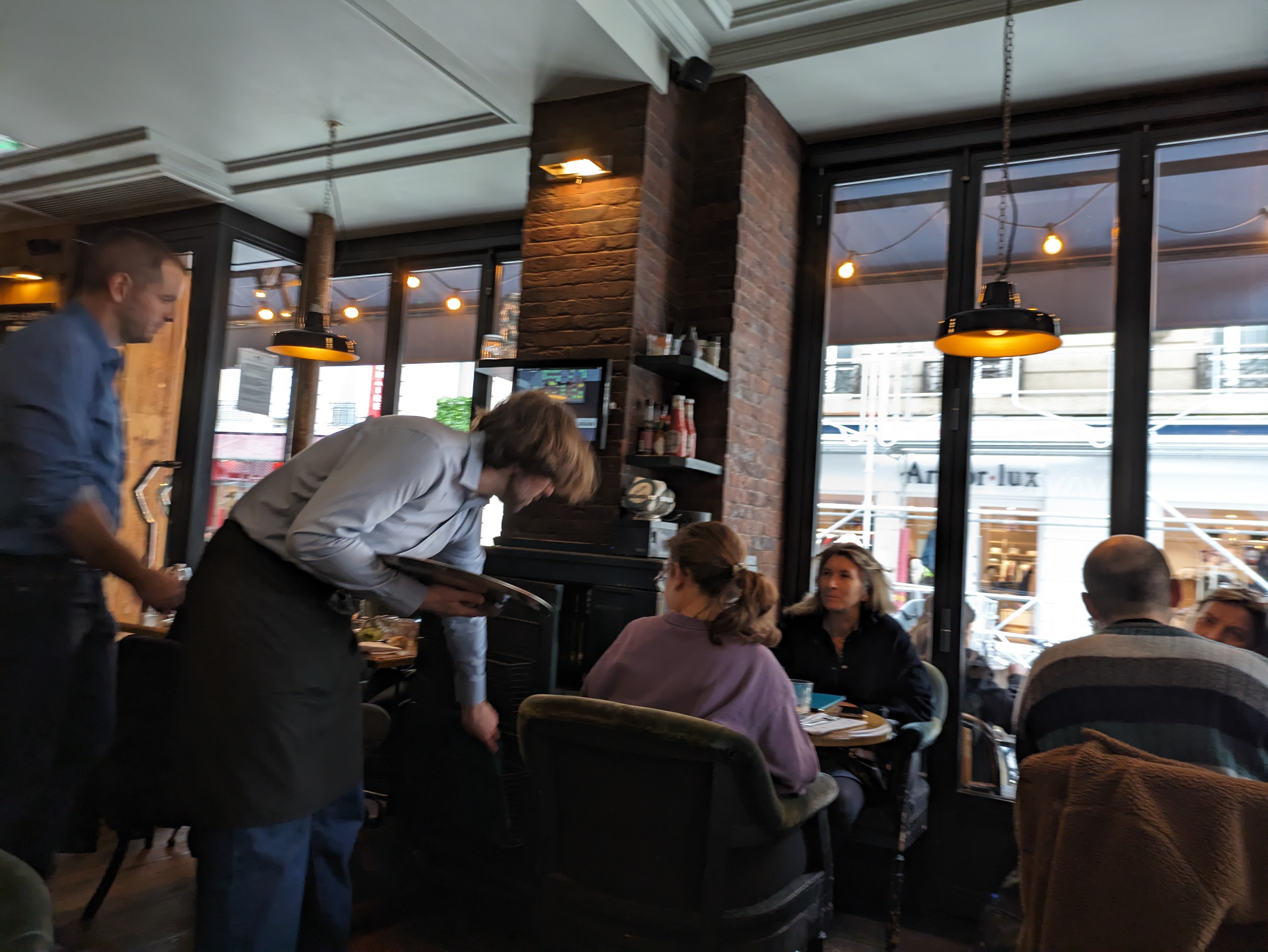 Bonne ambiance et serveurs accueillants, aimables et efficaces, ce qui est n'est pas toujours le cas dans les cafés parisiens.