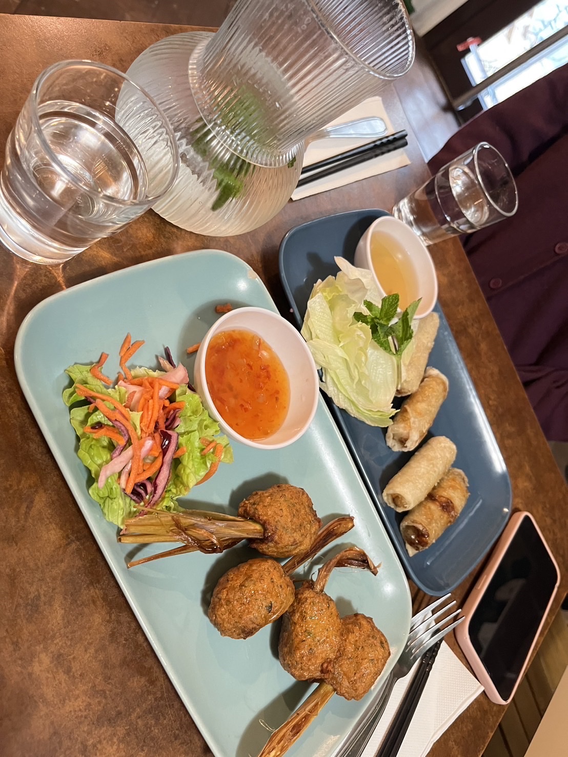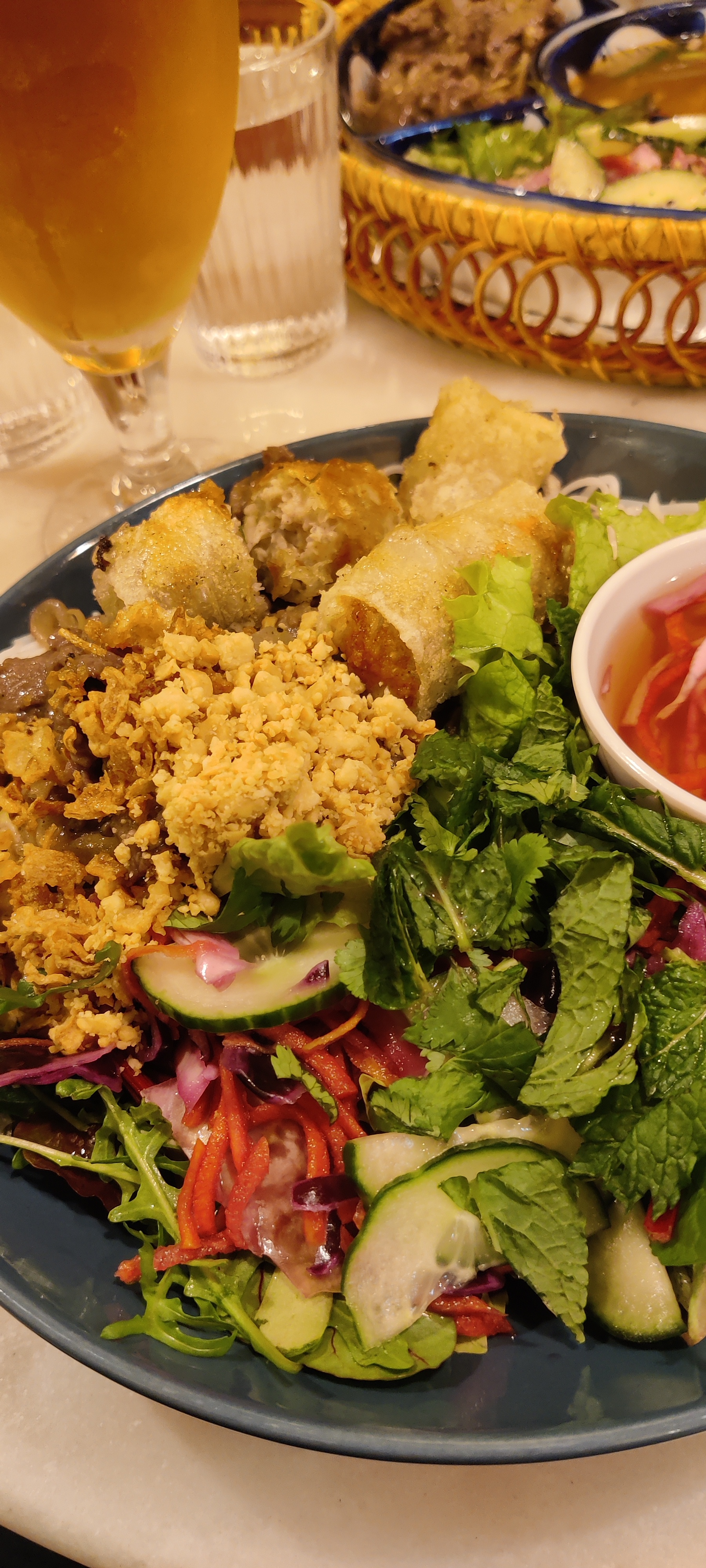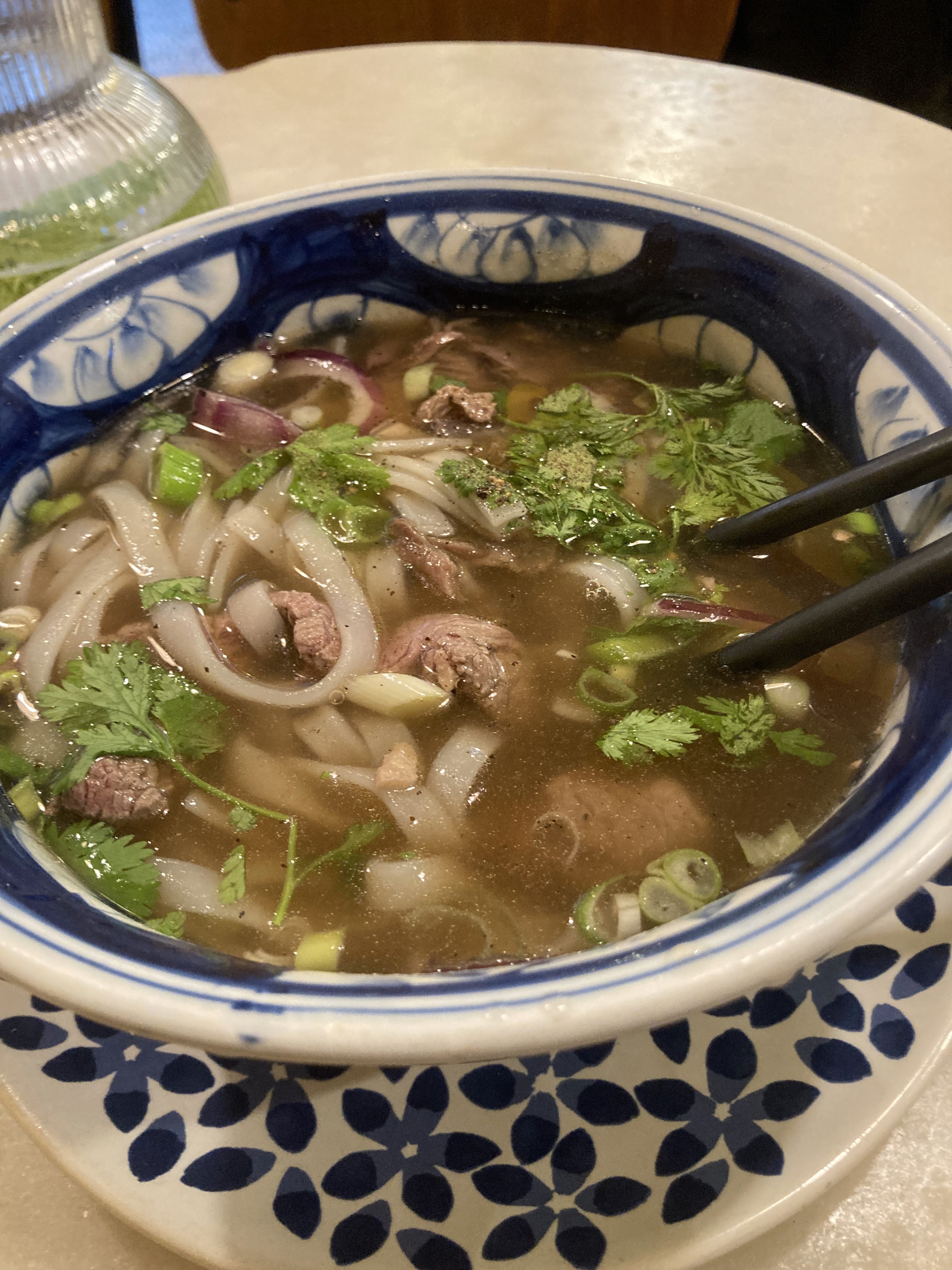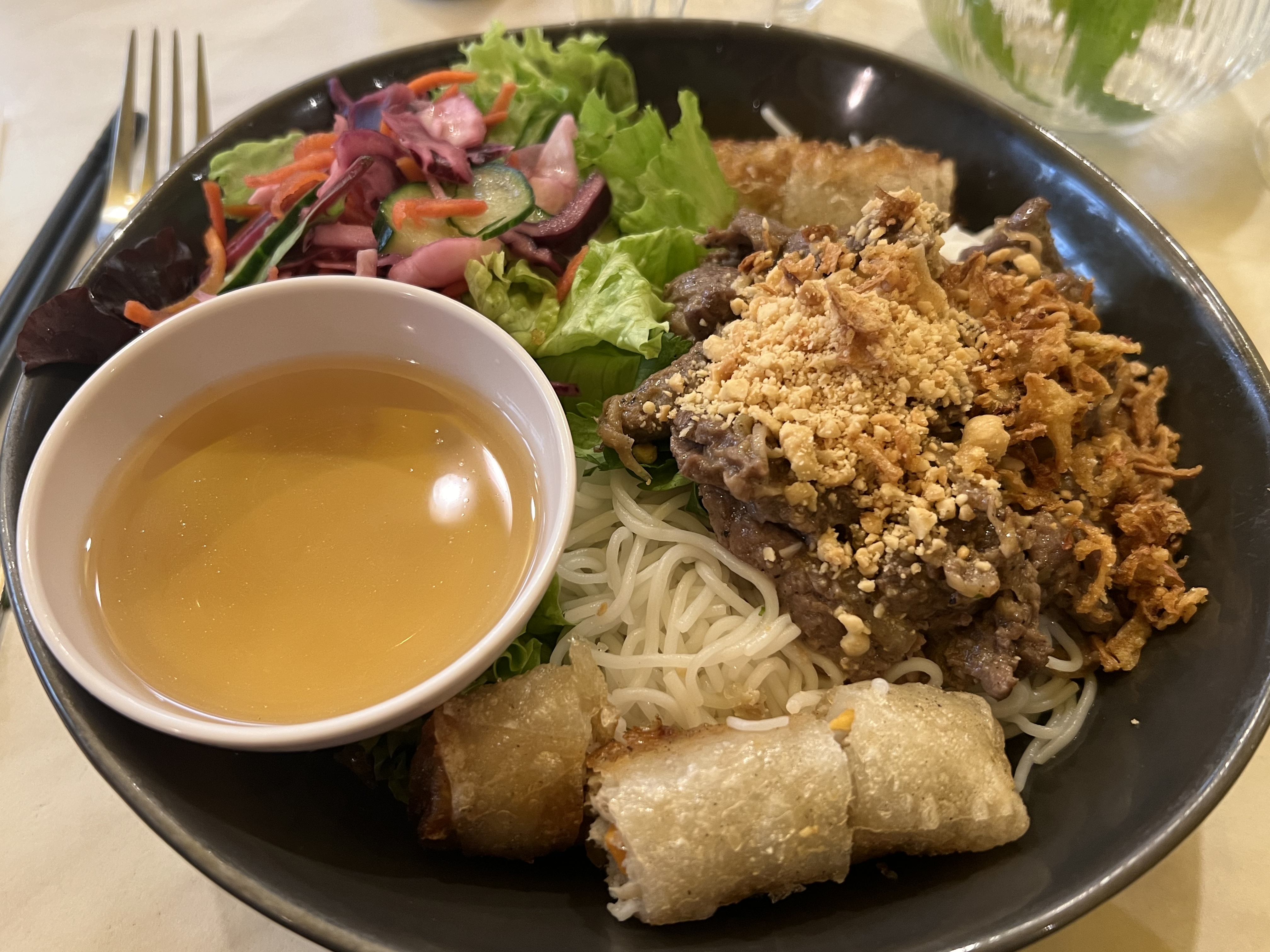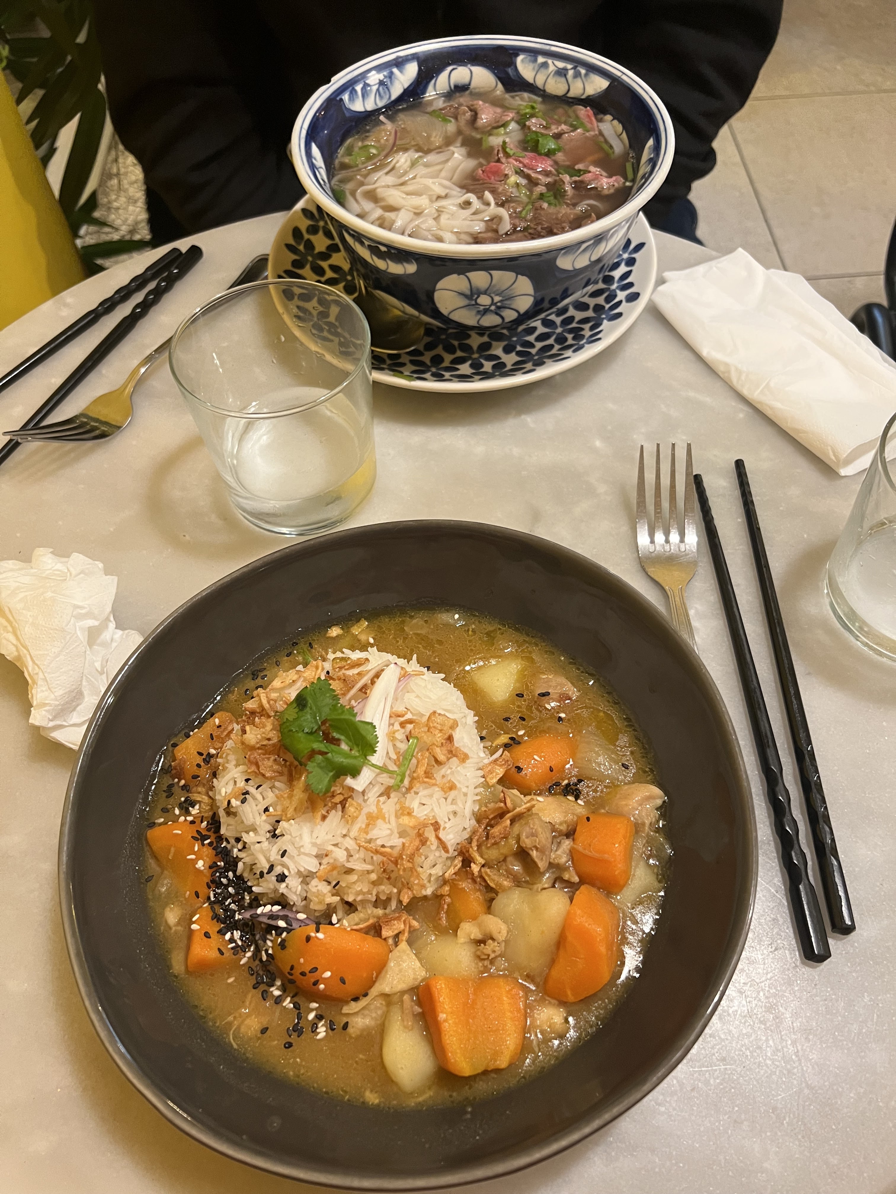 Très bons plats vietnamiens. On a eu le poisson grillé à la citronnelle mais j'ai oublié de prendre une photo... il était incroyablement juicy 🤤 Le pho était super bon aussi, spécifiquement la sauce ! Et pour le dessert, on a pris le mango sticky rice 🥭 Ça faisait tellement longtemps que j'en ai goûté. Le riz était chaud et pas trop sucré 🥰 J'imagine que c'est par qu'ils se sont installés ici y a pas longtemps, mais la gestion du resto était un peu le bazar 😅 on a pas attendu longtemps mais il y avait souvent des serveurs en train de faire des aller-retours partout. Sinon, il y a pas énormément de place dans le resto mais il me semblait pas que la file d'attente était très longue.