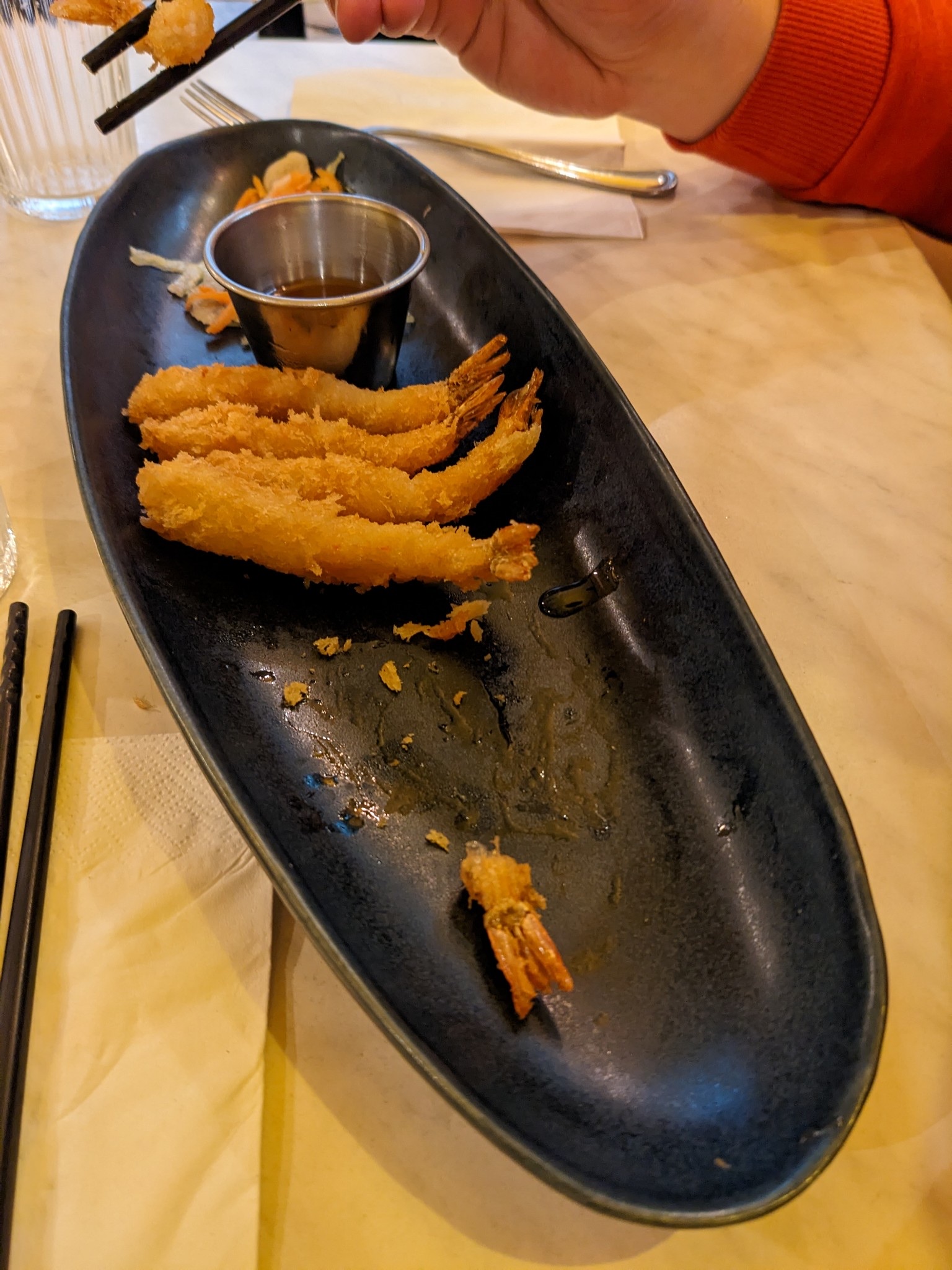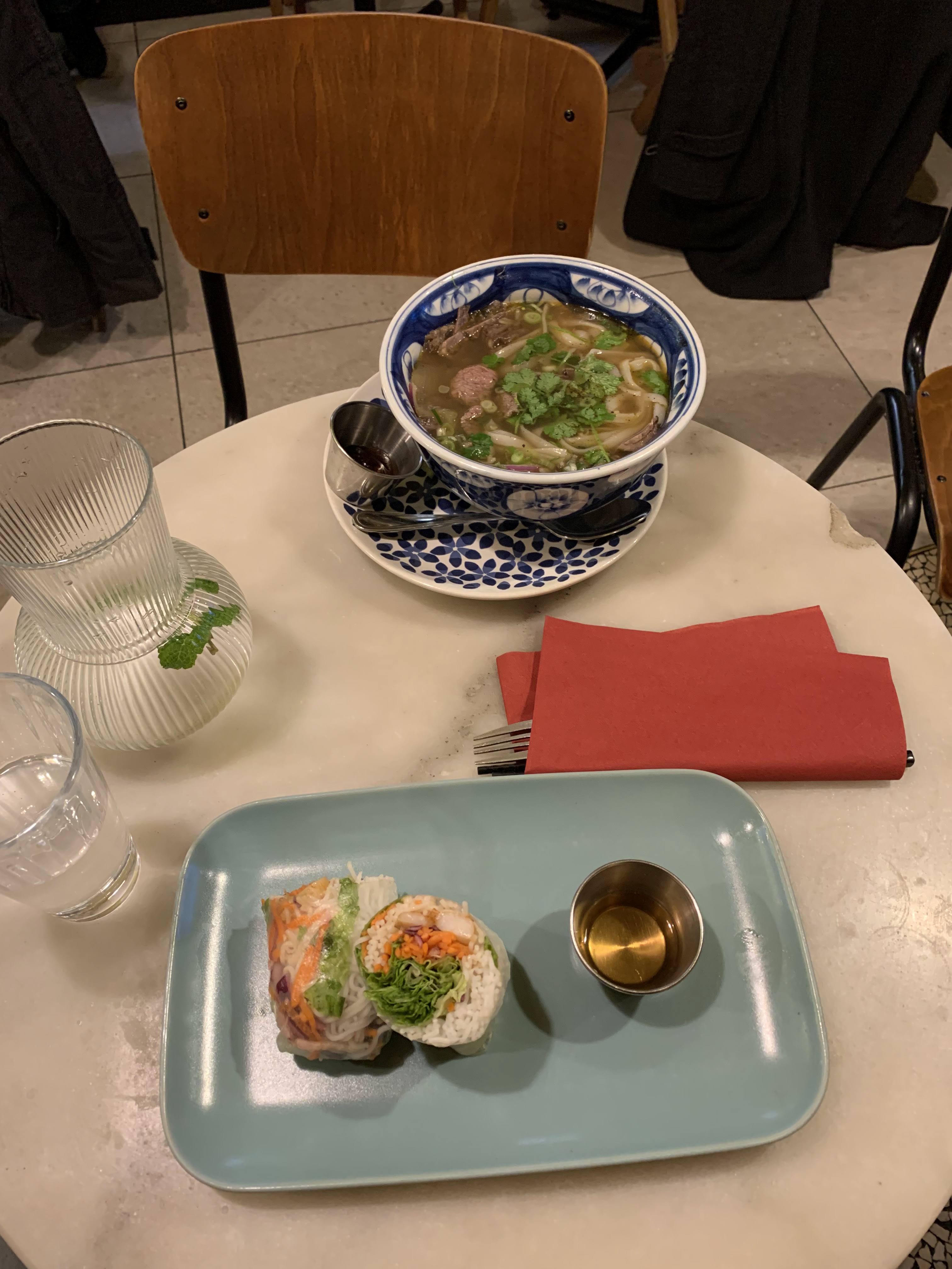 Première fois dans ce restaurant, nous avons commandé en entrée des crevettes tempura et en plat deux soupes pho. L’entrée était bonne, mais le prix un peu trop élevé puisque les crevettes étaient assez petites. Les soupes étaient savoureuses, avec un bouillon au goût bien prononcé !