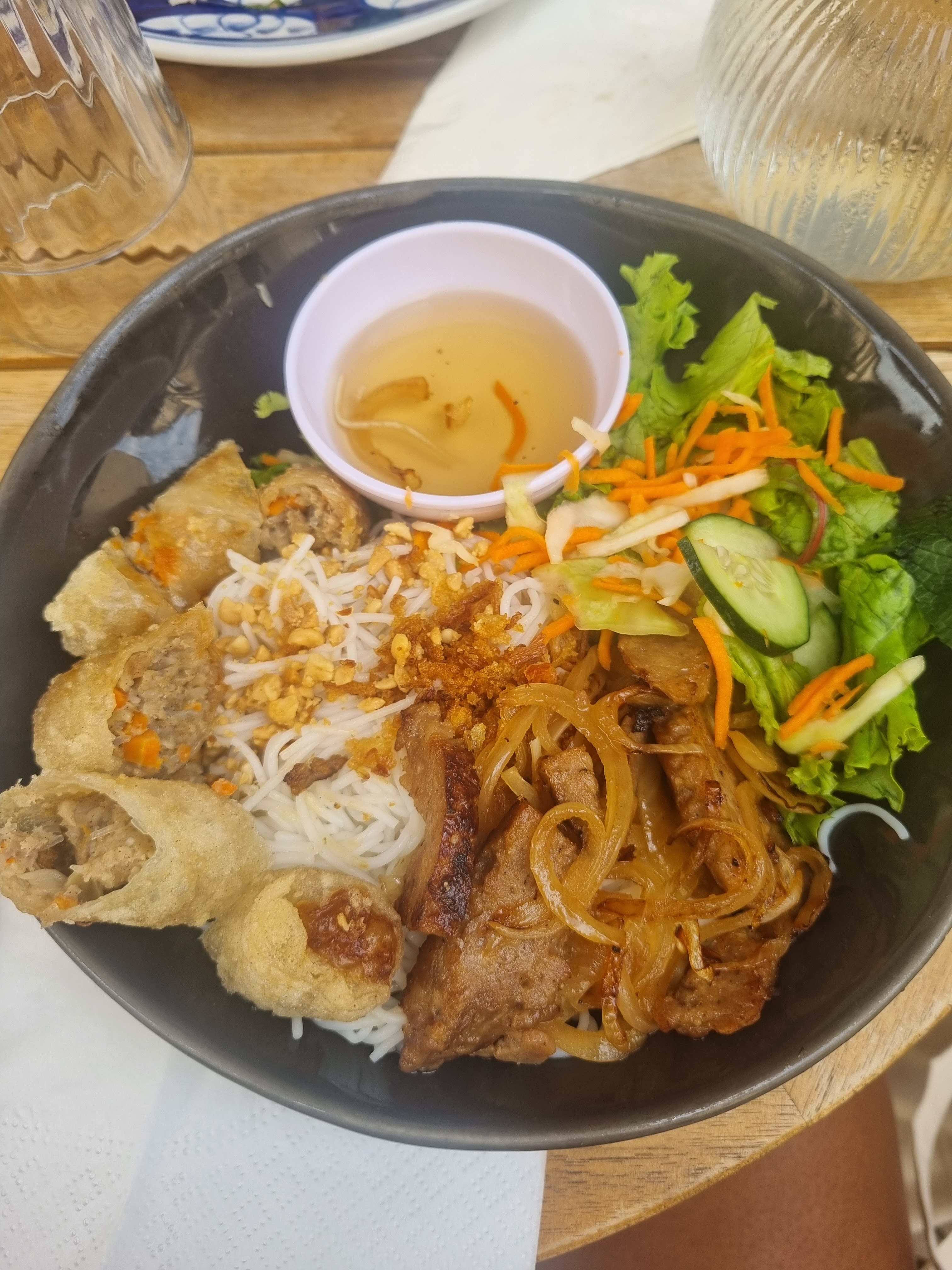 C'est déjà l'odeur qui m'a retenu. C'était pas midi, j'ai passé mon chemin. Pourtant j'y suis retournée et je me suis régalée. Le service était parfait vu le nombre de couverts. La petite jeune en service est courageuse. J'ai été au Vietnam le temps d'un repas. Merci beaucoup 🫶