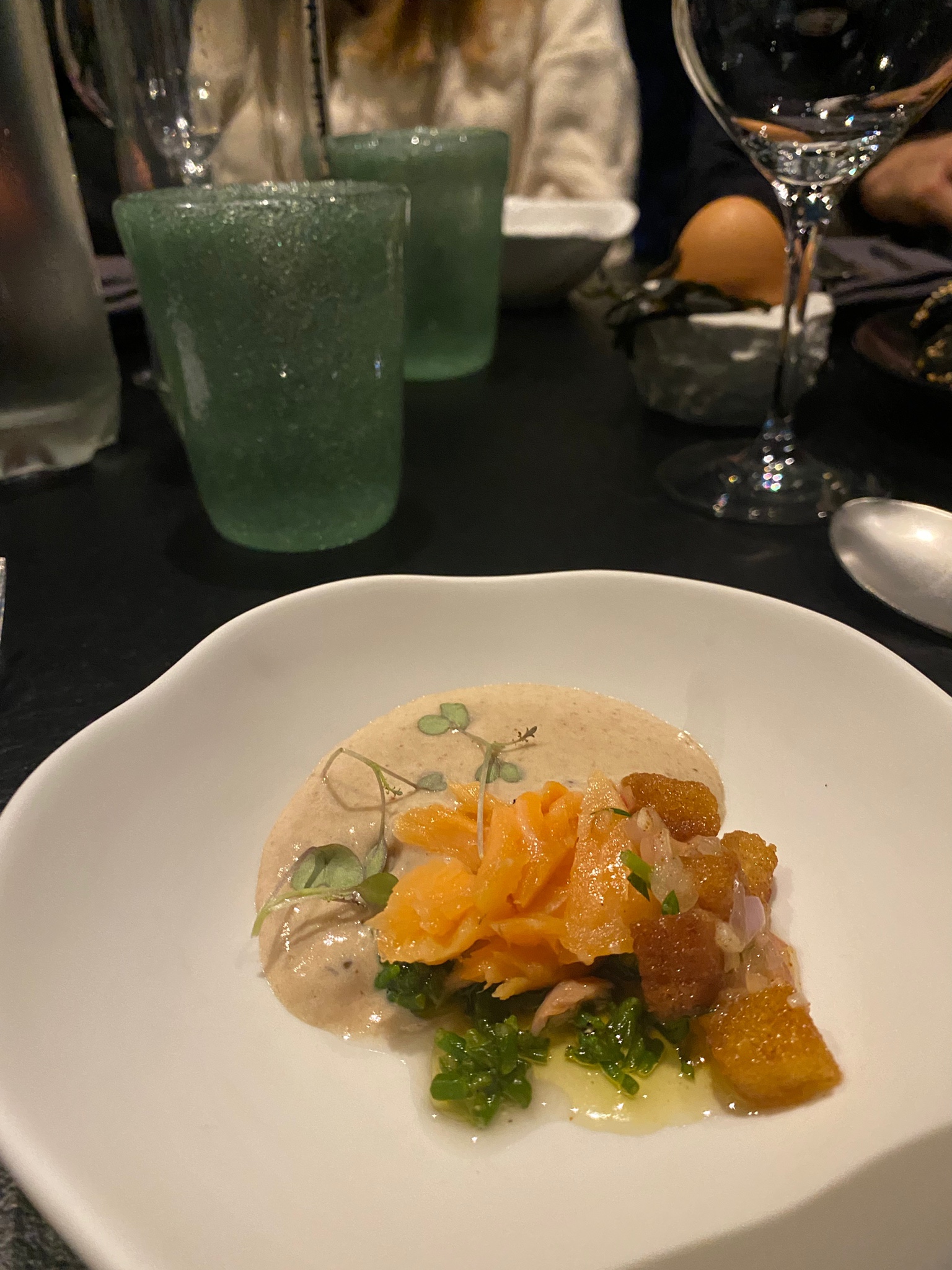 Quelle expérience immersive incroyable à QUELQUE PART. Le menu en 8 étapes était sublime avec des accords vins et sakés de bon goût avec une taie sans alcool pour le dessert. Chaque plat vous a vraiment transporté dans des profondeurs de saveur, de goût et d'art. Le dessert était quelque chose de jamais vu auparavant. Léger mais savoureux! Ce menu vous permet également de vivre une expérience avec le chef, de le regarder cuisiner le prochain plat à servir sur le menu et vous pouvez poser des questions pour vraiment en savoir plus sur cet endroit et l'expérience qu'il offre. Les membres du personnel sont tous sympathiques et chaleureux et pour moi, c'était un 20/20!