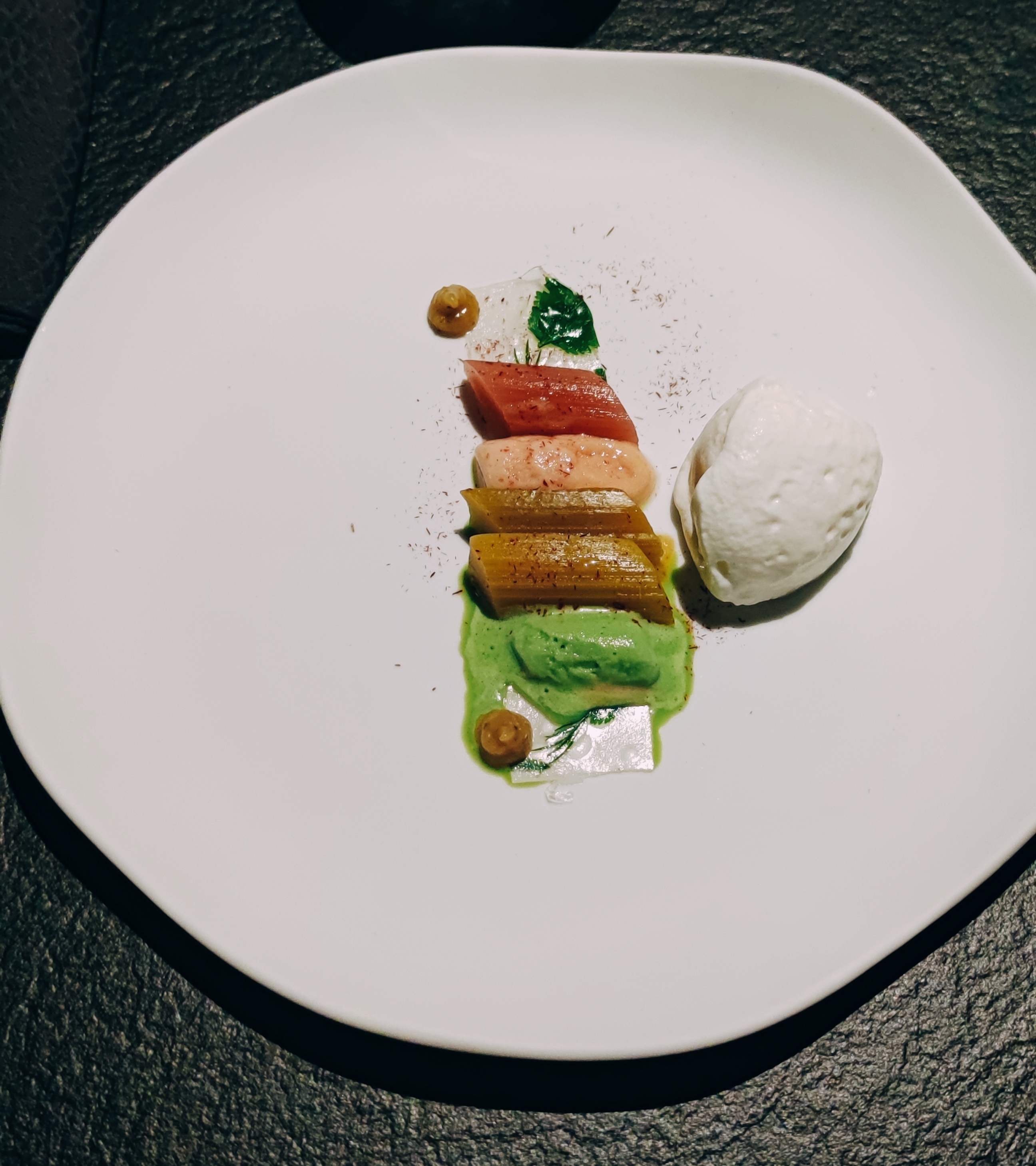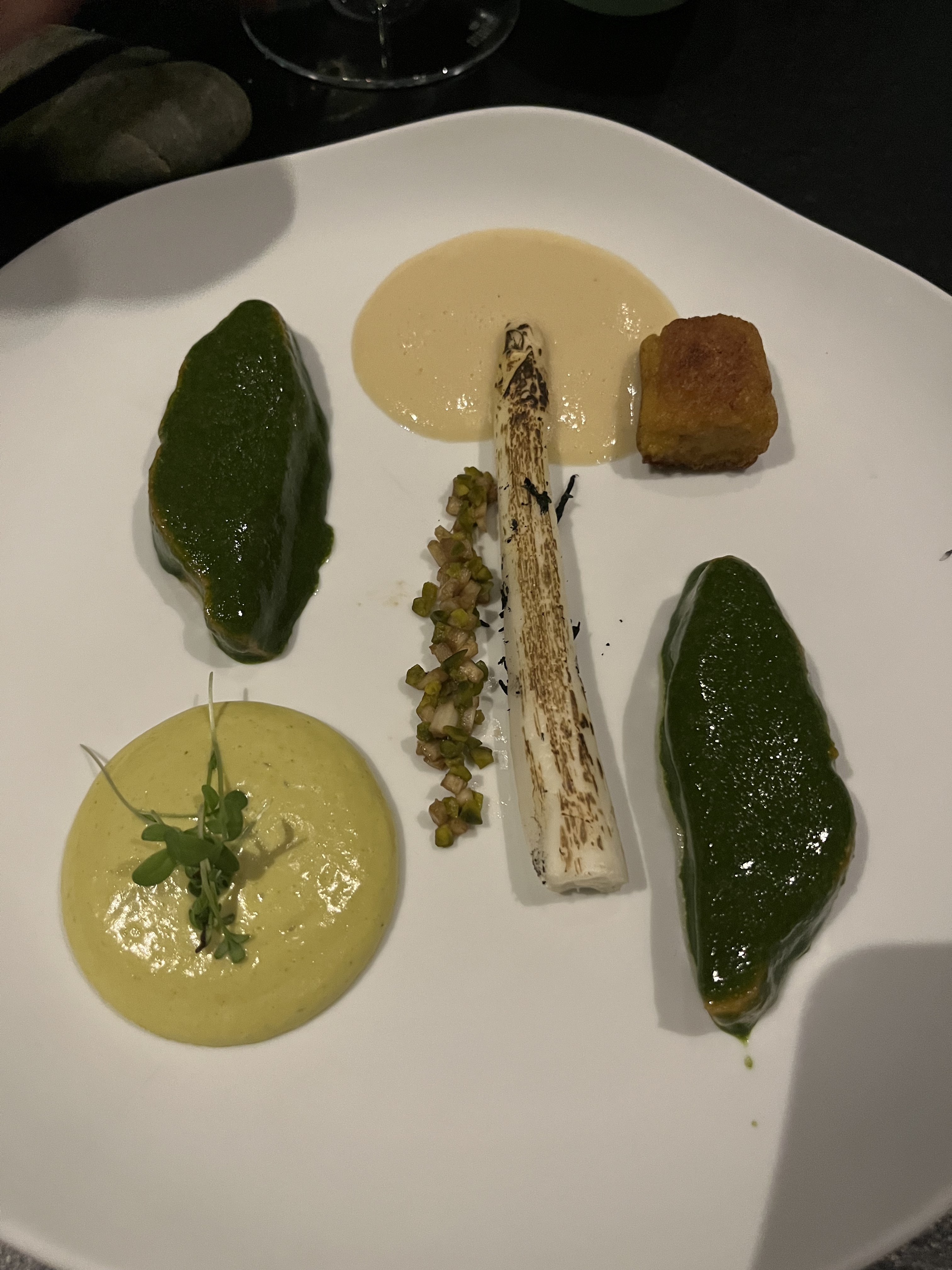 2 mises en bouche - poisson, crème de champignons, oeuf sur un sablé à l’encre de seiche bon mélange malgré que ça soit un peu salé - poisson fumé à avec crème à l’aoili sur focaccia, plutôt bon 4 sortes de pain au choix - à l’encre de seiche et sesame - aux céréales ( mon préféré) - pain blanc - pain san gluten L’entrée avec la truite et l’asperge blanche des landes et sa sauce hollandaise, je n’arrivais pas de liaison cohérente avec la sauce, l’asperge et la truite… pour ma part l’entrée était sans intérêt Pour le plat, avec le sot l’y laisse de la dinde, et la mousse de pomme de terre, c’était vraiment bien cuisiné. Tout allait très bien ensemble surtout les croûtons de pain qui donnent un peu de croustillant à la texture mais dommage qu’il manque un peu de légumes pour donner un petit côté croquant au plat. Le dessert avec le sorbet cactus et tartelette chocolat noir était une belle découverte. Ce melange chocolat-cactus allait tres bien ensemble.