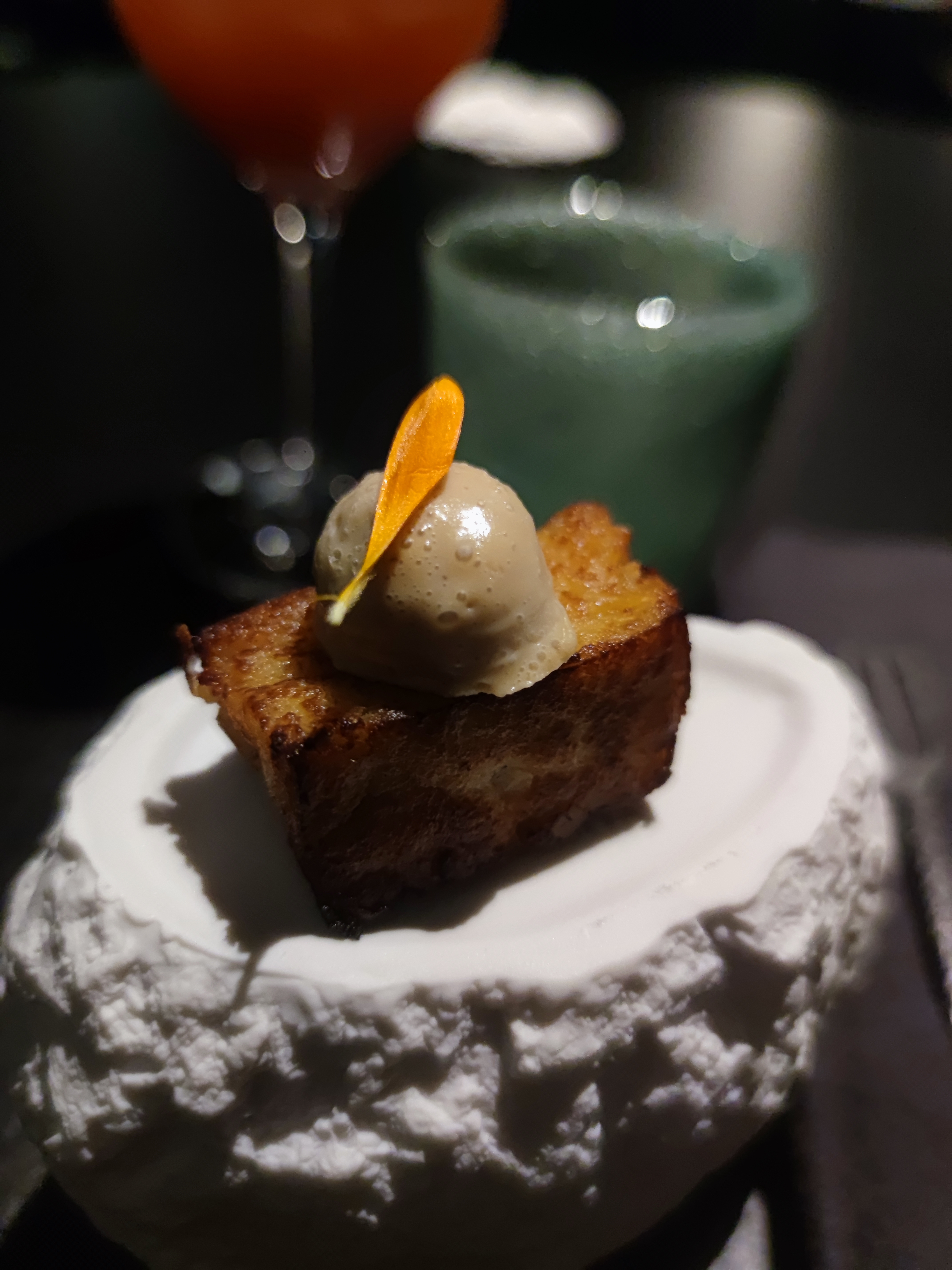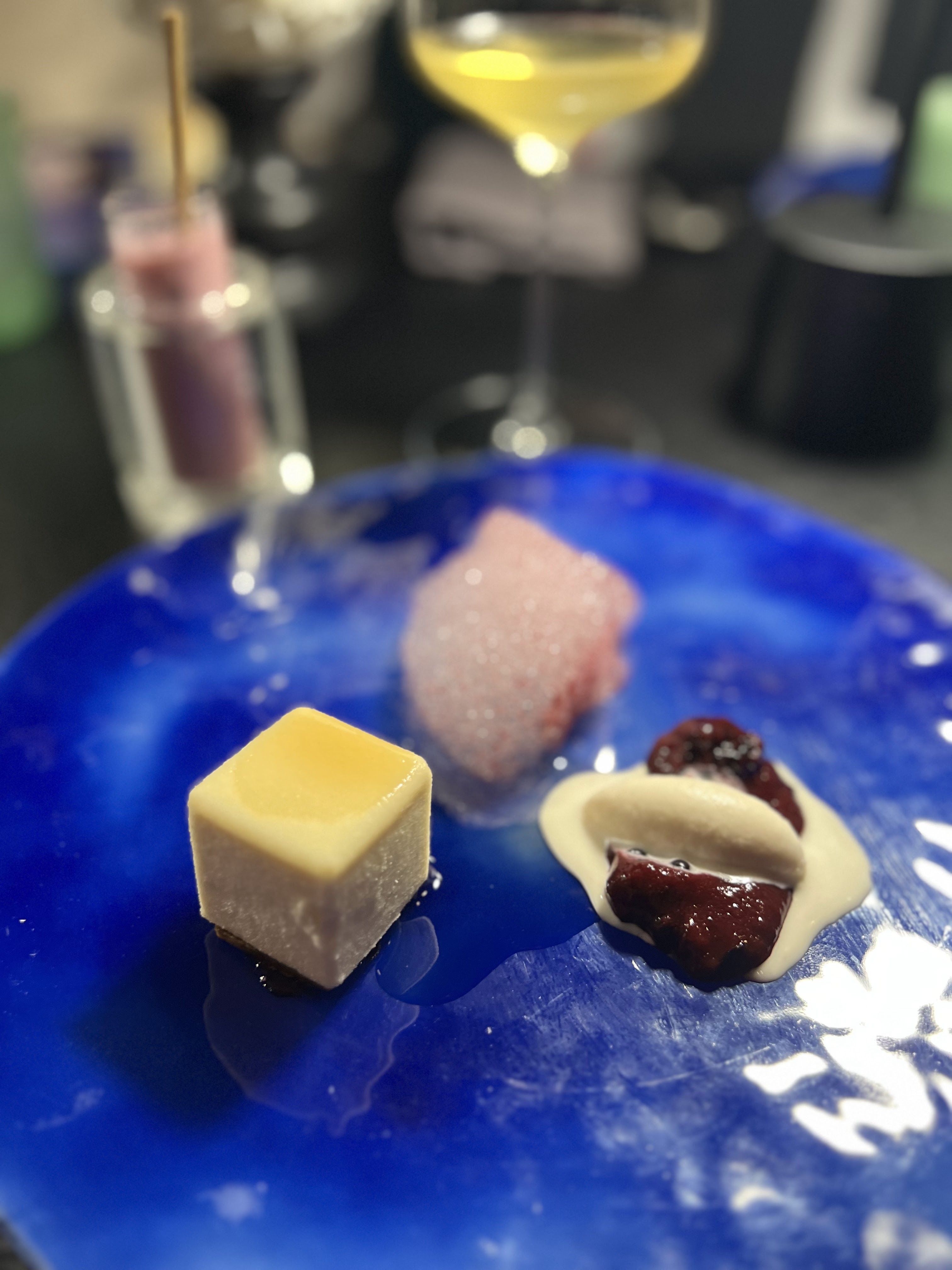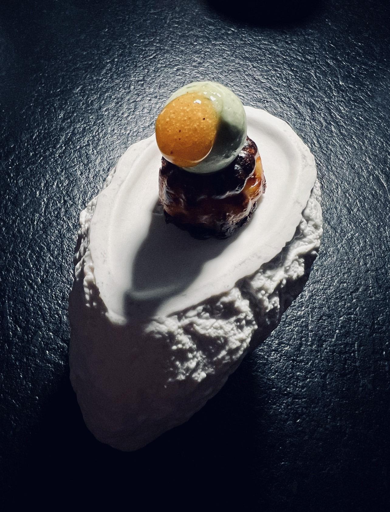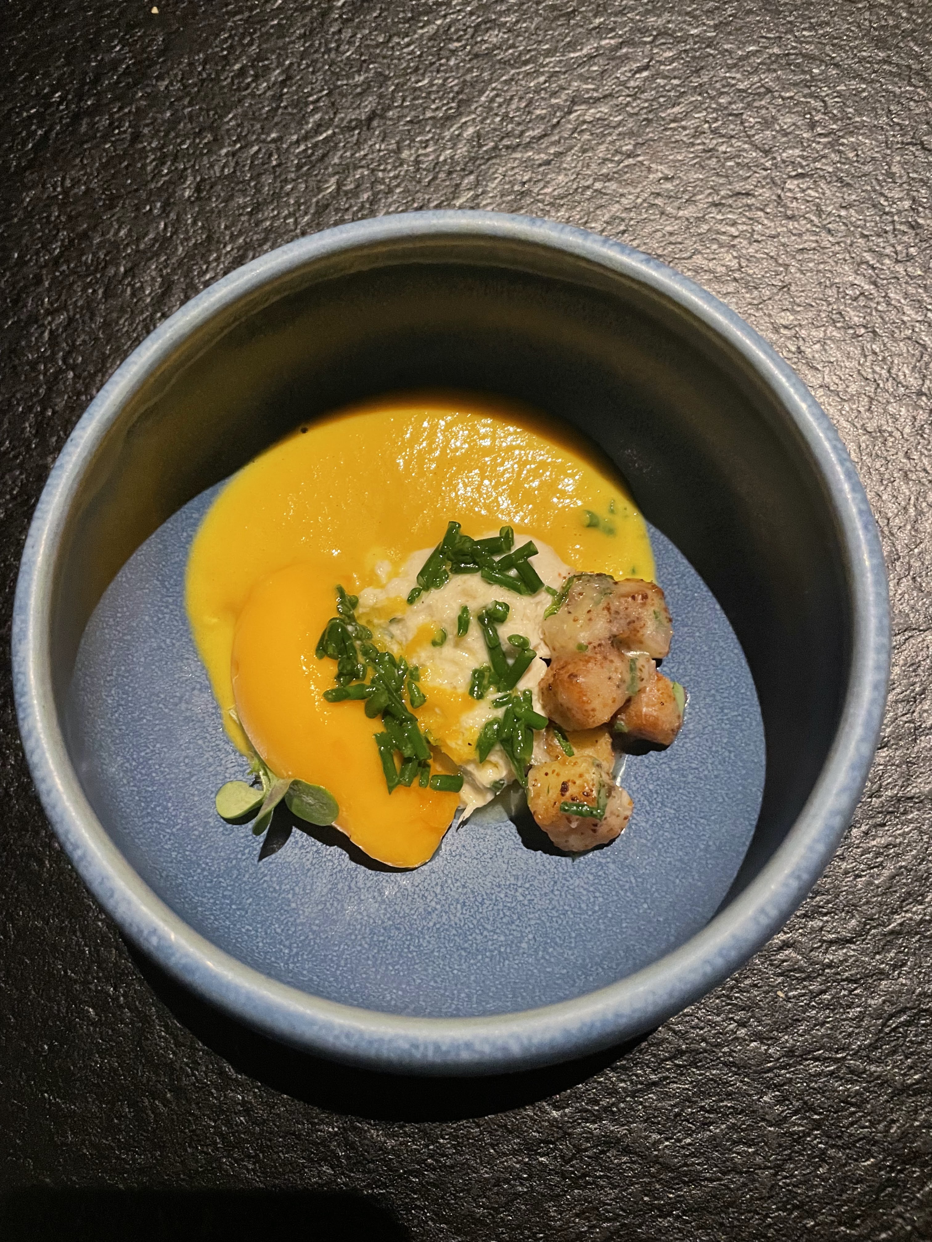 Le jour de mon anniversaire, mon époux me réserva une surprise mémorable : une plongée abyssale dans les mers chaudes et parfumées de mets plus délicieux les uns que les autres. Déjà le cadre envoûtant ( de grands murs lisses bleus verts) comme une fosse ( plongée)nous invite à descendre de palier en palier vers des fonds de plus en plus mystérieux. Je flottais littéralement et me laisser dériver vers ces douceurs marines. Plongez sans hésiter dans le grand bain, quelque part dans le 9e. No limit .A quand la 1 ⭐️ pour ce jeune chef tout en devenir ?!