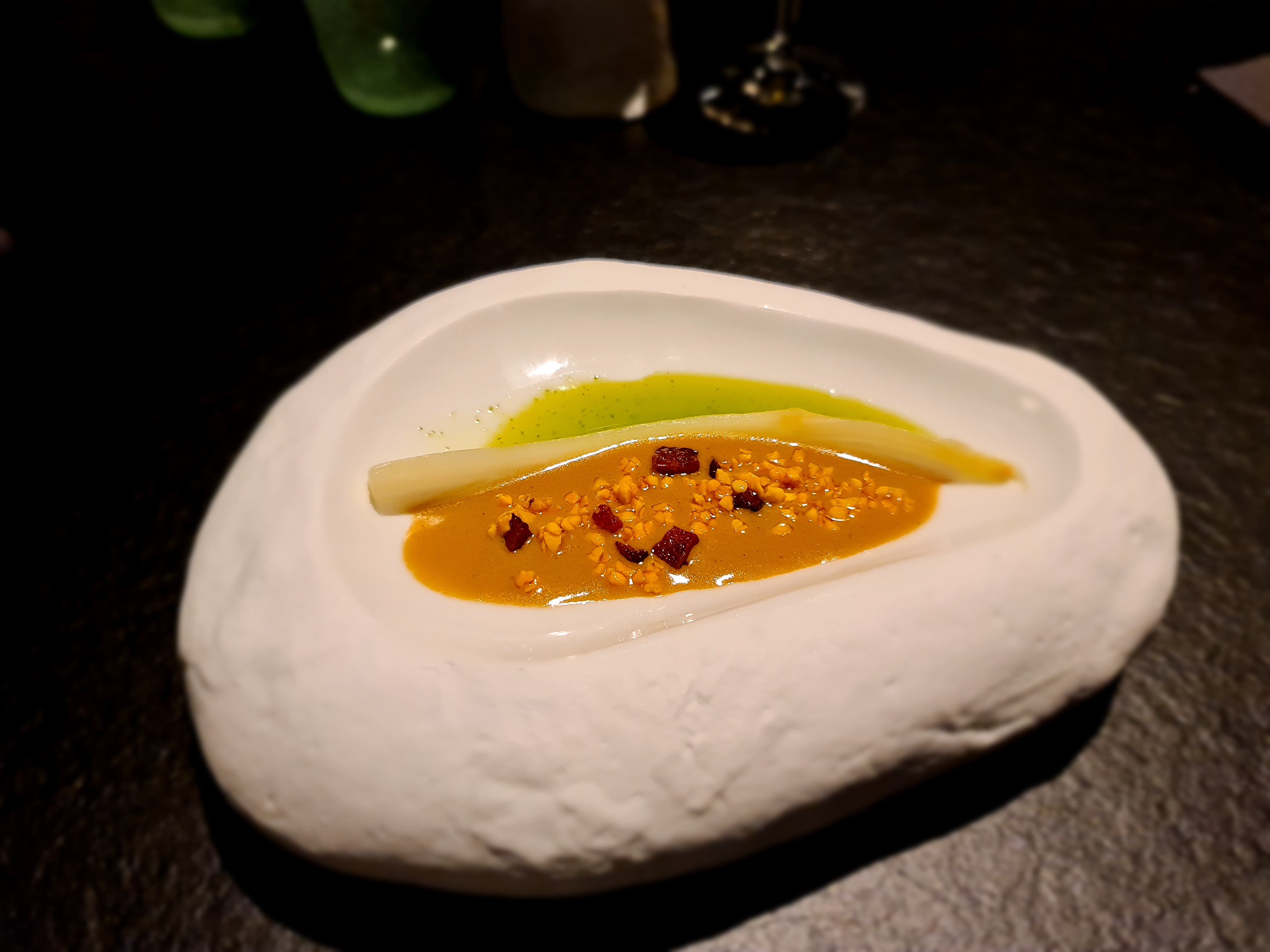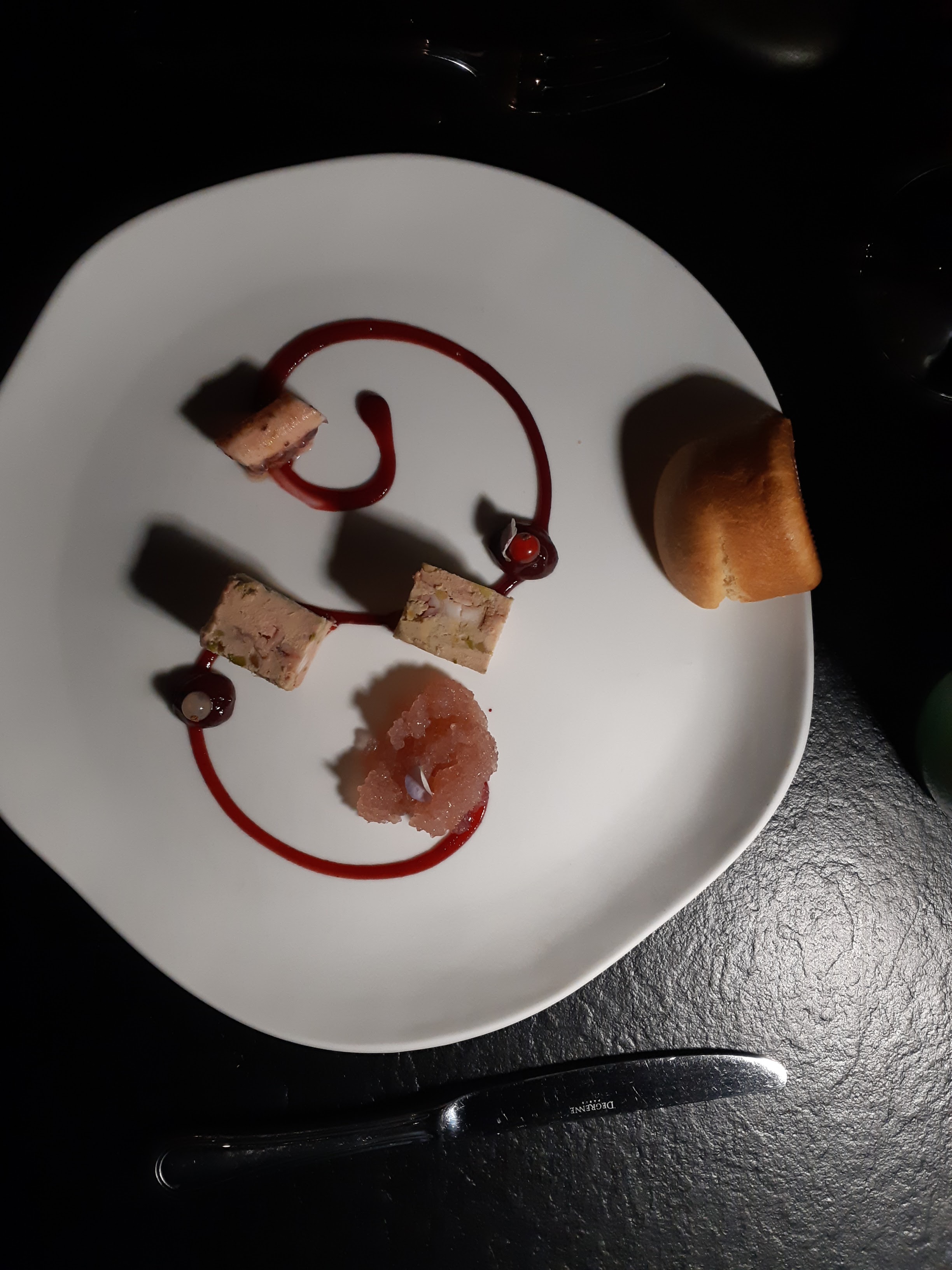 Cadre, cuisine et vaisselle atypiques. Dans l'ensemble nous avons apprécié notre menu 5 paliers. Les plats sont composés de nombreux ingrédients témoignant d'une recherche du chef cuisinier dans une optique d'innovation (on aime ou on n'aime pas). Les cuissons viande ou poisson sont impeccables. Pour certains plats, le chef joue avec les saveurs d'herbes type aneth, cerfeuil, menthe,.... N'hésitez pas à les manger, elles apportent un plus au plat et réveille vos papilles. Le service est efficace, avec la présentation de chaque plat et une volonté d'échanger avec nos ressentis. Seules ombres au tableau : des morceaux de pains (faits sur place) trop petits et des coupes de champagne servies chichement. Enfin on aurait aimé avoir des plats plus chauds, ils étaient souvent tièdes. Niveau tarif, le menu est d'un bon rapport qualité/prix. En revanche, les boissons sont très chères (18 € un cocktail ou coupe de champagne, 6 € un décaféiné ou l'eau 75cl facturée 8 € !).