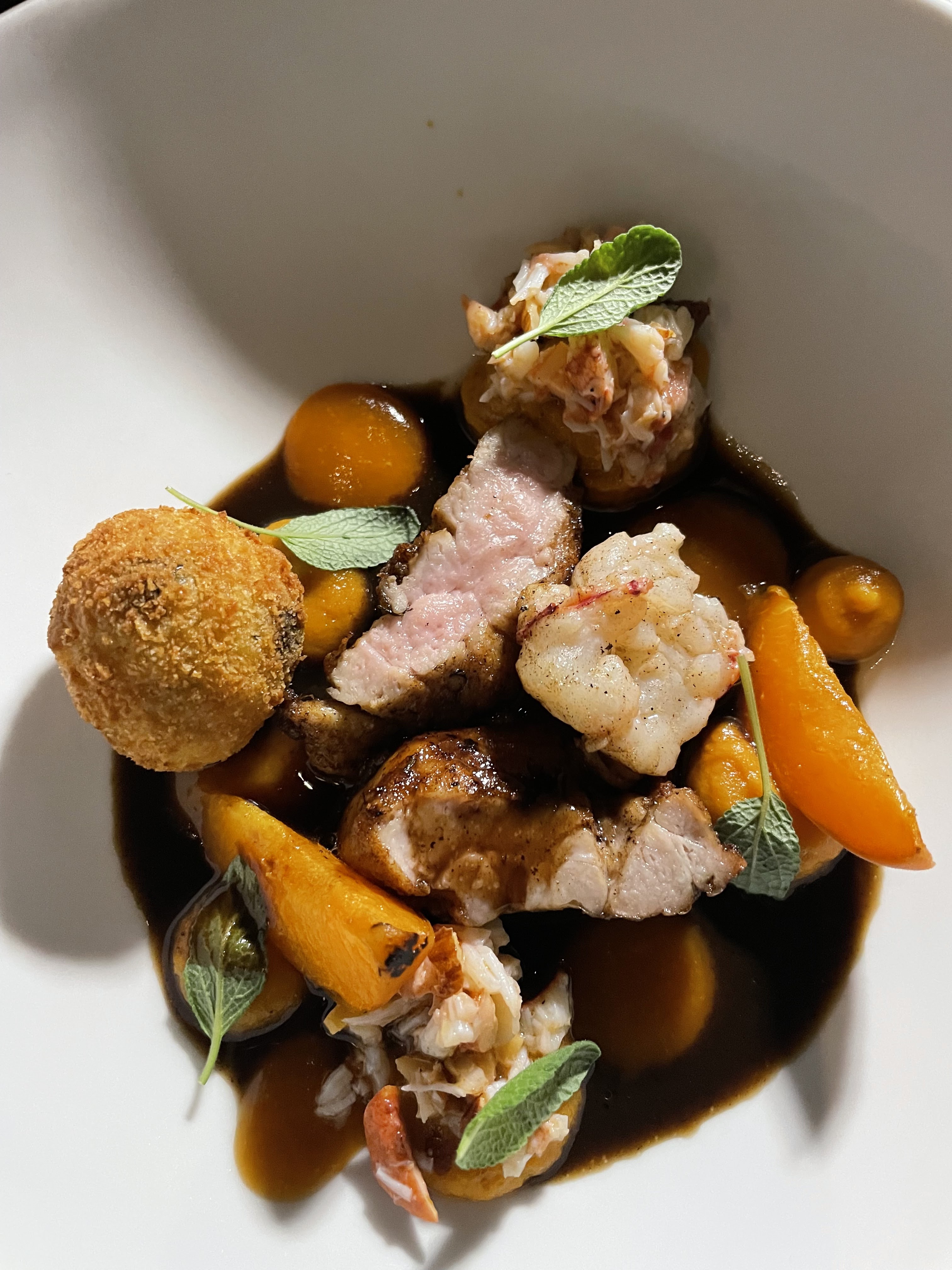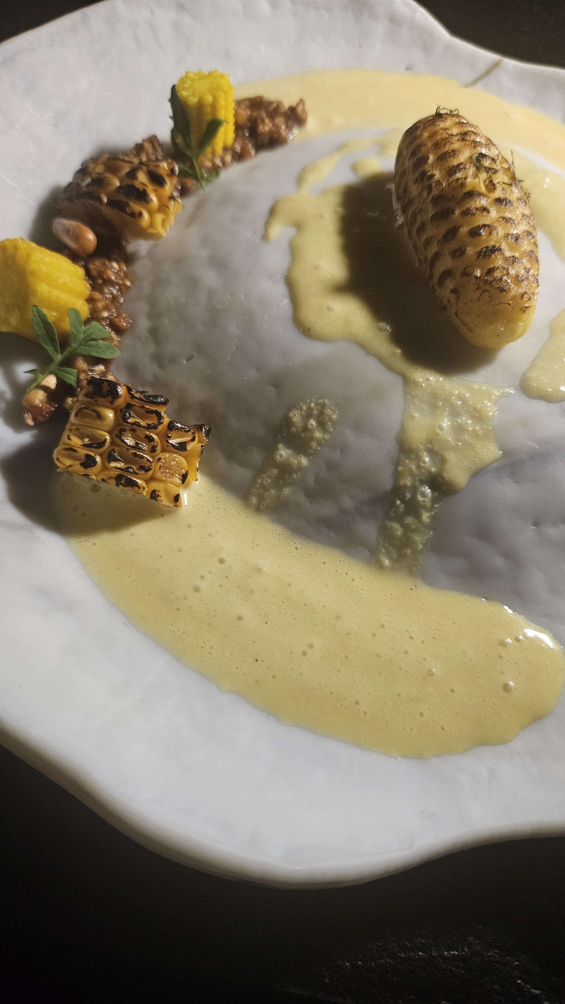 Lieux improbable et sombre . La cuisine proposée est extrêmement risquée en terme de technique et d’association de saveurs. Le plat signature est sur vendu car la réalisation ce soir la était catastrophique car le ris de veau était surcuit, de la semelle . Le dessert au homard 🦞 est amusant mais le homard est à mon humble avis en trop et pas à sa place .Trop d’originalité tue l’original. De nombreux réglages sur certains plats comme le maïs 🌽 sont à prévoir .