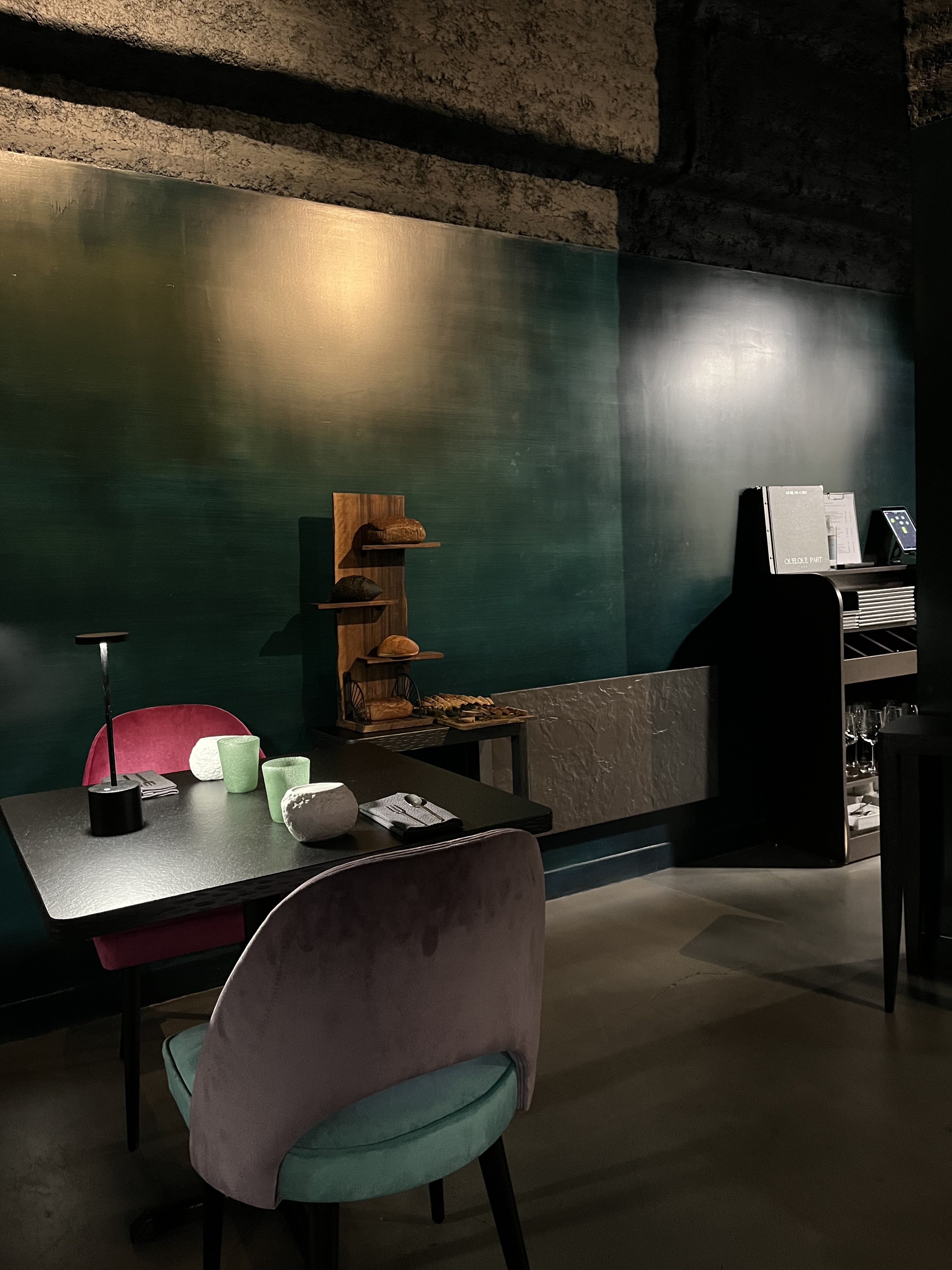 Si vous connaissiez Paris pour ses catacombes, je ne peux que chaleureusement vous recommander les abysses du 'Quelque part...' Nous y sommes allés il y a quelques jours déjà, et nous ne sommes toujours pas remontés à la surface, tant nous avons été imprégnés par l'expérience. Après un accueil chaleureux, on nous a dirigé en bas, dans une salle sombre, qui nous a de suite mise dans l'ambiance... Elle donne sur la cuisine ouverte, et nous n'avions pas de musique, ce qui a été fort apprécié de mon côté. Nous avons tous les 2 pris le menu en 8 palliers, auquel nous avons ajouté le homard bleu. Je n'aime pas le poisson, et le chef a réussi à relever le défi de me faire manger du hareng, de l'huître, du poulpe entre autres dans un seul repas sans que je n'ai quoi que ce soit à redire... lui et son équipe ont sublimé les plats, tant au niveau visuel, sur une vaisselle incroyable, qu'au niveau gustatif. Une cuisine créative, et au-delà du talent, une véritable expérience, où ne nous sommes pas sentis seulement spectateurs, mais aussi acteurs de notre soirée. Il a su adapté à la dernière minute notre menu suivant nos restrictions alimentaires Le service fût impeccable du début à la fin, une belle équipe, jeune, dynamique et sympathique, tout en restant professionnelle. Le chef a pris le temps de venir saluer les hôtes à la fin du repas, et nous en dire un peu plus sur la cuisine. Nous vous remercions chaleureusement pour cette soirée mémorable dont nous avons bien du mal à nous remettre. Amandine &Hassan