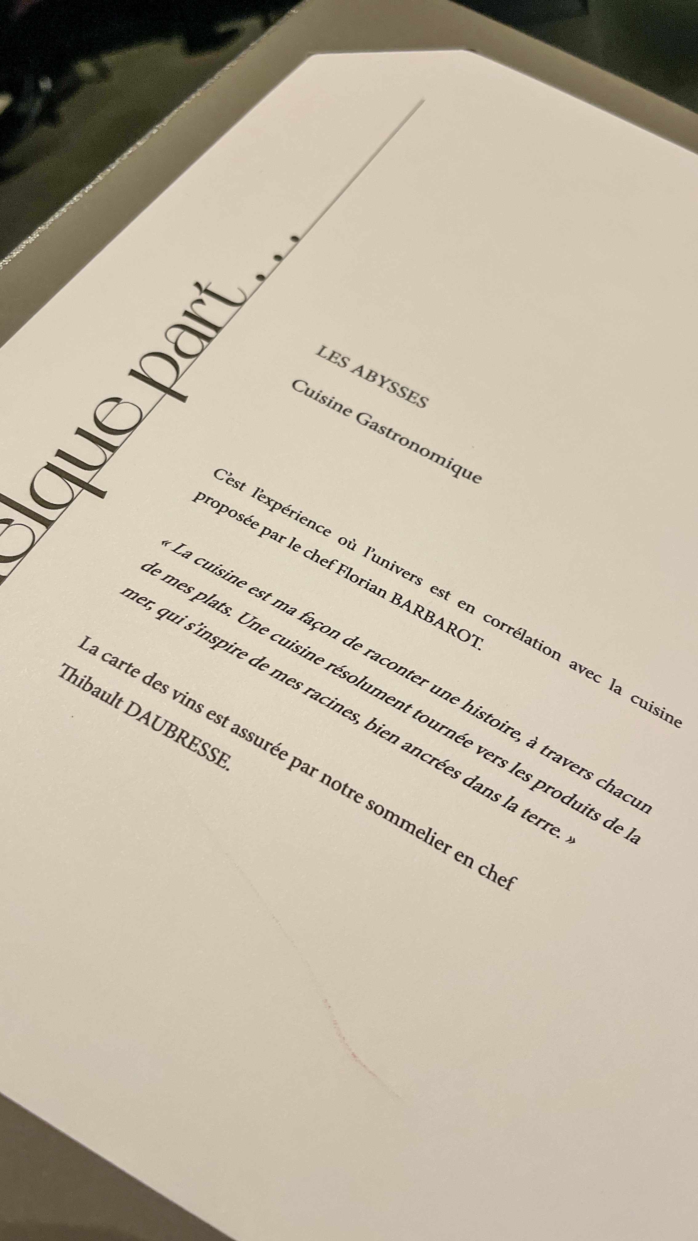 Venir dîner chez « quelque part » c’est plonger dans l’univers d’un chef pas comme les autres. Nous avions découvert Florian dans Top chef et nous avions hâte de déguster sa cuisine. Quel voyage surprenant en six paliers dans les Abysses. Un mélange de saveurs, de couleurs et de textures. Un coup de cœur pour le dessert à base de homard: une explosion de saveurs. Un chouette service, à la hauteur du lieu. Des cocktails uniques. Merci pour ce beau moment.