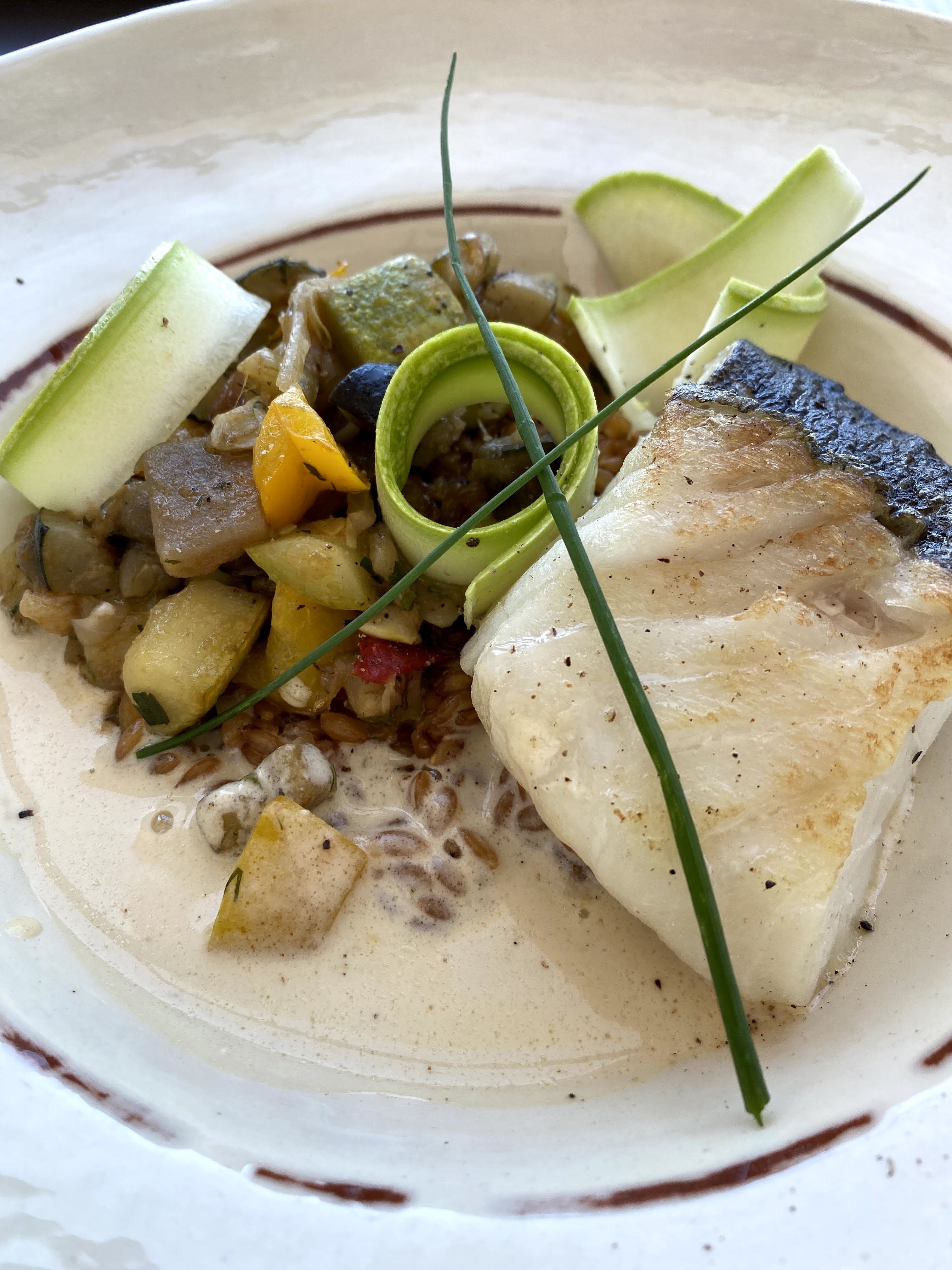 Personnel à nos petits soins et cuisine raffinée Le plat principal : Filet de loup, panisse et ses petits légumes = une tuerie ! Nous avons déjeuné dans une cour intérieure à l’abris du soleil et légèrement brassée par le vent