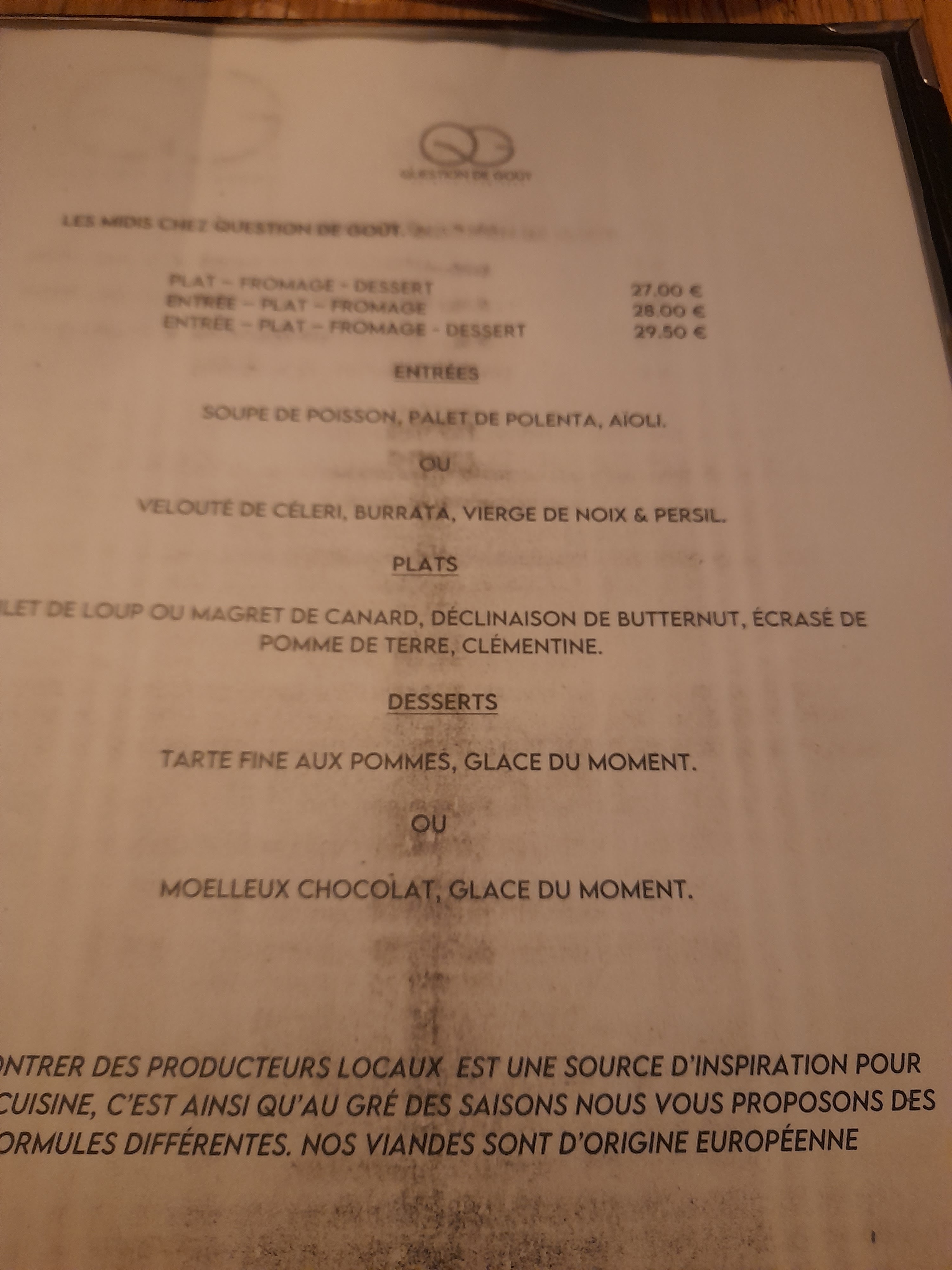 J'ai manger à question de goût un samedi soir avec ma maman et ma copine Le samedi soir c'est dégustation à l'aveugle type gastronomique, on a vraiment passer une excellente soirée très bien accueilli, personnels compétent et au petit soin avec un service de qualité je recommande fortement ce magnifique cadre de dégustation.