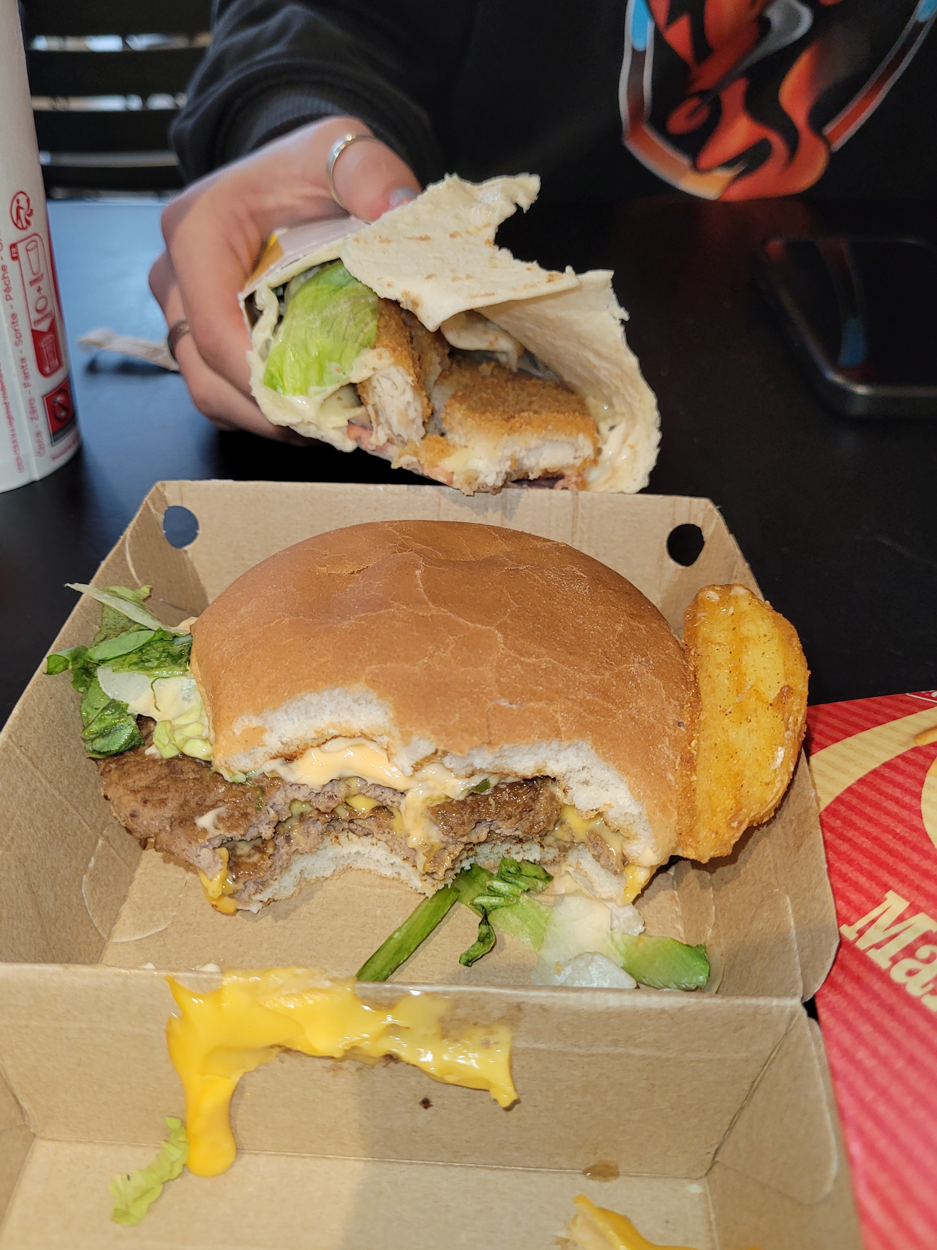 Le monsieur à la caisse est très gentil mais on a eu nos frites sans cheddar (alors qu’on a payé 1€40 de + pour….), le giant à l’air surgelé et niveau goût, le wrap c’est une aberration 😂 vraiment pas bon du tout