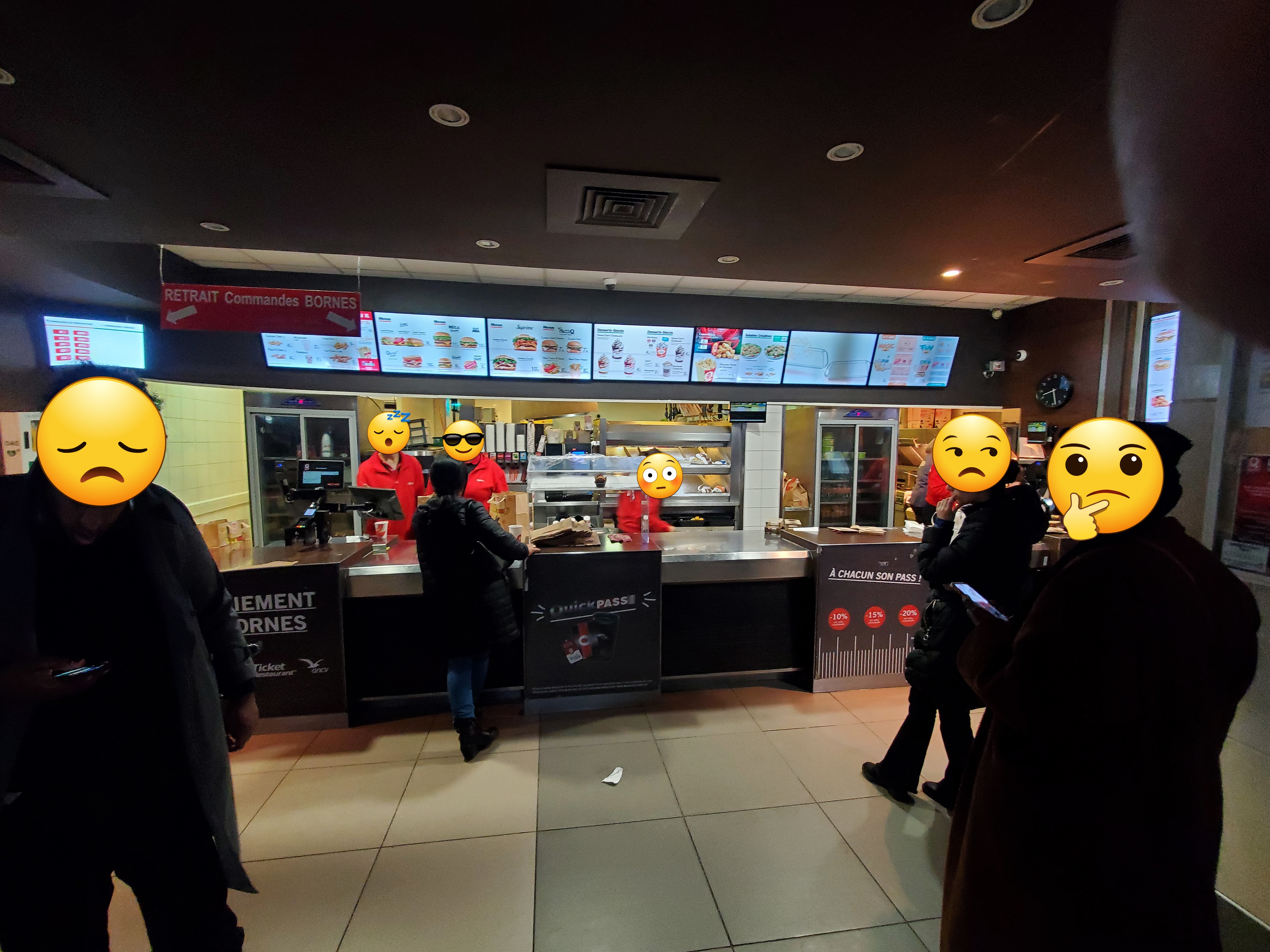 On va faire simple et factuel avec des chiffres et des photos anonymisees non contestables : * 2 mai 20h33 * 3 menus ~ 30€de facture. * 6 employés en caisse, 1 seul en cuisine (apparemment le marketing est plus important que le design chez quick) * <10 clients et la caissière en chef justifie l'attente par une affluence majeure * 25 minutes d'attente en moyenne pur chaque client pour sa commande * pas de savon dans les toilettes * et avec 7 employés sur le terrain ça la salle est pas propre et les escaliers portent les séquelles d'une commande renversée il y a un bon moment. Bref les autres gagnent du terrain, Quick en perd. Y a une raison autre que la simple qualité des menus...