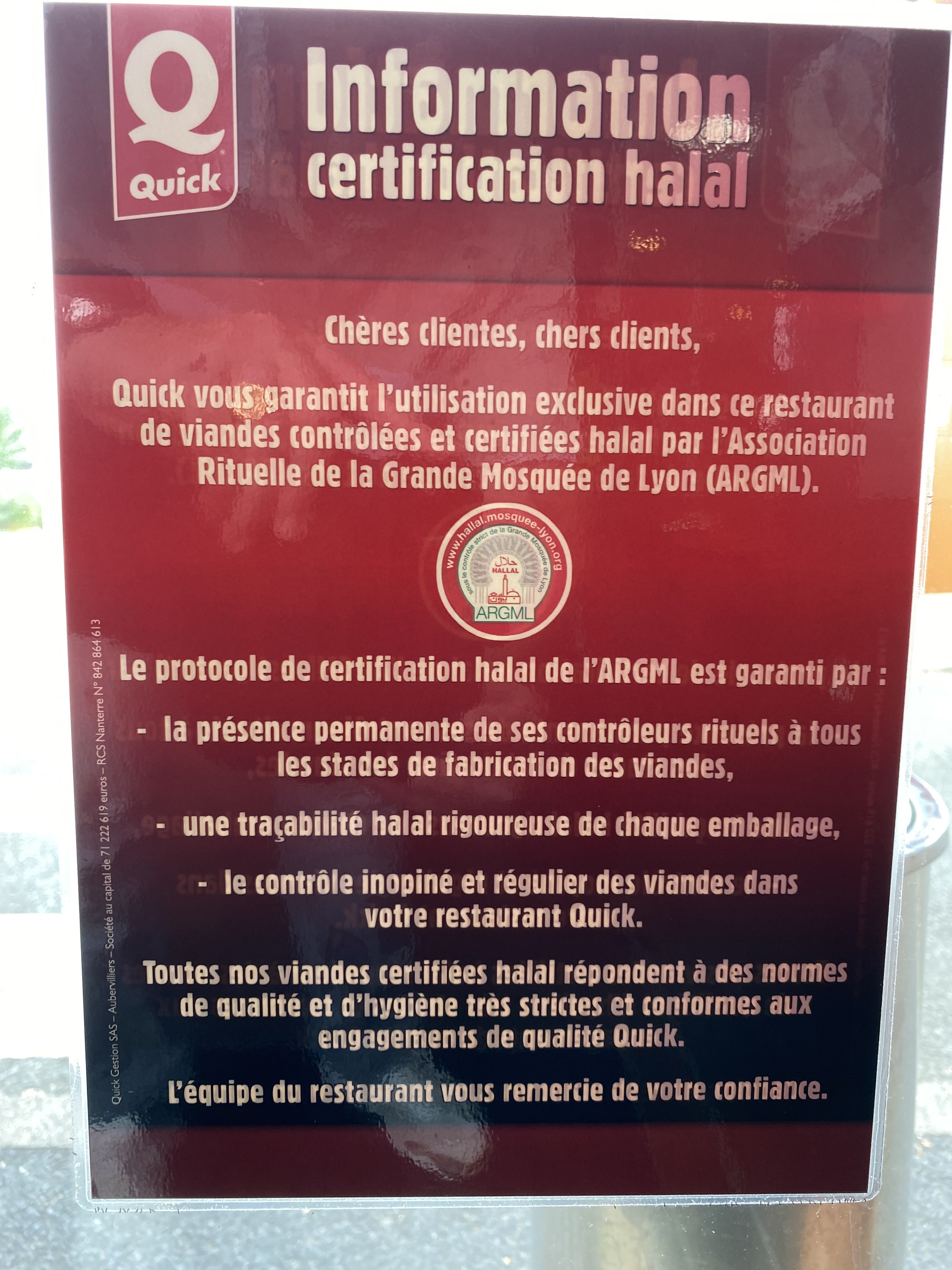 Bonjour, Voulant acheter le fameux Quick en toast , il est signalé « bacon au poulet ». Comme sur tous les autres menus contenant du bacon. je me renseigne et j’apprends que l’enseigne a signé une charte halal. L’ensemble des produits est halal. Il me semble légitime de pouvoir avoir au moins le choix ! Je refuse devoir manger une viande qui a subi un rite musulman, « tradition » qui égorge les bêtes sans étourdissement! Je suis soucieux du bien être animal. Cela existe… en France! De nos jours! En conclusion cette enseigne a perdu ma clientèle. L’affiche indiquant le régime alimentaire devrait être affiché en grand à hauteur d’yeux afin de ne pas prendre les consommateurs en otage! Inadmissible !