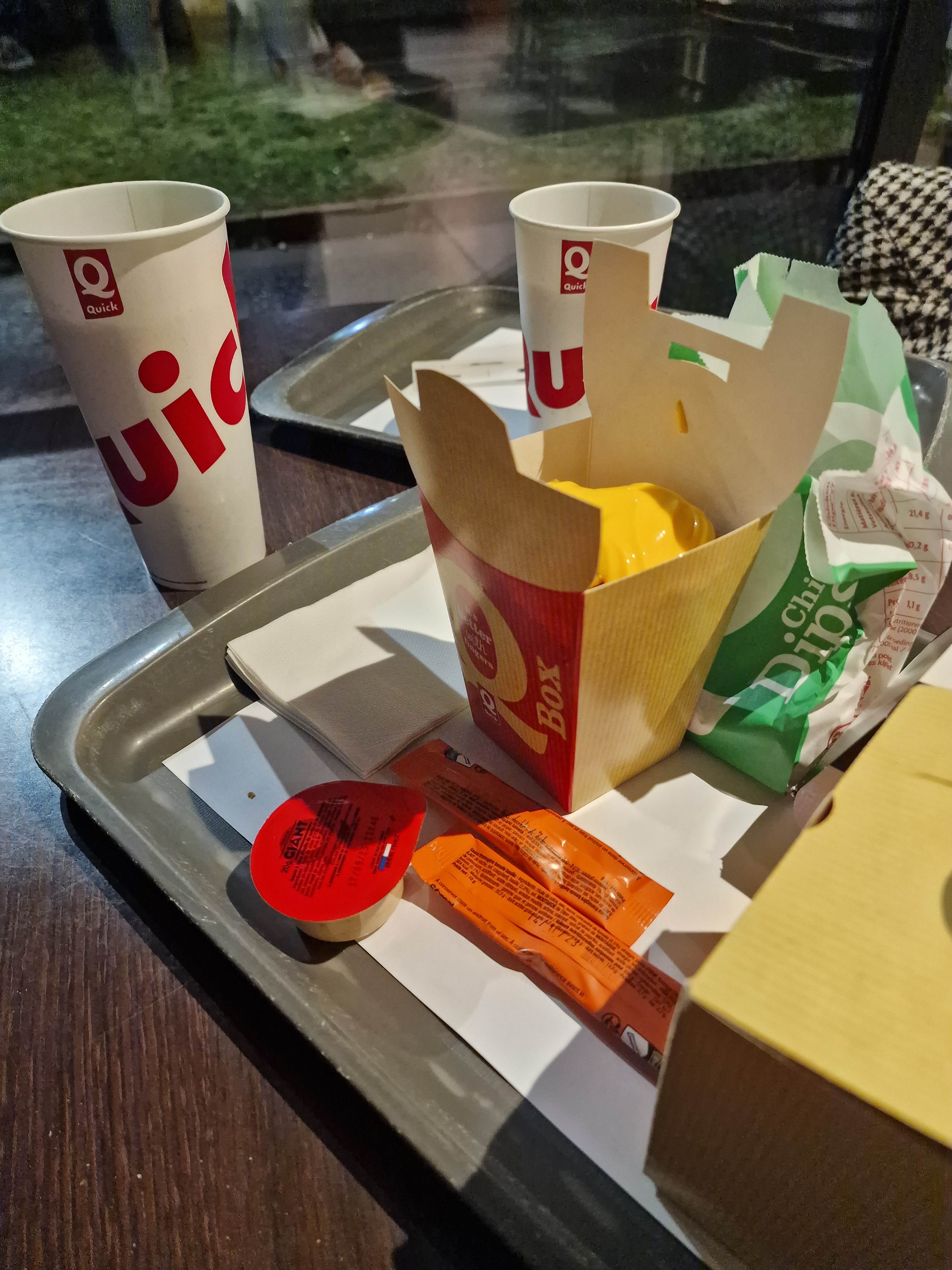 Le personne était pas débordé, pourtant les tables étaient sale et les casiers pour déposer le plateau un fois finit était quasiment tous plein. A part ça, j étais un fan de Quick, mais maintenant que j y vais rarement la taille des burgers diminue 😳