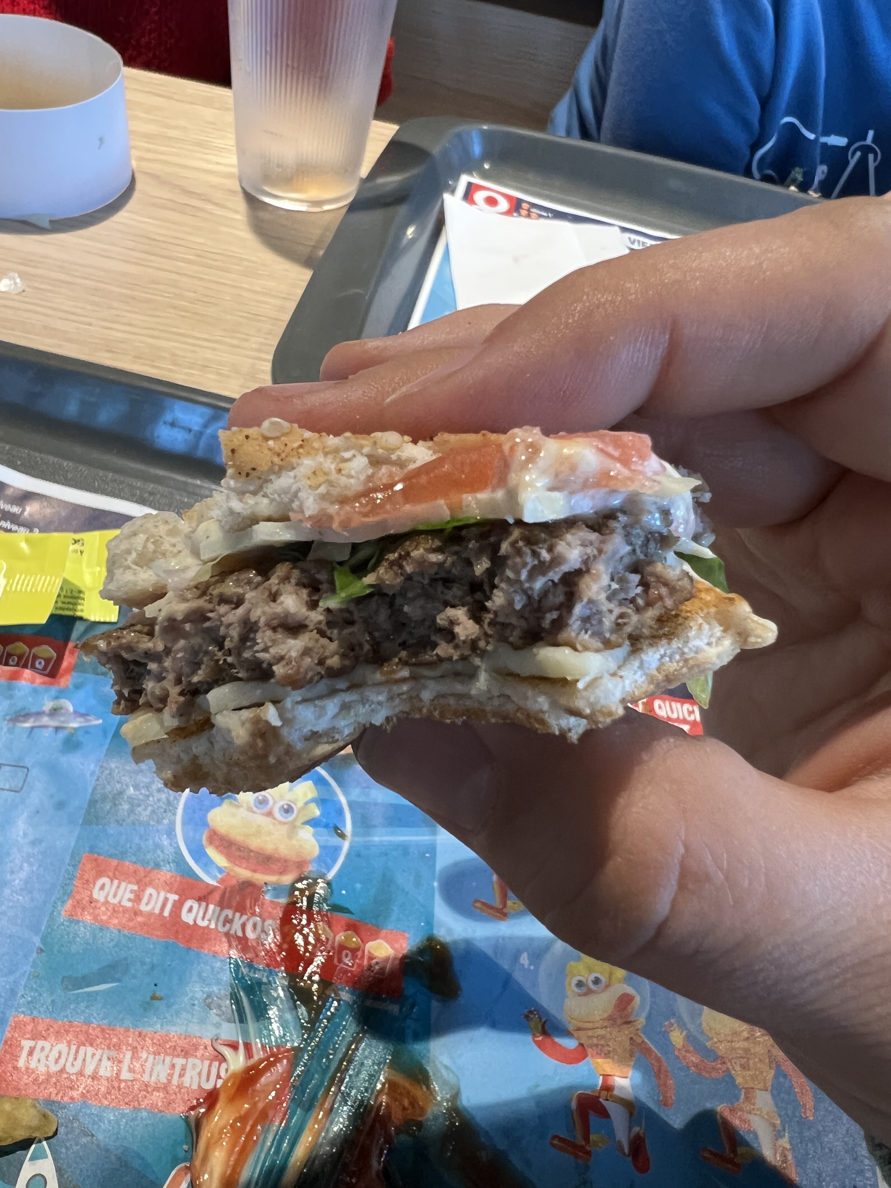 Les sauces sont bonnes mais c’est tout. Déçu car la dernière fois dans un autre Quick c’était bien mieux. La viande est bien trop cuite et pas juteuse du tout. Il y a plus d’eau au Sahara que dans l’hamburger (supreme classique?).