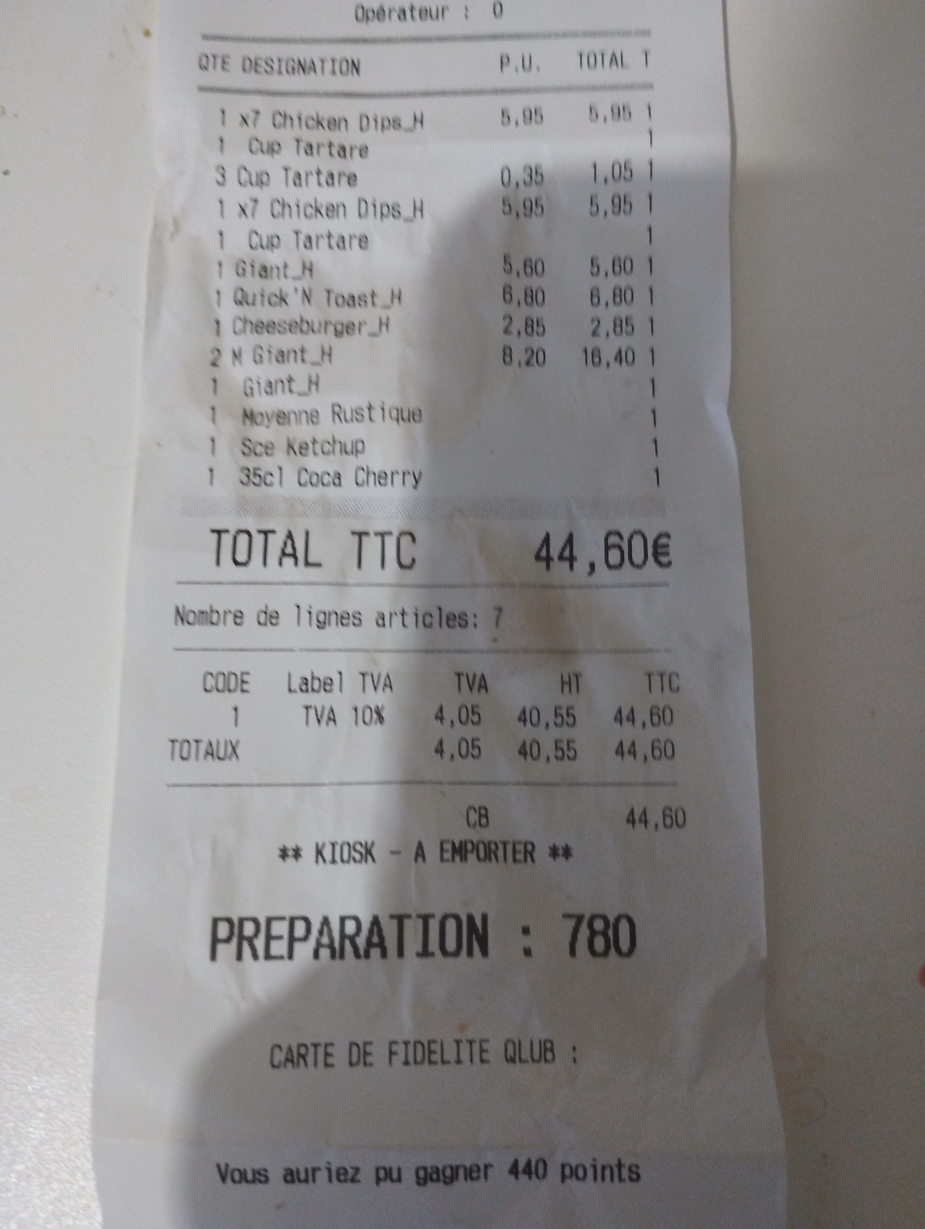 La honte ! Ma mère est allée commander sur place et a eu le malheur de ne pas vérifier les sacs... elle en a eu pour 44,60€ et n'a reçu que 13,60€ de produits ! Il manquait trois giant et un Quick n toast, quand on appelle ça ne répond pas et impossible de se faire rembourser. Bref, on s'est fait voler !