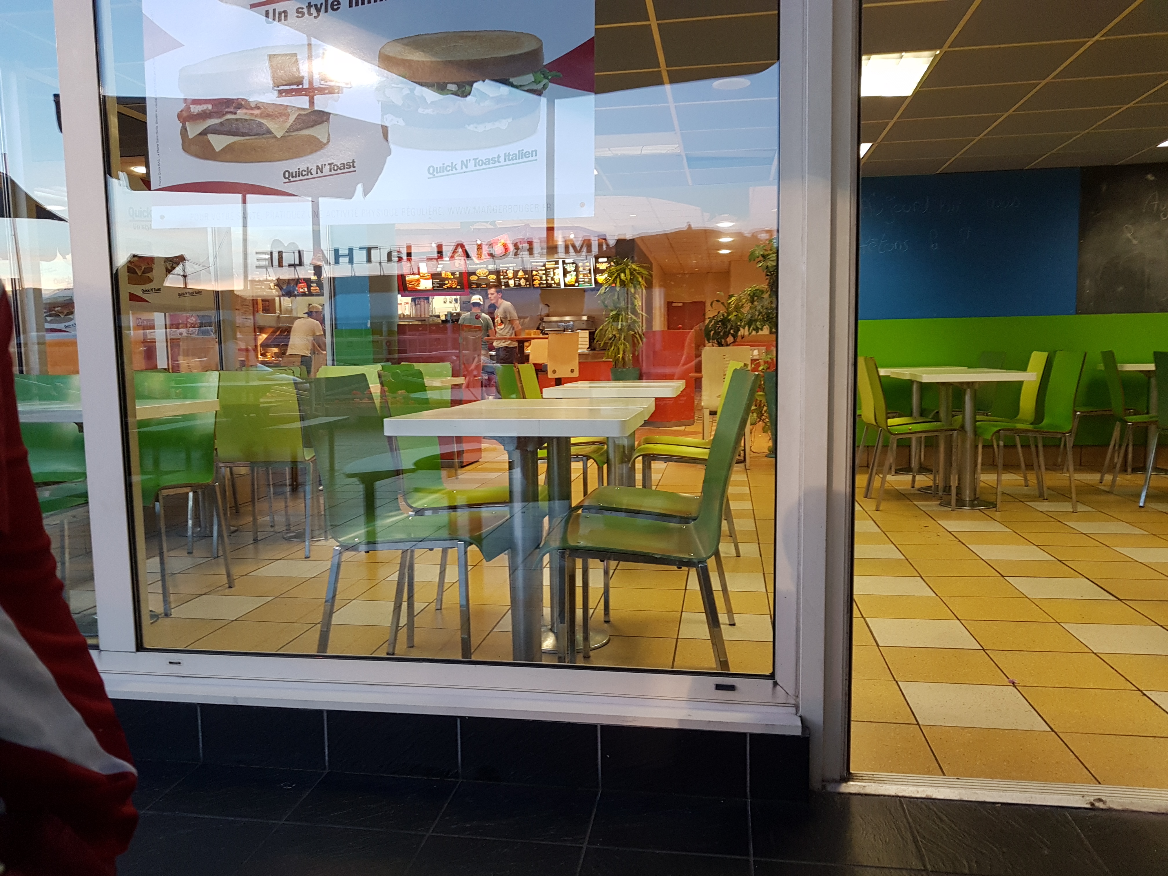 Les lieux sont sales. Un gros nettoyage des vitres, du sol et du mobilier ferait du bien.. Le distributeur de gel était vide... Que 4 bornes de commande et un point de service... Quelle attente au niveau de la caisse! Sinon, c'est Quick!