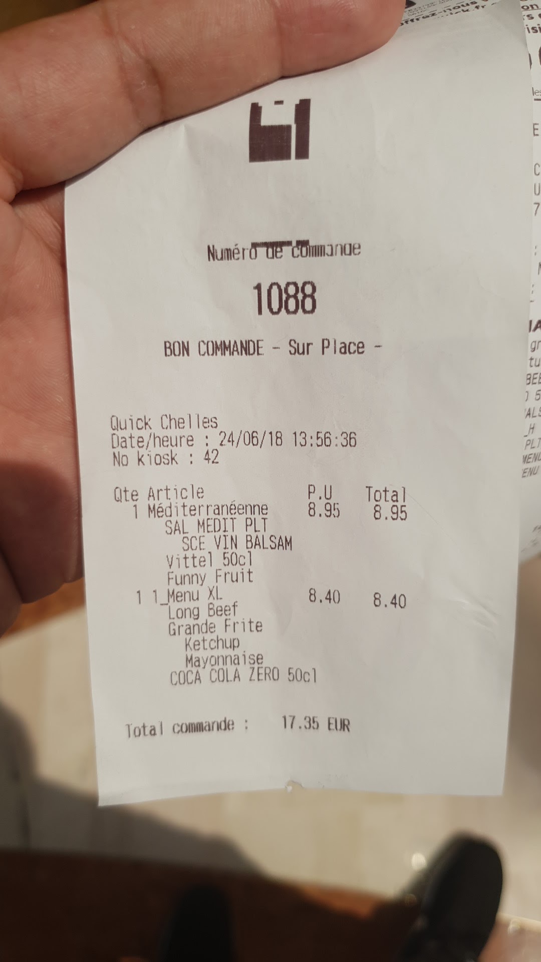 Commande effectuée au Quick de Chelles via UberEats le 29/05 (DEF73) comportant plusieurs anomalies (plats manquants et erronés). Plusieurs tentatives de contact téléphonique du restaurant sans succès au cours de la journée (sans réponse)... A titre indicatif, le détail des défauts (sachant qu'à date nous avons été débité du montant totale de la commande malgré le signalement sur UberEats) : - dans les plats manquants, 3 défauts : Le Fanta 50cl du 2ème Menu Giant Max est manquant, la Grande Rustique Cheddar (à 4,90€) également, ainsi que la sauce Giant du menu Fun Box. - dans les plats erronés, 2 défauts au sein de la Formule Salade Irrésistible : La garniture Dips de la salade au lieu de la garniture Poulet Rôti, et le Minute Maid Orange avait le mauvais format (200 ml au lieu de 33cl).