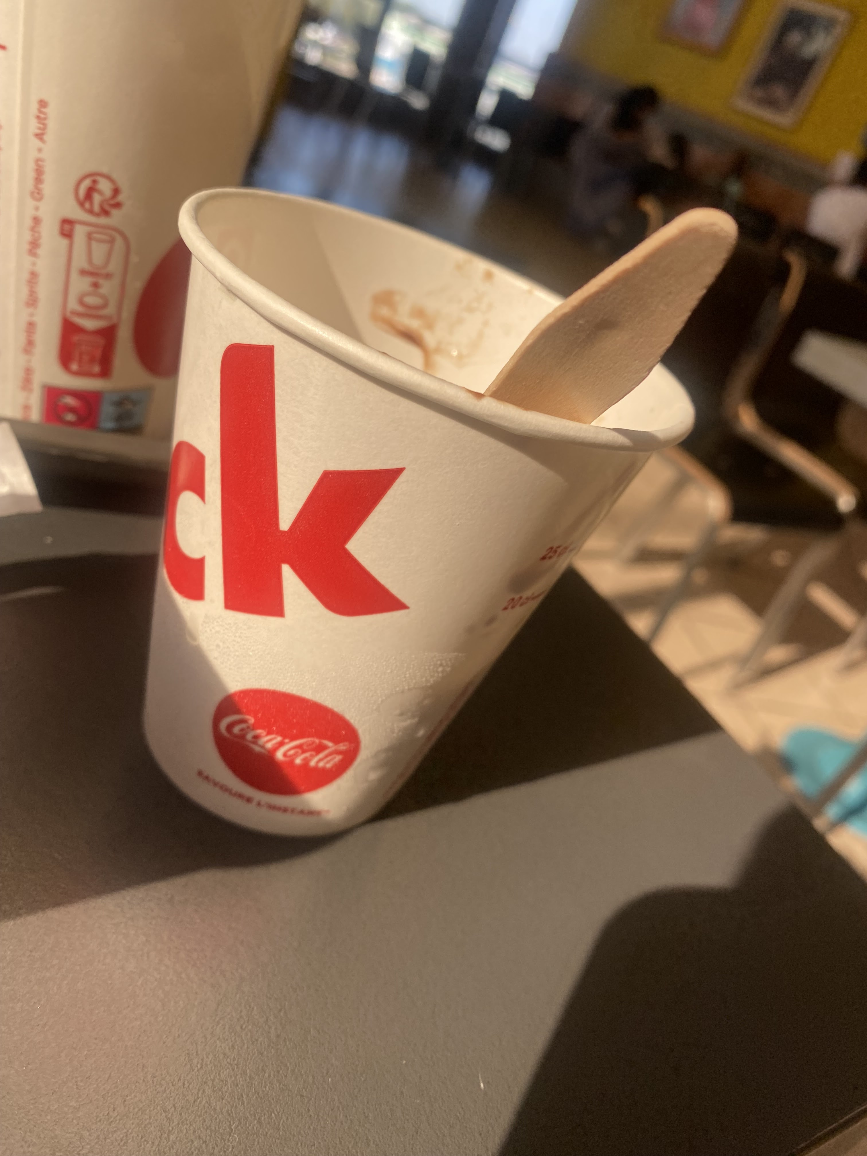 Frites froide, sandwich froid, couvercle de la glace enfoncé dans la glace, coca qui n’a pas le goût du coca. Menu XL mais ne voit aucune différence avec le menu normal. Sachant que ce n’était pas en plein rush, nous étions deux à attendre notre commande, il était 13h40.