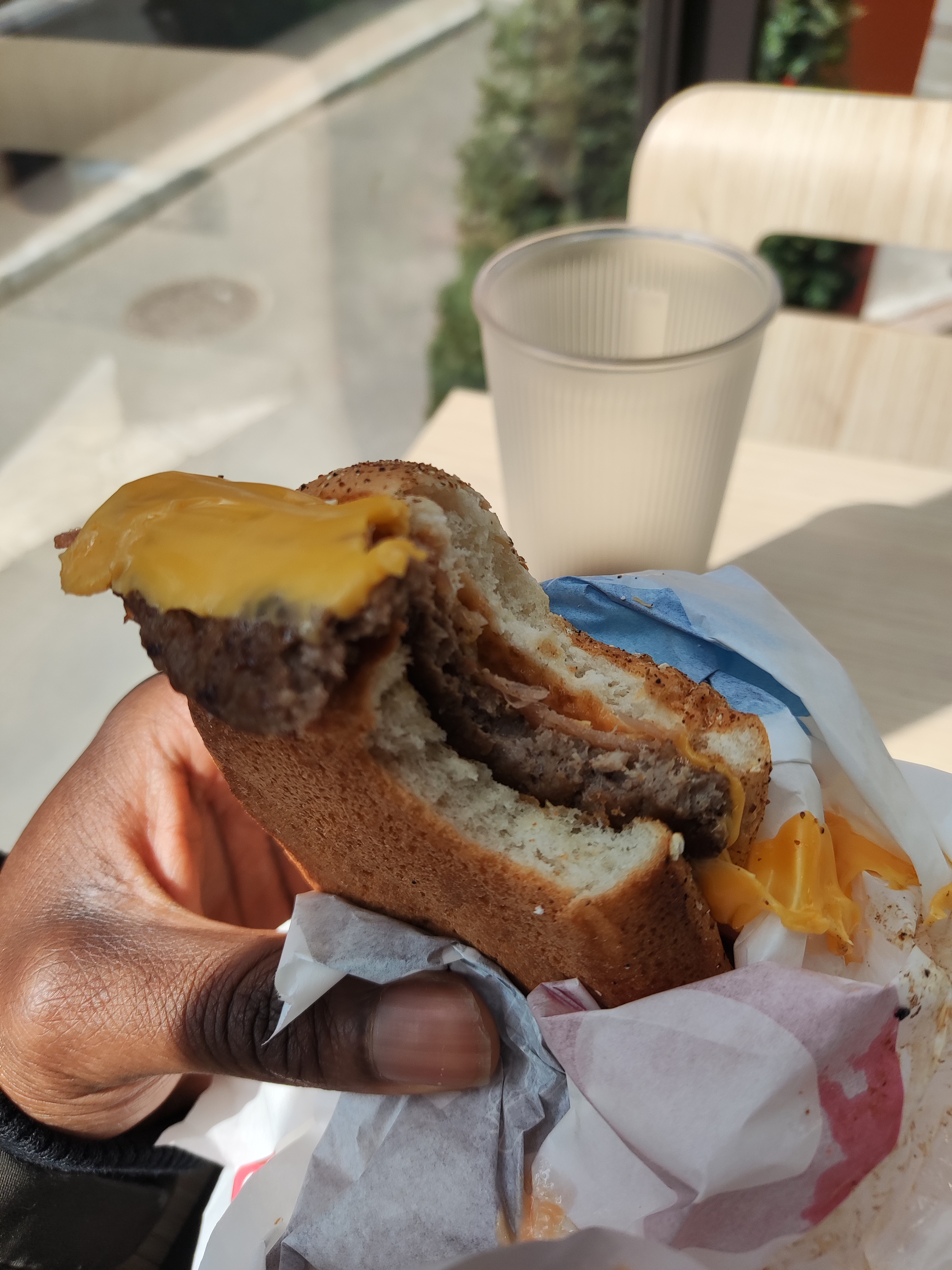 On est passé à une heure où il y avait très peu d'affluence du coup le service était rapide. On a voulu tester le nouveau menu à 5 euros carrément bon au boeuf et veggi malheureusement il n'y avait plus de poulet. Si vous avez un grand appétit vaut mieux prendre 2 menus sinon 1seul suffira la dose de frites est correct c'est une grande boisson et donuts ça passe un peu caoutchouté mais ca va. Le veggi est très bon et un peu plus nourrissant que le bœuf, steak du bœuf est extrêmement fin très peu de garniture dans les burgers. Mais pour le prix le menu est très intéressant et halal.