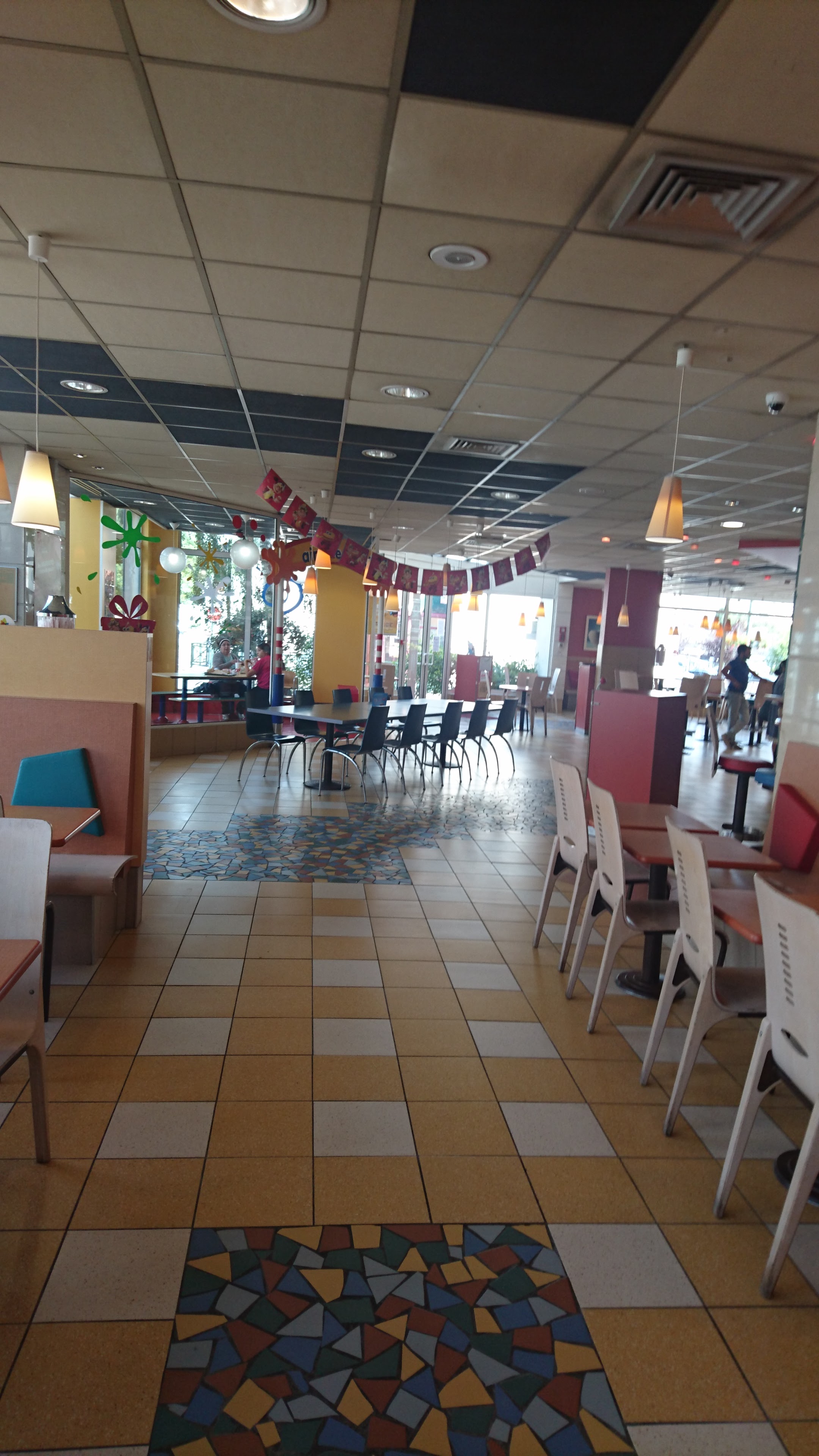 Les extérieurs peints en noir mais quelle horreur, on croirait plus avoir à faire avec les pompes funèbres qu'avec un fast-food.L'agencement de la salle dont les travaux sont terminés a été très mal pensé: pas assez de petites tables,le peu qu'il y a se trouve dans un espace trop réduit, trop confiné. Quant à la propreté des lieux,n'en parlons pas: les sols et les tables sont sales. Les poubelles débordent souvent et on ne sait plus où poser les plateaux sales. Les tables dont les sièges ont des coussins près d'une fenêtre sont dangereuses car non fixées au sol. Résultat: on peut basculer et tomber . Conclusion: il n'est guère motivant d'y aller.Le plaisir de venir n'est plus là.
