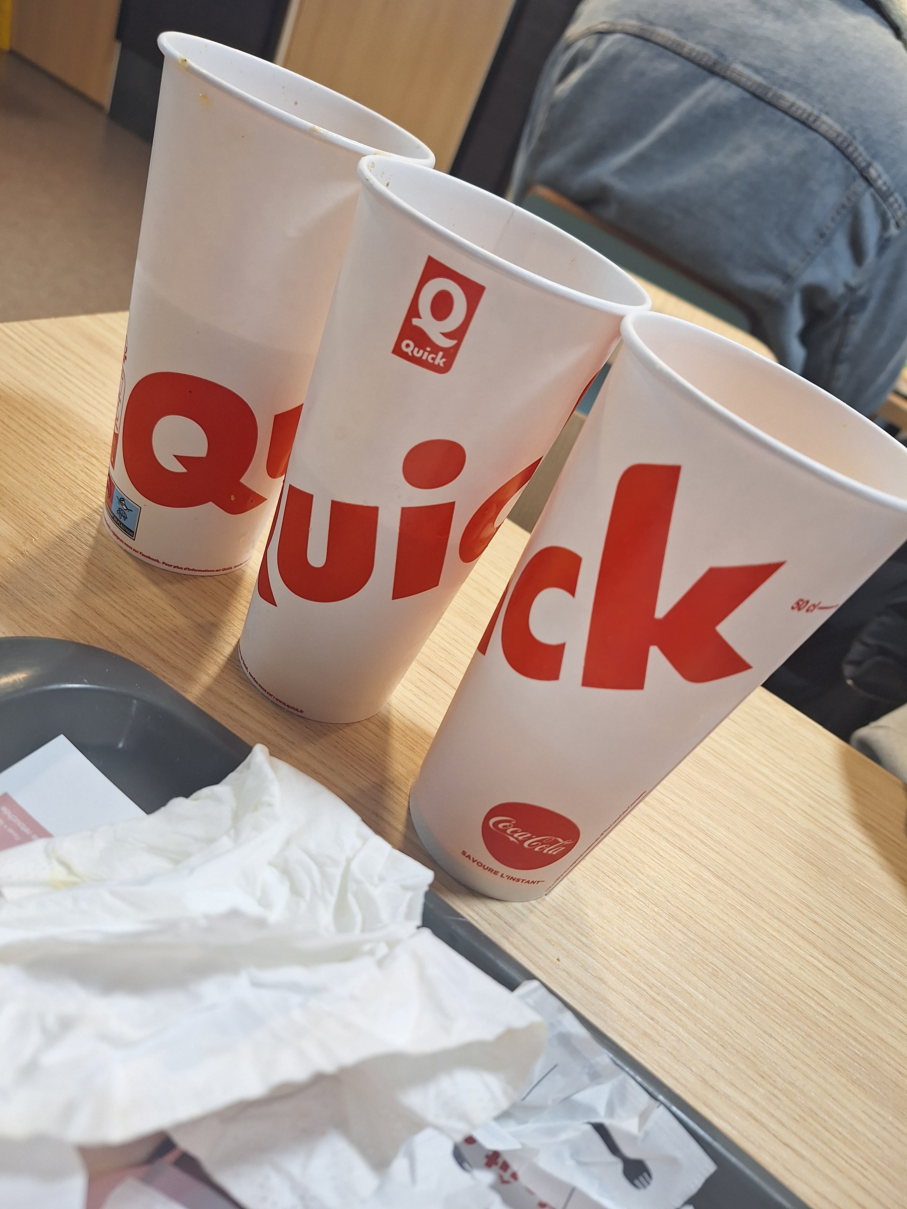 on commande un soir sur uber eats avec une commande de 45€ pour deux. deux menus et une boîte à partager à 16 balles. les burgers étaient tout aussi fade que minuscule, on a pris un au bœuf tout sec accompagné de sa tranche de bacon au poulet à peine perceptible. les frites dans un petit sachet tellement petit que même dans un menu enfant y’en a plus. et pour finir les boissons étaient divisé en deux dans des petits récipients (j’ai pas compris le délire) bien sûr celles-ci à moitié renversées dans le fond du sac et sans glaçons (alors que c’était indiqué d’en mettre), le coca avec le goût du plastique compréhensible vu la tête de l’emballage. bref on a voulu tester Quick car ça faisait longtemps et bah on verra dans 10 ans si ça a évolué