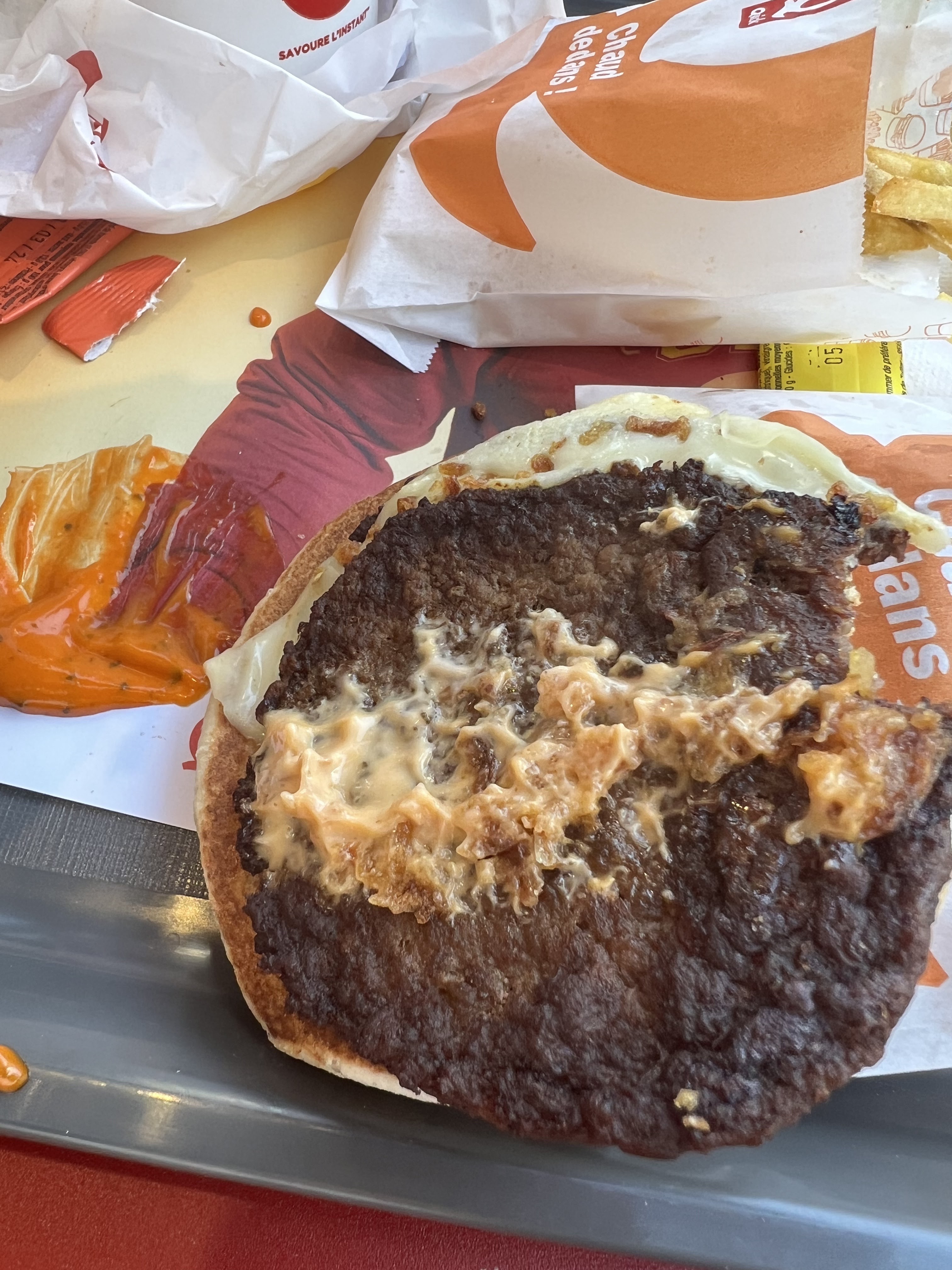 Assez déçu de cette enseigne qui fait soit disant un retour en force. Force c’est le cas de le dire, car vos nuggets sont dure comme dû bétons et vos steak le sont tout aussi secs, sans parler du fromage qui ressemble à une rustine. Un bel ensemble pour des travaux de rénovation. J’espère que vous n’avez pas rénover avec ces ingrédients. Je ne savais pas que c’était une boutique de bricolage. De plus ma boisson était mal fermée donc à coulée au fond du sac (merci pour les frites imbibées de Sprite) Heureusement qu’il y a le mcdo juste à côté où là nous ne sommes jamais déçu. Je ne suis certes que un client parmi tant d’autres et un avis parmi tant d’autres mais première et dernière fois chez vous. Seul point positif, l’amabilité du jeune homme à l’entrée et de la dame blonde en chemise bleue qui est très pétillante.