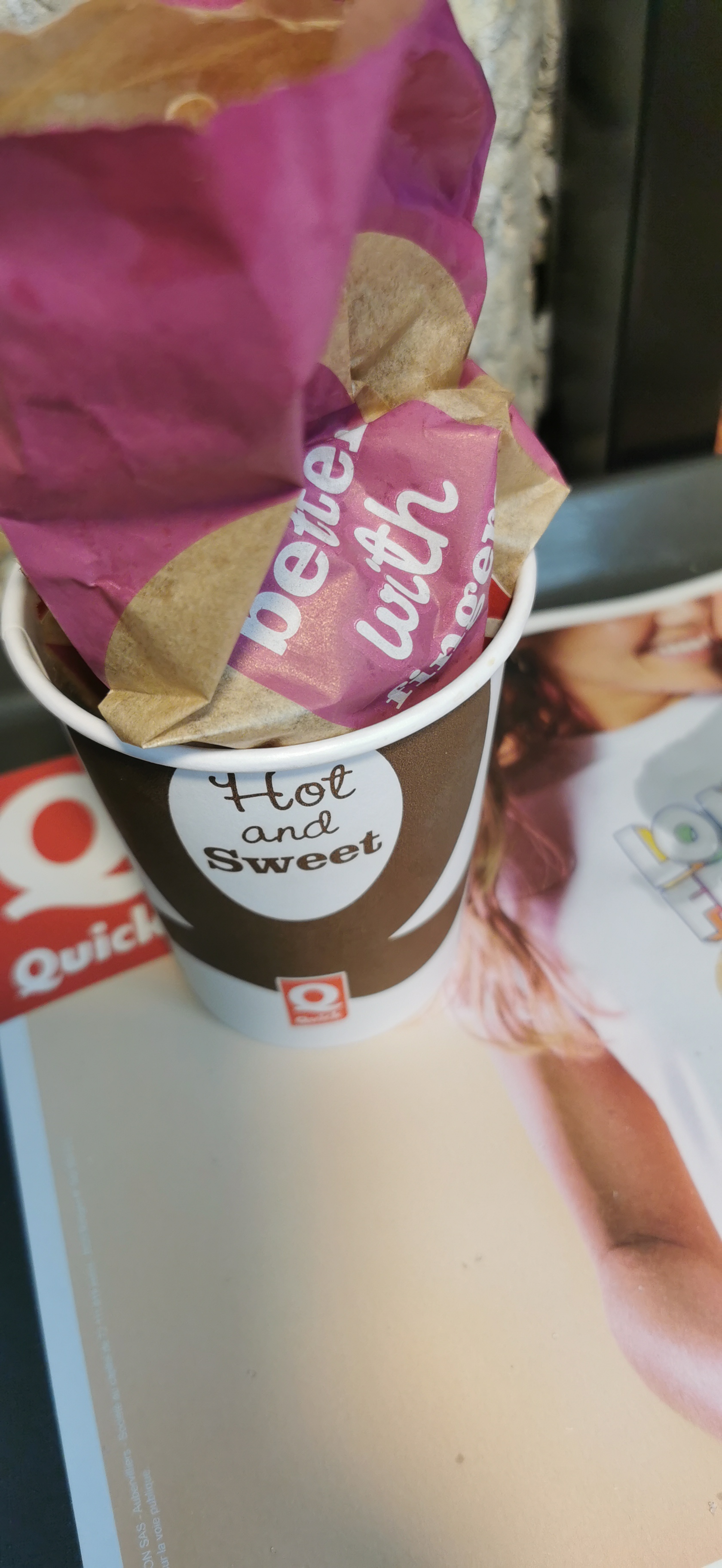 Retour pourris nourriture infecte churros crû a l'intérieur elle avait un goût de vielle huile usagé sucre glace en morceaux du jamais vu pour du sucre glace frite trop cuite et froid en faite tout était mauvais franchement c'était largement mieux a l'époque je retournerai plus jamais a Quick 😕😕