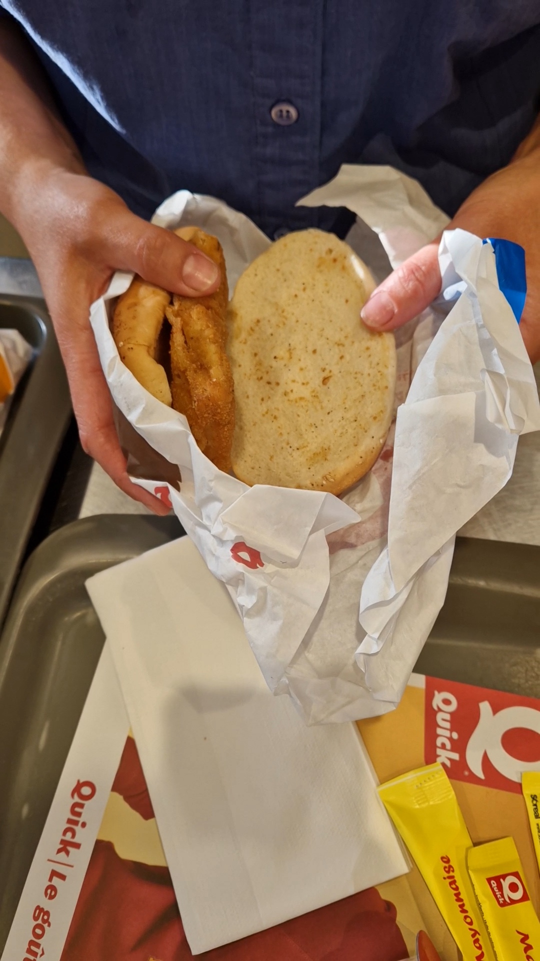 Très déçu , certe travail à la chaîne , chaque fois que je vais dans ce Quick il manque toujours quelque chose . Et le vendeur déterminer quand on lui demande il m’a manque rien ? Non monsieur il y’a tout . Donc à chaque fois benefice pour eux ils ont pas mit le menu à ma femme . Fini je retourne plus et hygiène laisse à désirer