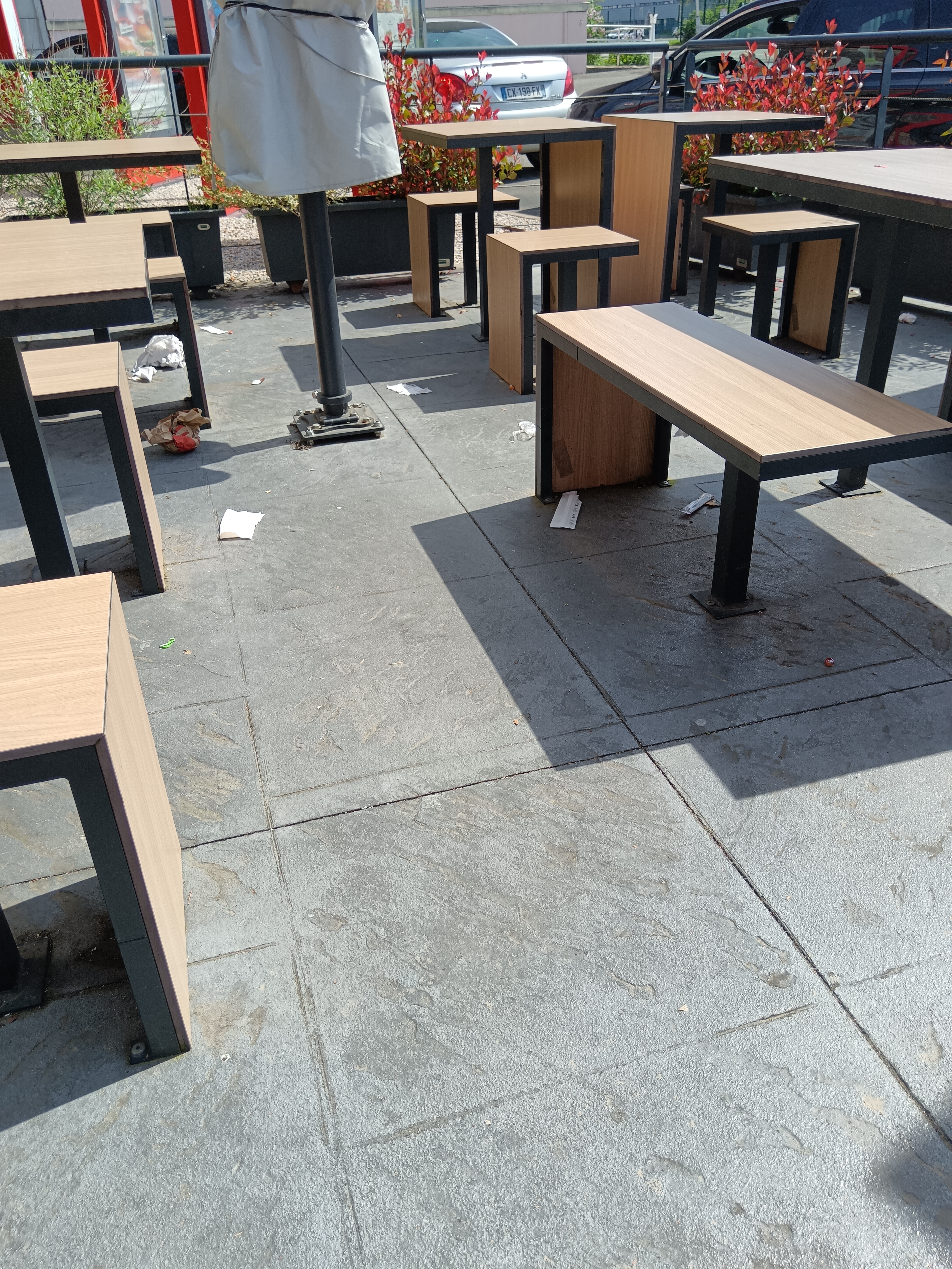 Attente trop longue poubelles qui déborde, frites écrasés par terre, aucun nettoyage, employé qui n'arrive pas à suivre à éviter. Pas clim et pas de toilettes également.