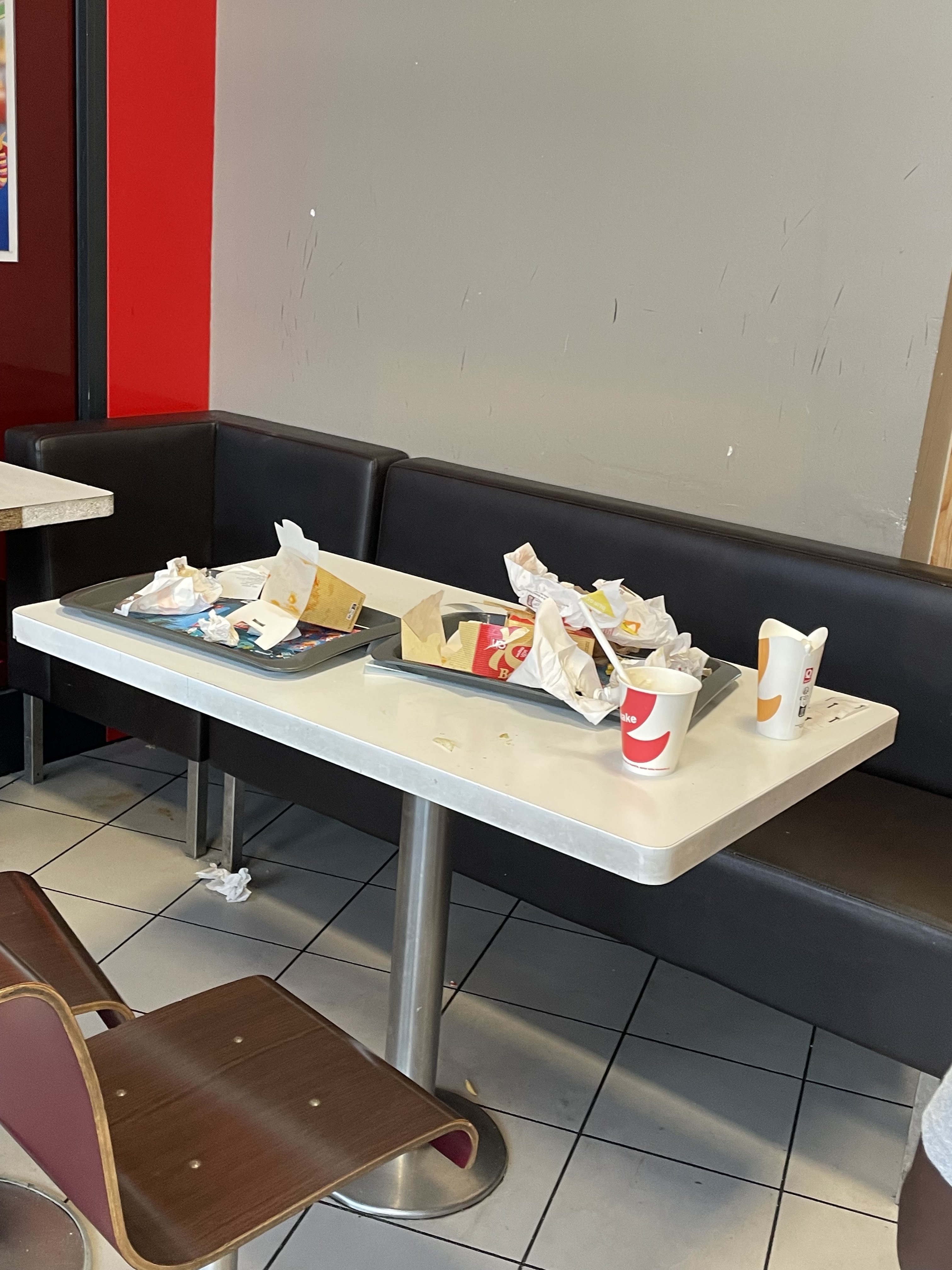 Arrivée tardive (13h30) un dimanche Très peu de monde, emplacement difficile à trouver. Je ne comprends pas pourquoi il n'est pas possible de vider son plateau soi-même... Des armoires avec des plateaux pleins de déchets qui volent avec le vent. Pas de tri... Et aucun emballage durable...