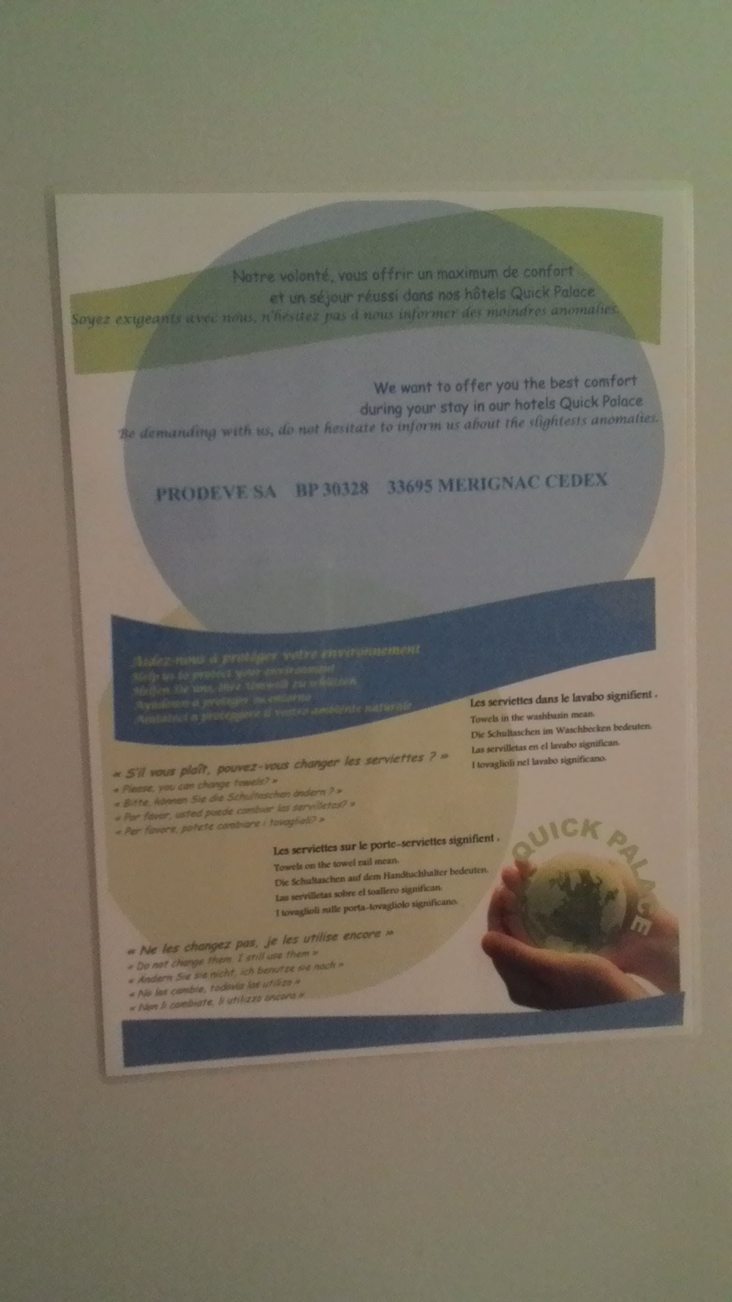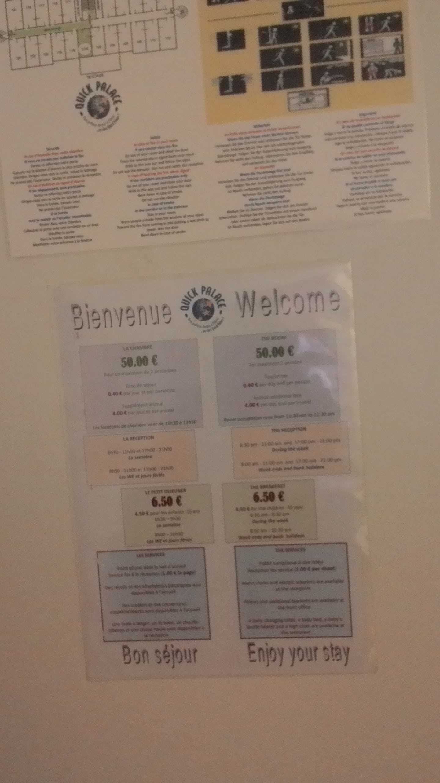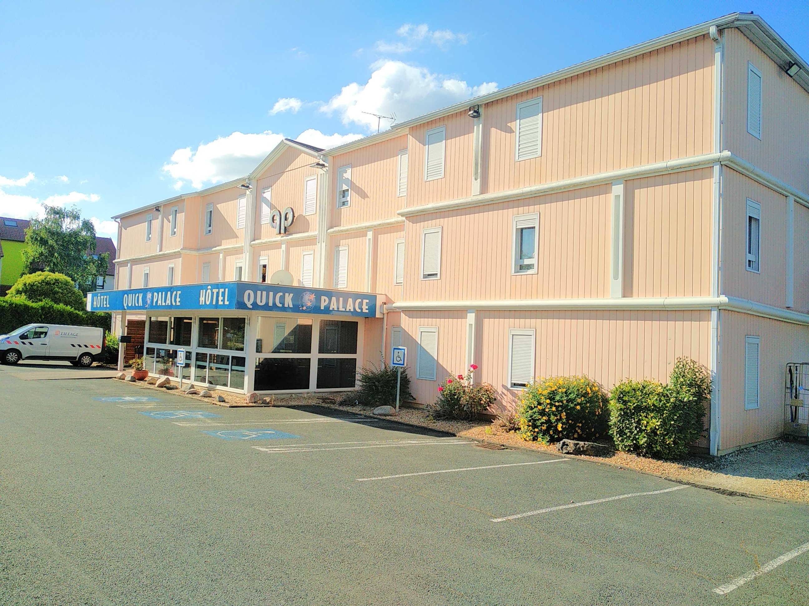 Je mets trois uniquement car j’ai étais nourrie et logée mais sinon le reste n’a rien avoir avec un hôtel surtout renommer « palace ». un hôtel est fait pour dormir, j’ai fais une nuit blanche avec 45 degrés (pas de clim). Nous avons trouvé trois grosses araignées vivantes et morte collé au mur, une grosse toile d’araignée collée à la tringles du rideau, volet qui s’ouvre mais qui ne se ferme pas, fenêtre qui s’ouvre mais il faut être vigilant que rien ne rentre. Dans la salle bain: des poils et des cotons usagés par terre, chasse d’eau des toilettes qui reste bloquée pendant 1/2h, pas de rideau de douche qui sont donc collées aux wc (sans parler des toilettes de l’accueil remplies d’araignées, ma plus grande phobie) Les murs sont si fin qu’on entend tout ce qu’il se passe à l’étage. Vous serez accueilli dans votre chambre par de grosses tâches de je-ne-sais-quoi sur la moquette et un lit qui n’est d’autre que des draps empilés sur une planche de bois! Draps sales bien sûr! Avec des moustiques morts sous le coussin et des taches jaunes sur les couvertures. Pour le prix même un motel est 10 Fois mieux que ça. De plus il y avait une attraction nommée «objectif mars » qui était bloquée toute la journée et les responsables de cette attraction nous demandait d’aller voir leurs collègues pour savoir quand elle réouvrira comme si ils connaissaient mieux l’attraction que eux! intolérable + les pouf mouillés alors imaginez ma tête en rentrant à l’hôtel pour au final passer une nuit blanche! j’ai mieux dormi dans ma voiture que dans cet hotel ! A fuir! Sauf si il est refait de A à Z Le «Quick» à sa place au nom de l’enseigne car cet hôtel mérite autant d’être fermé que cette chaîne de fast-food! Au plaisir de ne jamais y remettre les pieds!!