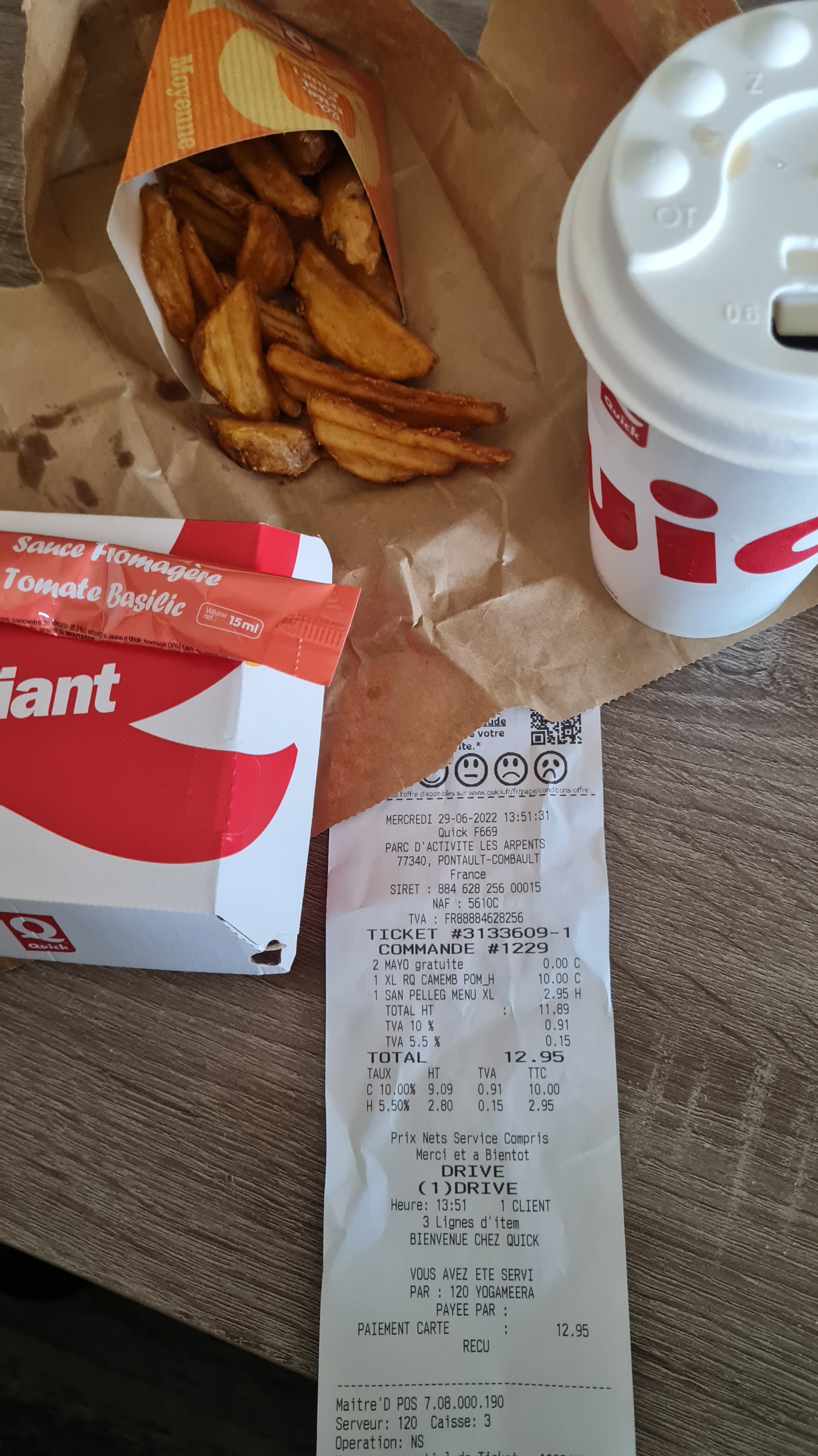 Régulièrement de passage, je prends les repas pour la famille dans ce quick. Cette fois s'en est trop !!! A plusieurs reprises ils ont oublié les yop des enfants mais à chaque fois impossible de faire demi tour car j'ai déjà repris la route lorsque je m'en aperçois. De nouveau de passage on s'arrête. J'ai attendu plus d'une demie avant de me manifester ai comptoir car je voyais tout le monde défiler devant moi et mon numéro n'était pas appelé. J'ai demandé si ma commande n'avait pas été oublié on m'a répondu que j'avais déjà été servie ce qui était faux. La jeune femme s'est excusée et a préparé ma commande en 5 min. Résultat, .... des chiken dips au lieu de fish and dips ( évidemment les enfants n'aiment pas) et un menu payé 12.90 € pour sans frites !!! Numéro de commande 1549