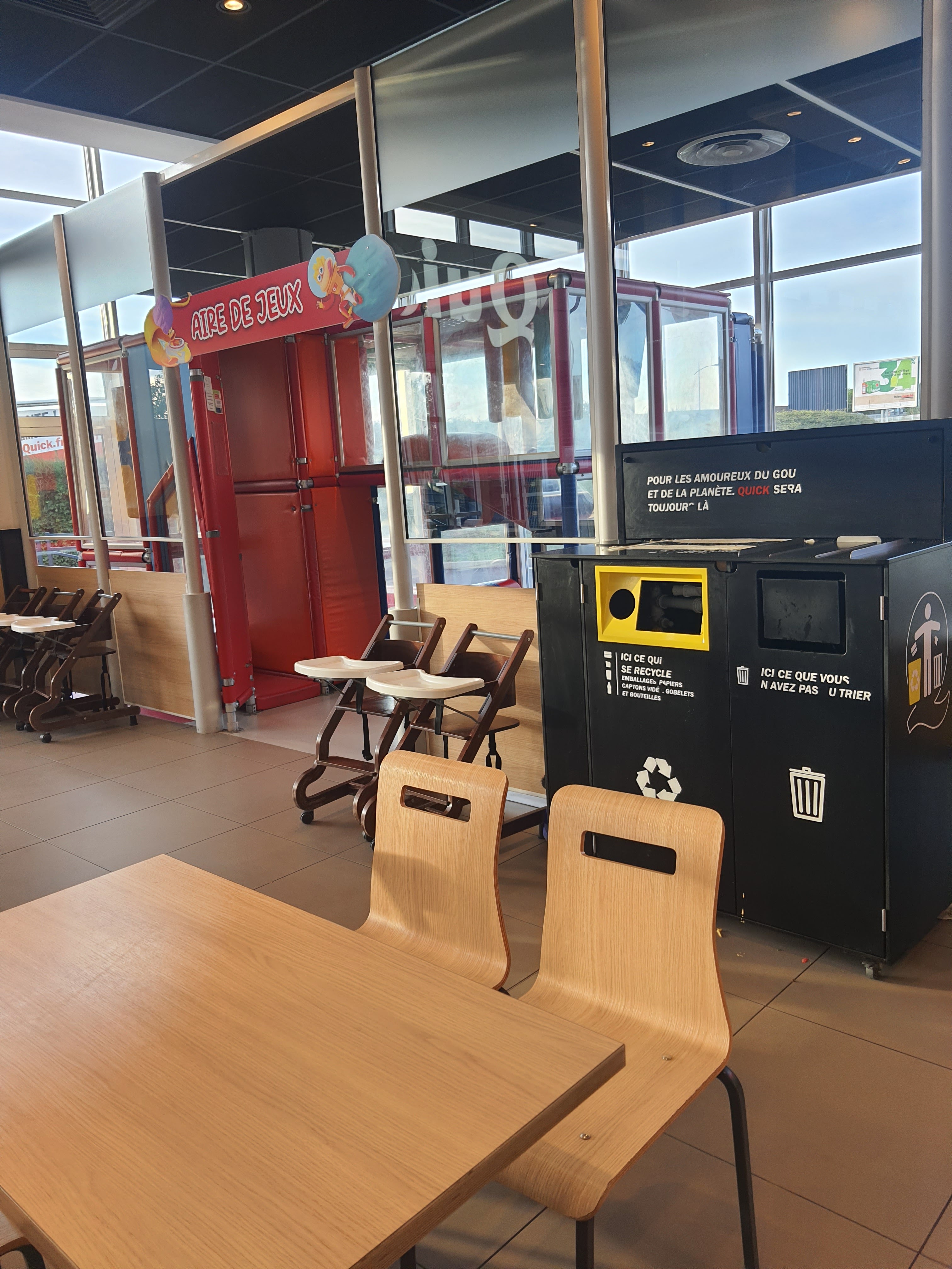 Ravie d'avoir un quick aux alentours car certains sandwiches sont uniques ! Restaurant de taille correcte avec plusieurs types d'assises (chaises, chaises hautes, fauteuils). Coin anniversaire, 2 structures jeux pour les enfants (1 intérieur, 1 extérieur). Prise de commande sur borne, attente rapide, mais vérifiez bien votre commande, il se glisse parfois des erreurs.