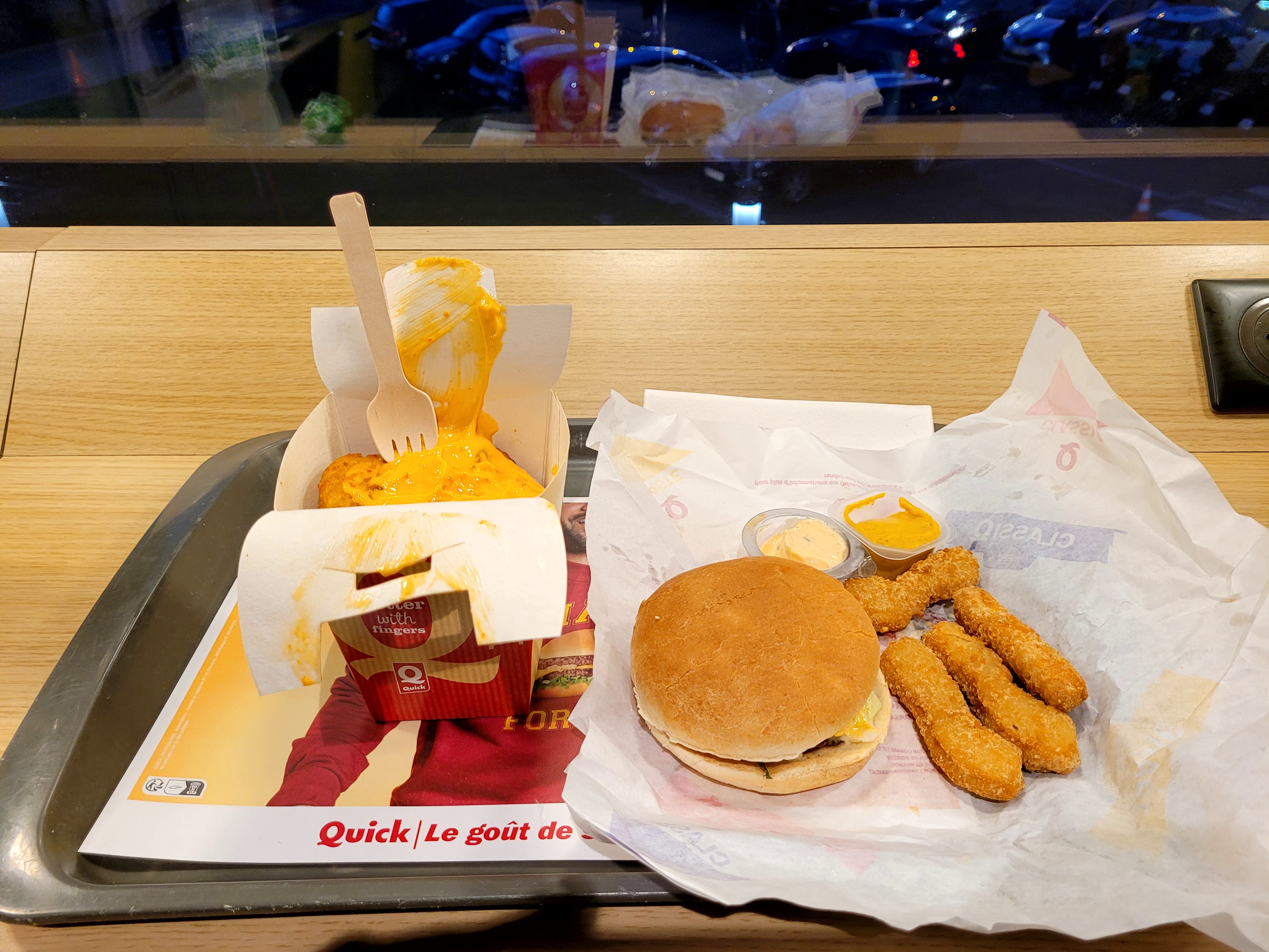 Pains secs comme la mort. Viande trop cuite. Fromage pas fondu. Sandwichs tièdes. (« Grandes ») Frites en quantité misérable. Coca à peine frais et sans la moindre bulle. On s’attend pas à du haut de gamme en venant chez Quick, mais il y a un minimum de qualité à assurer, surtout au vu des prix en augmentation constante. Allez chez les chaînes (halal) concurrentes. Quitte à acheter de la malbouffe vous aurez au moins un repas chaud, moins cher et servi en quantité correcte.