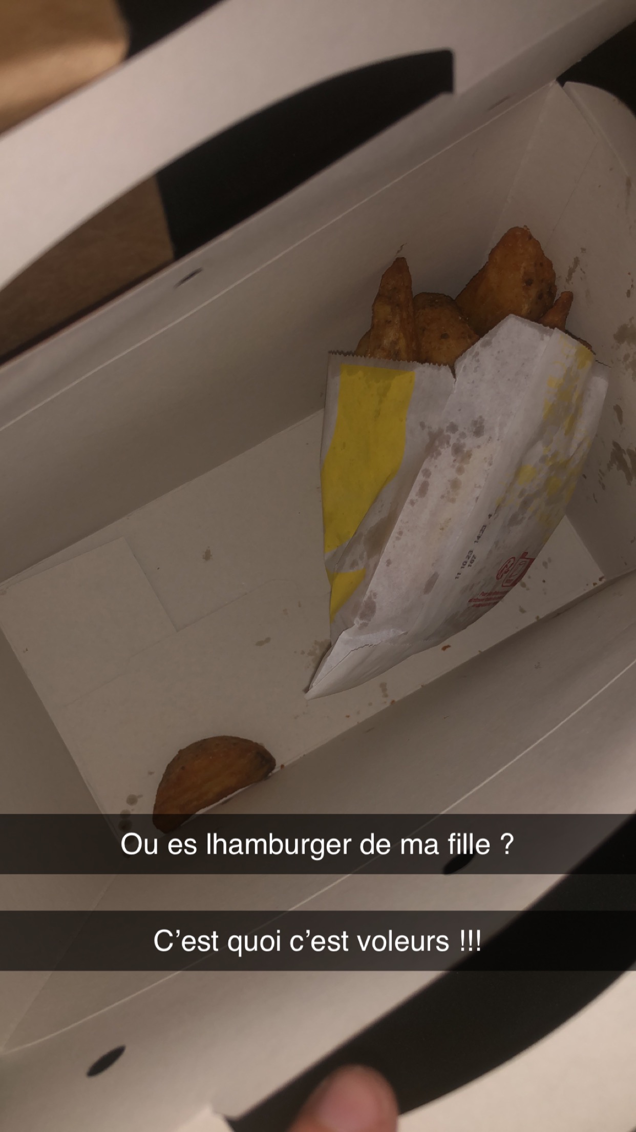 Je vais faire très court, car les photos en disent long. Est ce normal ? De payer des menus et d'avoir que ça comme frites ? À oui, quick ne savent pas assumer ils mettent donc la faute ( en message privée ) sur Uber eat qui eux non rien avoir car c'est quick qui ferme le paquet non pas Uber eat.