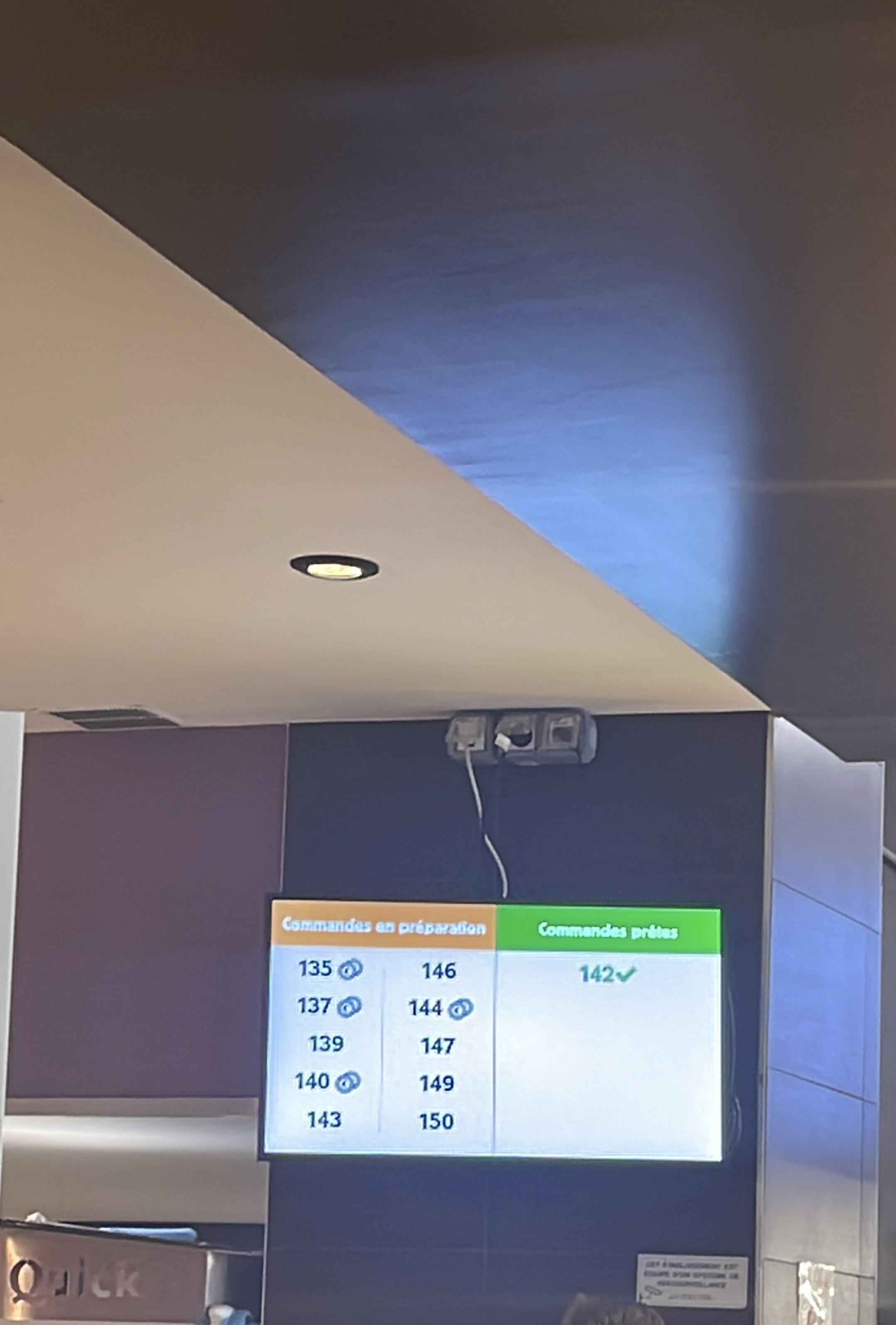 Déjà on attend notre commande on doit attendre car il recommence à l'envers il on oublié les grandes frites,il on mis un softy vanille au lieu de chocolat