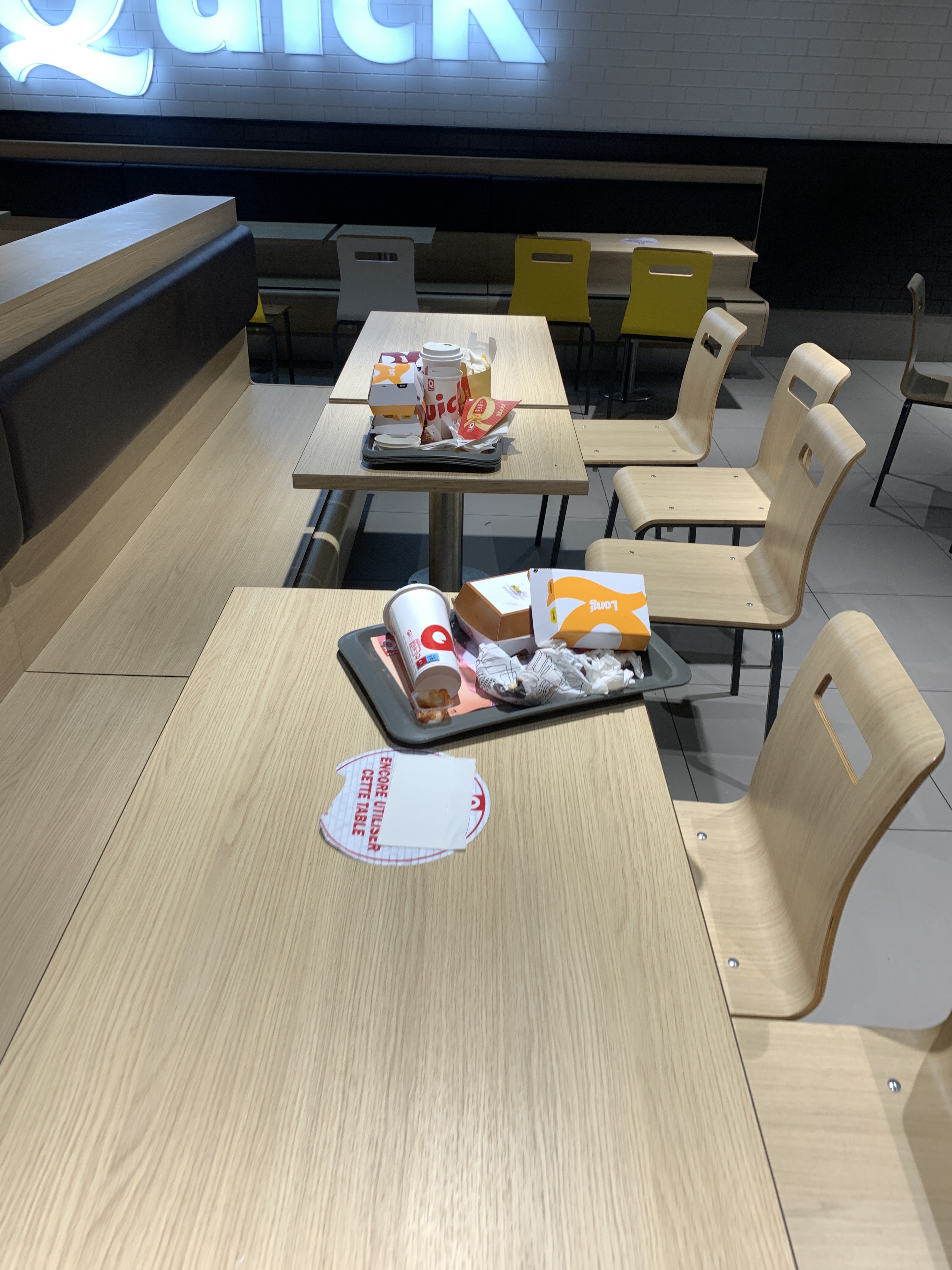 Nous sommes allés manger à l’étage… Un dépotoir ! Le sol est collant, 7 ou 8 plateaux remplis de déchets étaient empilés et semblaient être là depuis un moment, les chaises sont éparpillées, de la boisson au sol… Bref, nous n’avons pas eu l’impression que la propreté des lieux était une priorité ! L’état du sol à l’entrée était aussi inacceptable et les traces de pas avaient l’air d’être là depuis longtemps également. J’espère que ce laxisme au niveau de l’hygiène des lieux sera revu… Point positif, l’accueil était relativement bon, la caissière avait le sourire ! Un fidèle de Quick !