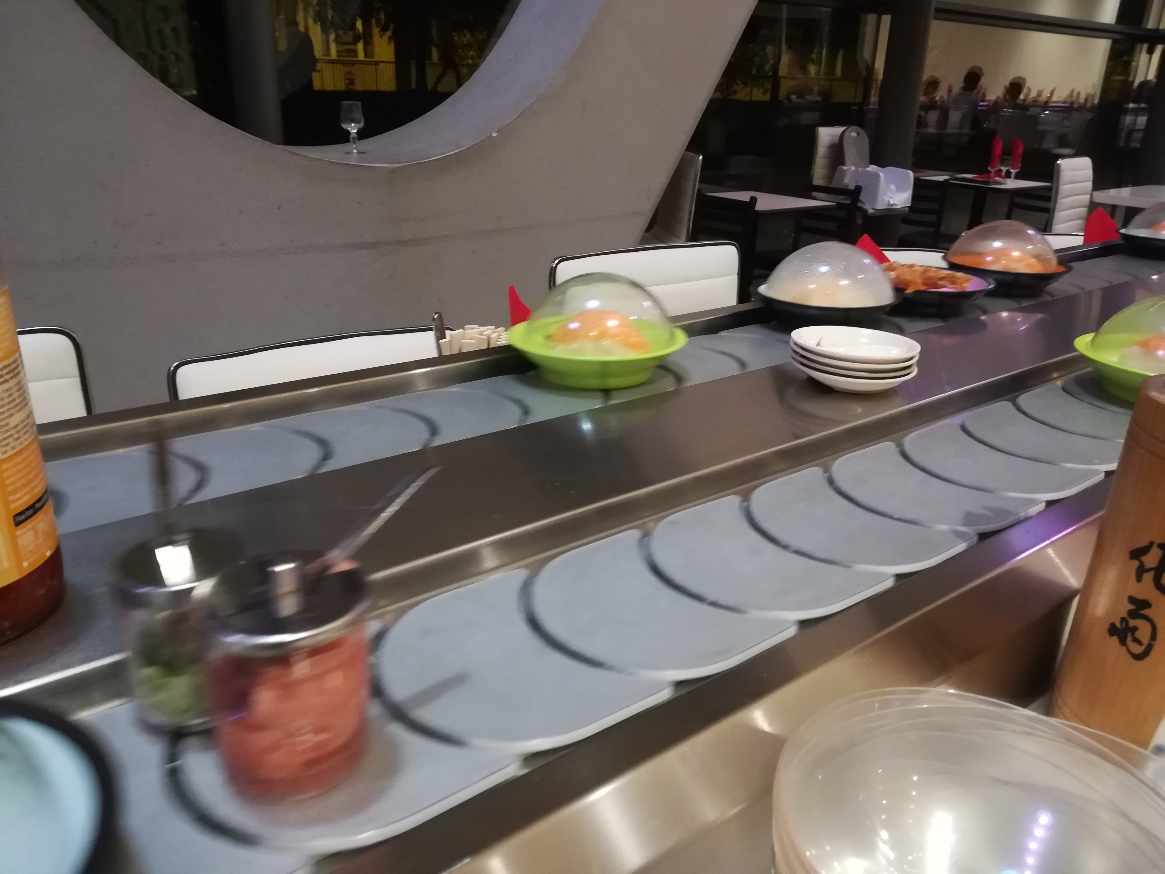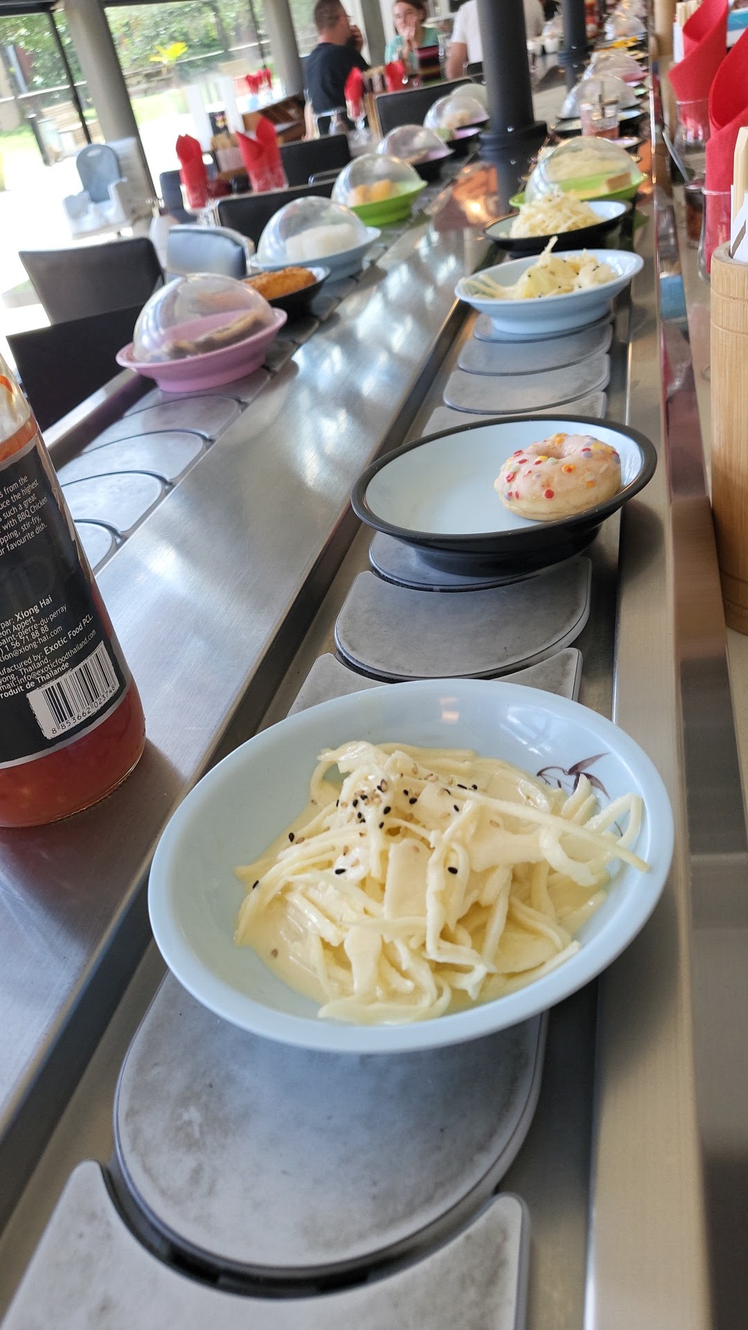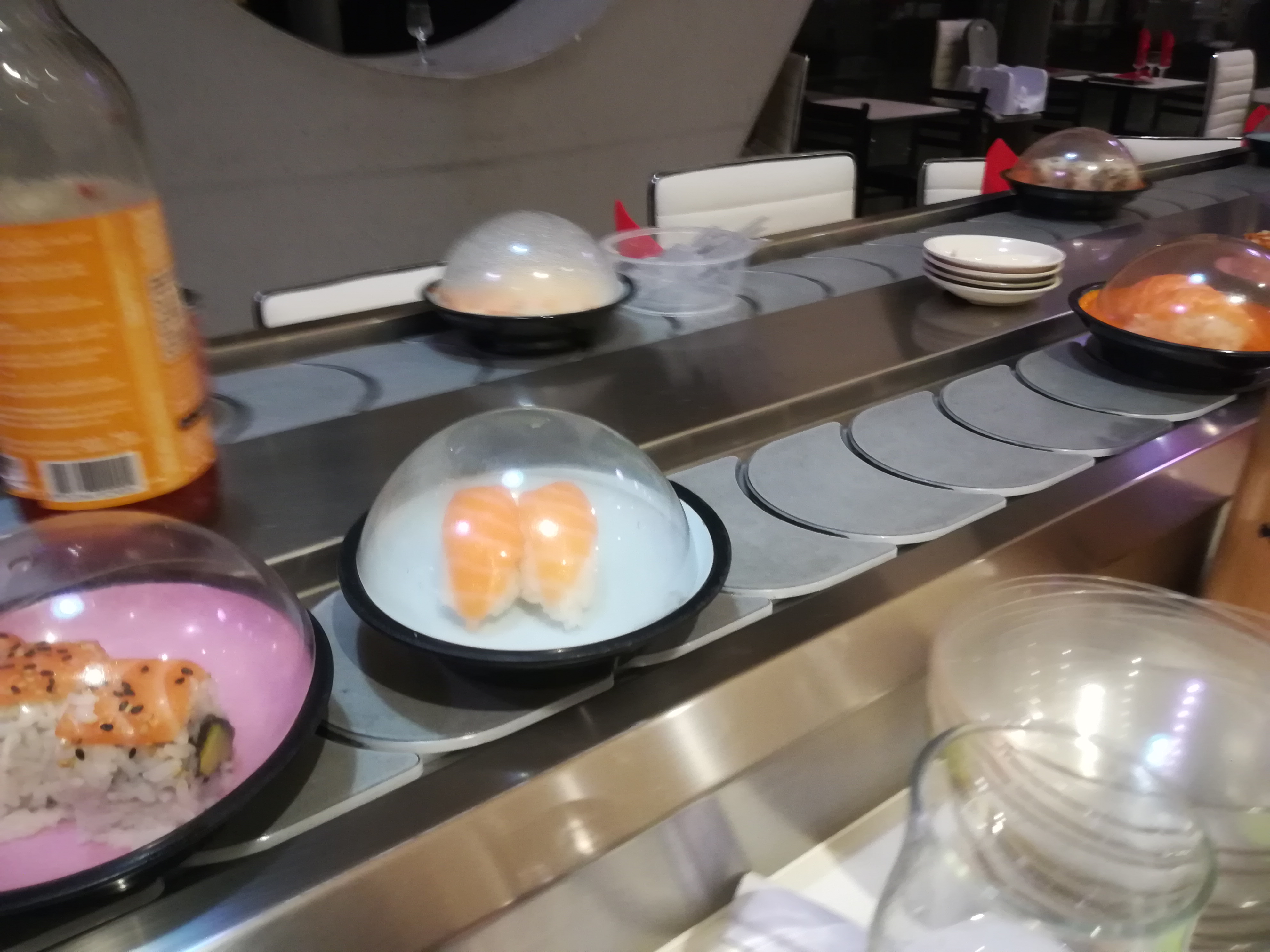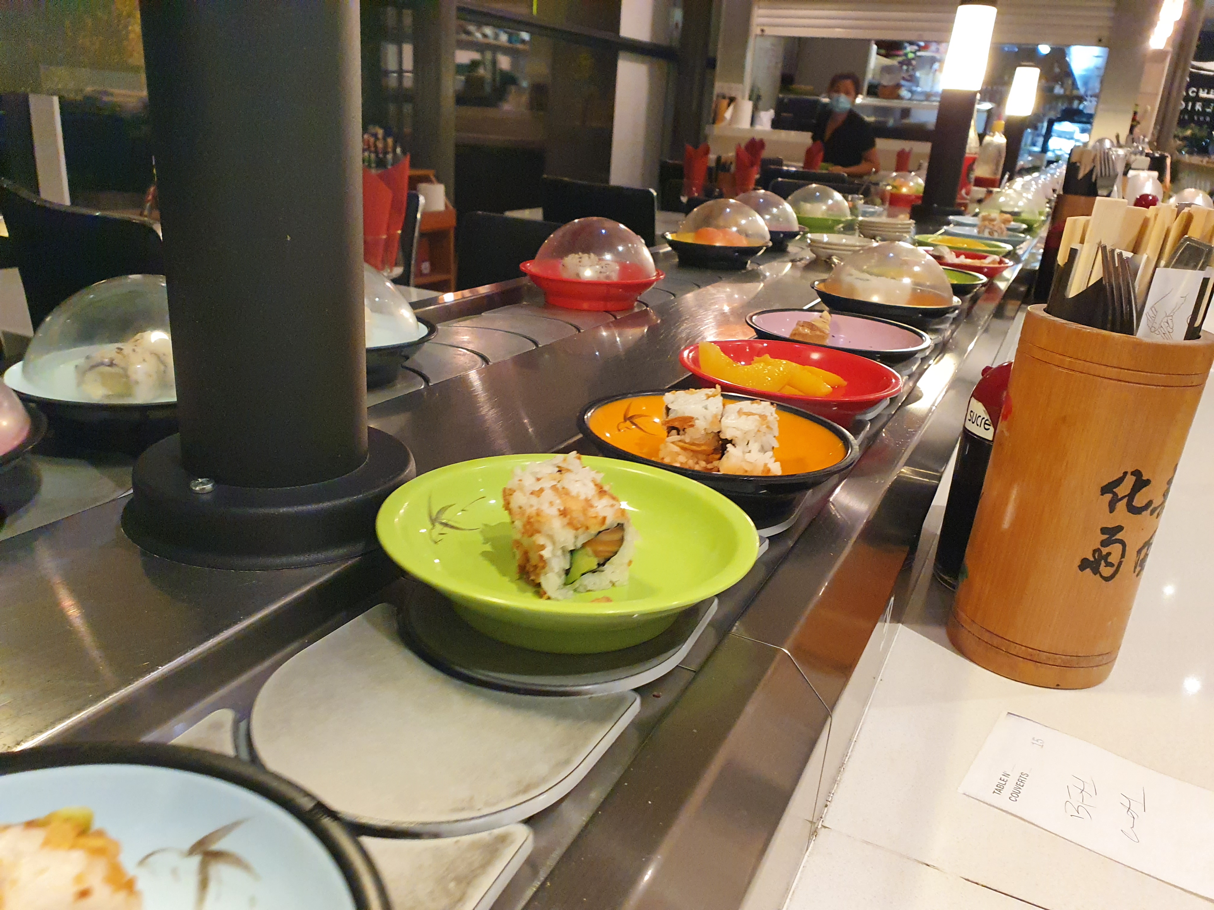 Il n'est pas mal le concept du tapis roulant avec la nourriture à volonté. Il y a des assiettes sans et avec couvercle.