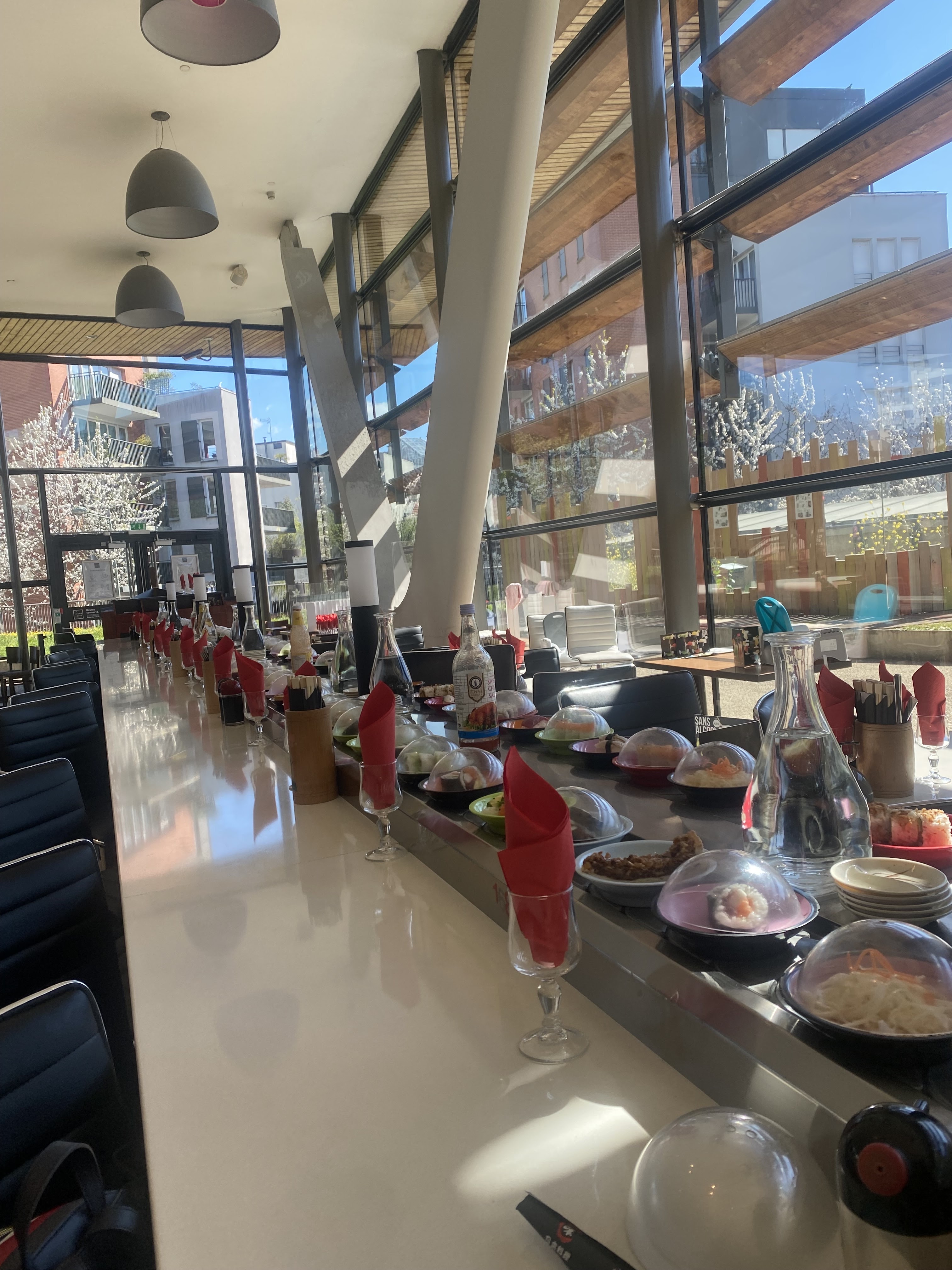 Pas de possibilité de choisir sa place à table alors que nous n étions plus dans la période du rush. On nous a imposé les places en comptoir , et pas forcément de façon très sympathique. Niveau repas les plats sont plutôt bons même si certains reviennent peu voire pas sur le tapis roulant.