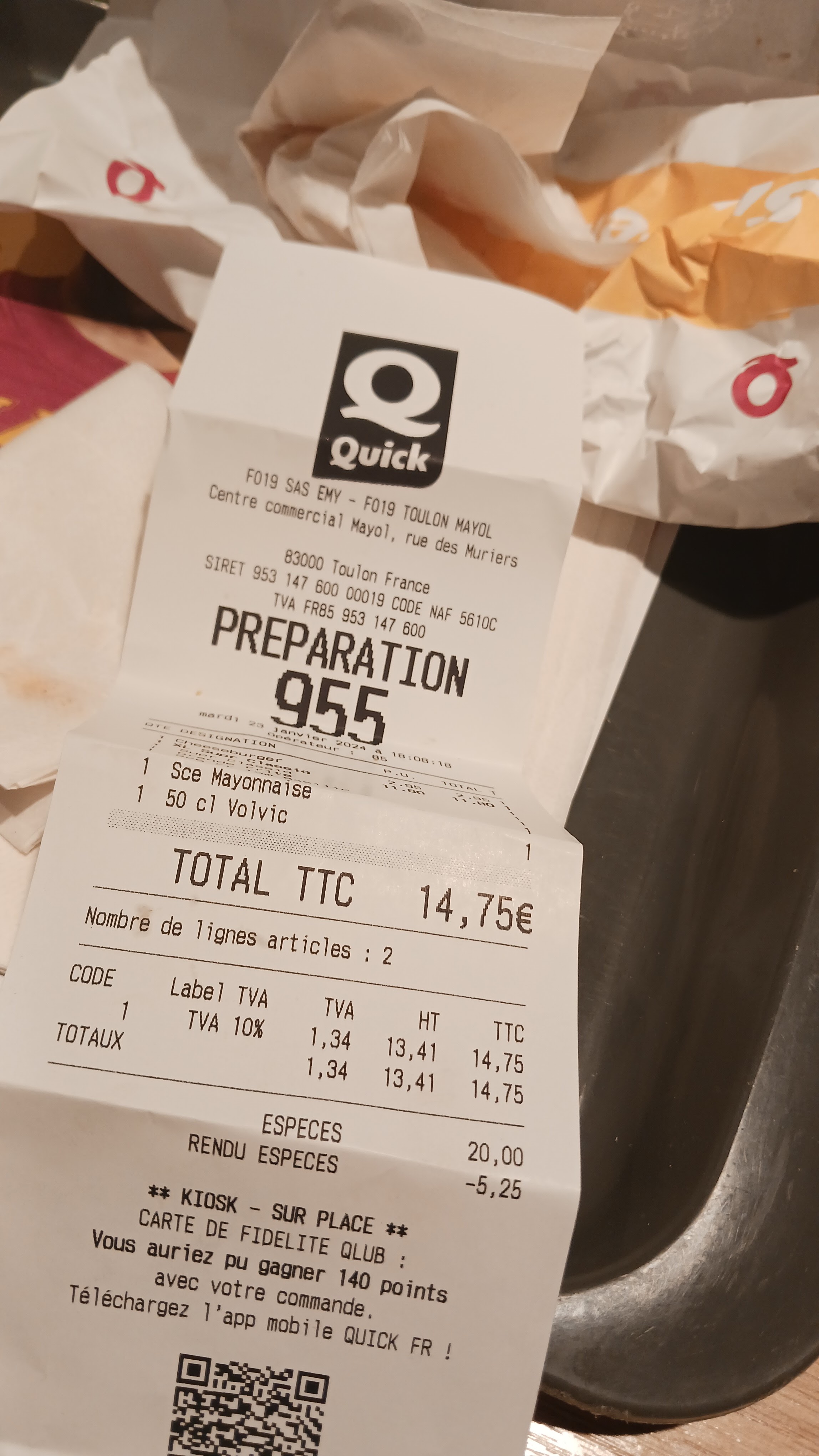 Aucune civilité de la part de certaines personnes dans la fille d’attente ; 25 minutes de d’attente avant la prise de commande à la borne puis a nouveau 25 minutes pour être servi ; Personnel agréable mais débordée ; Commande non respectée, manquait 1 burger, le wrap veggie inversé avec un wrap poulet bacon, +1 frite ; Je n’ai pas vérifié la commande sur place car je discutais avec la manager qui me servait alors la déception en rentrant fût elle que je ne renouvellerai pas l’expérience dans ce Quick.