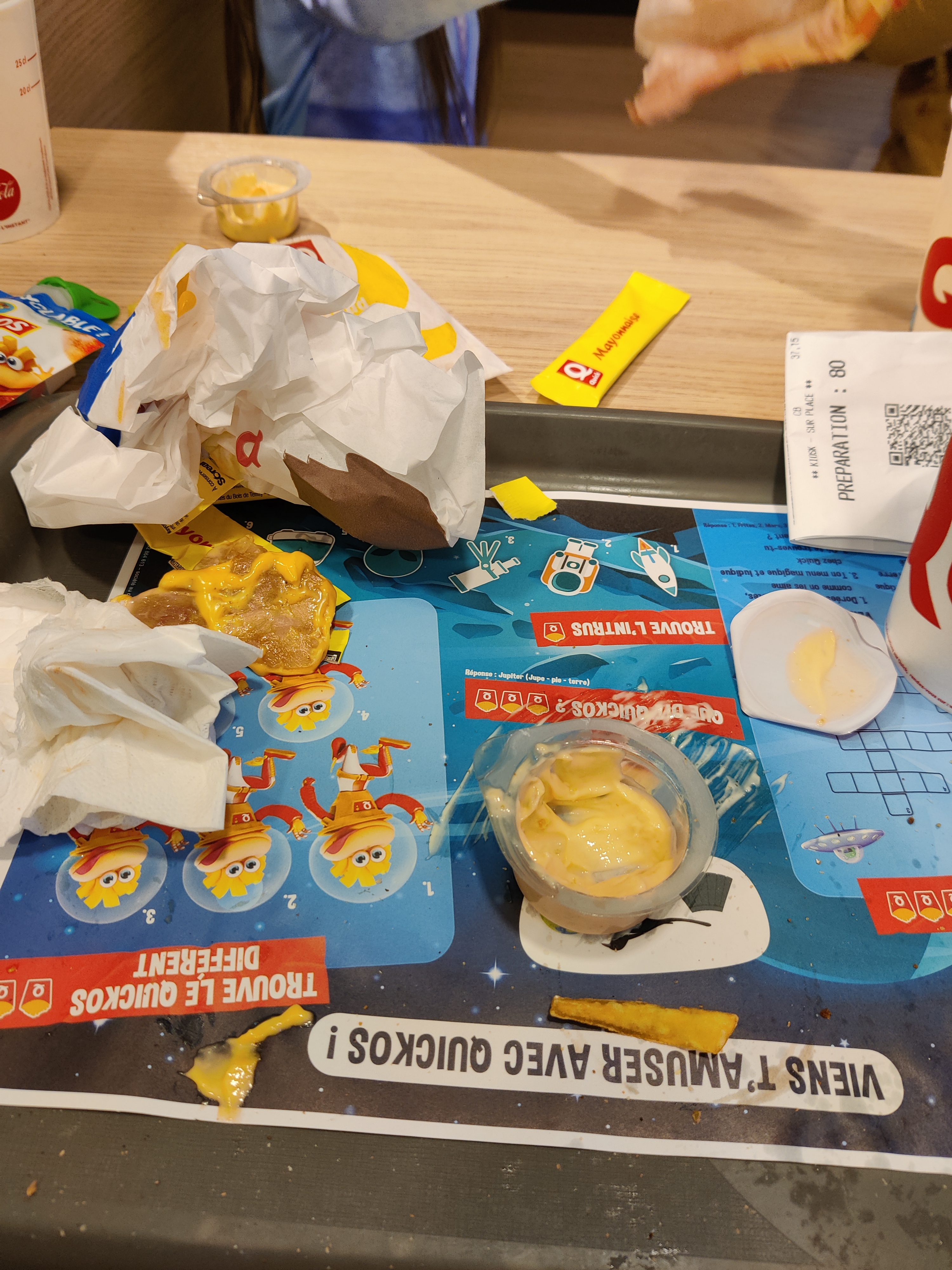 Frite jamais cuite ,boisson sans goût autant prendre de l'eau,le bacon de poulet de plus en plus fade,oubliede sauce dans hamburger... Pas de serviettes Personnel moue Oublie dans les commandes Dommage quick