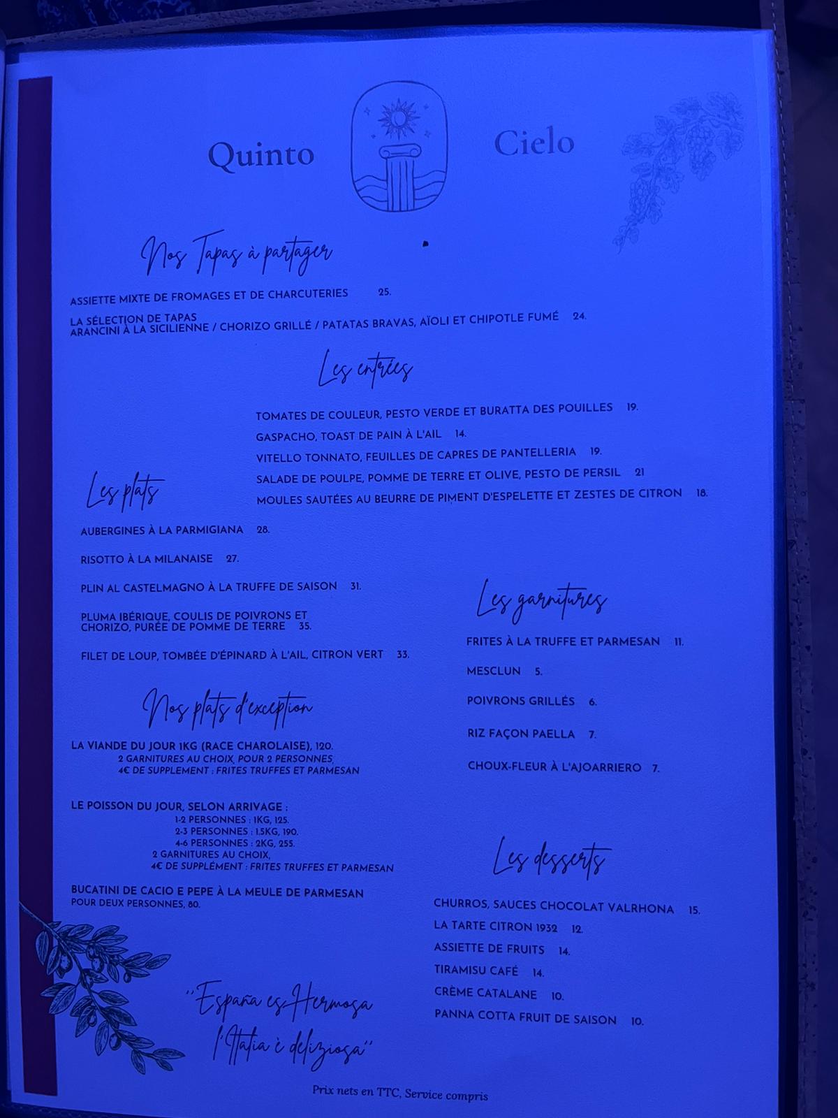 Le Quinto Cielo possède une vue panoramique sur la baie grâce à cette terrasse rooftop exceptionnelle ! 🤩 Le service est de qualité, abordable et sympathique. Nous avons dégusté une pluma de porc ibérique, excellente !😋😋 Suivi d une tiramisu fait maison devant nous.. à tomber. A découvrir