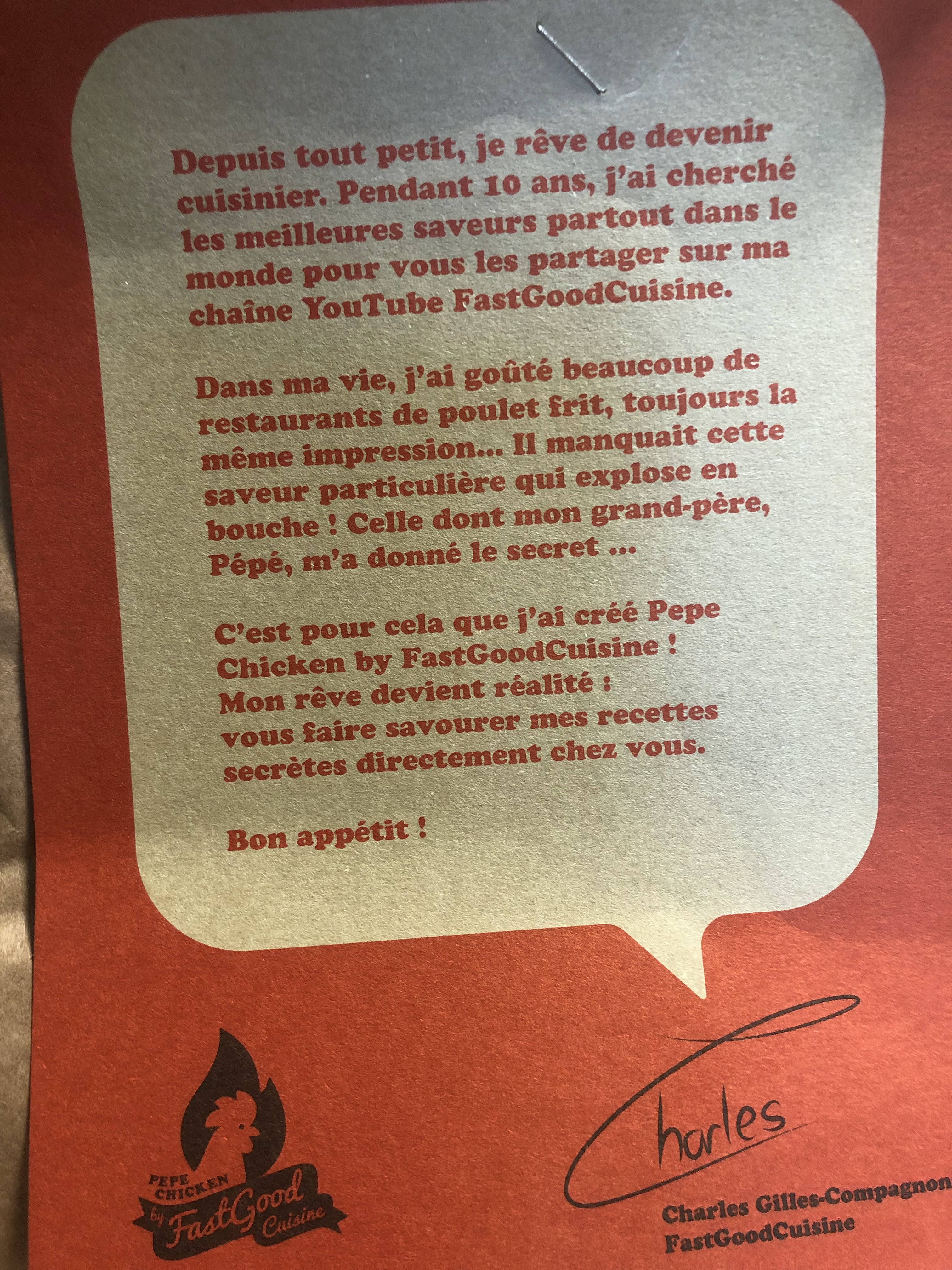 Tout d’abord l’emballage est très bien fait & pratique, les frites «waffles » sont très bonne,le poulet et le burger très bon et bien épicé 🌶. Grosse surprise sur la sauce verte qui est Excellente.☘️ Au final très bon, au dessus en terme de qualité de la grosse chaîne concurrente de poulet frit, mais le prix reste trop élevé malheureusement. Attention commande uniquement en livraison via Uber/Deliveroo ( dark kitchen)